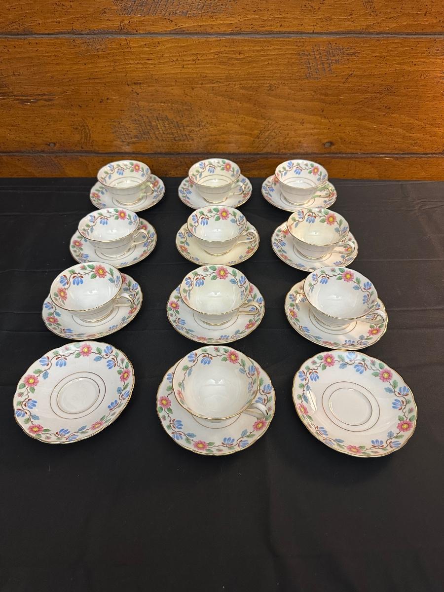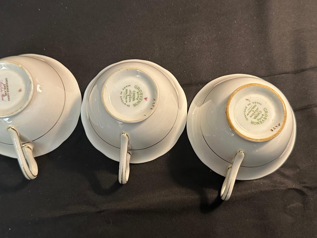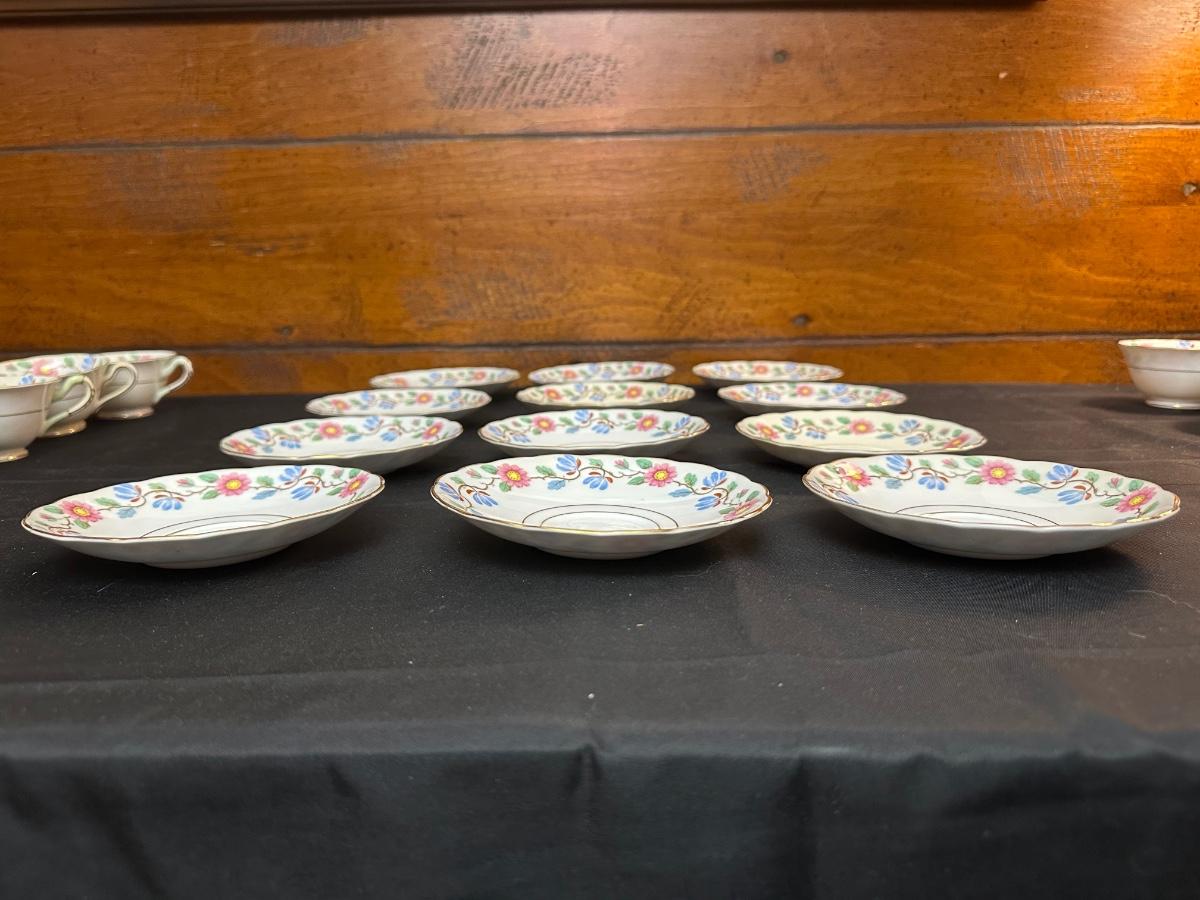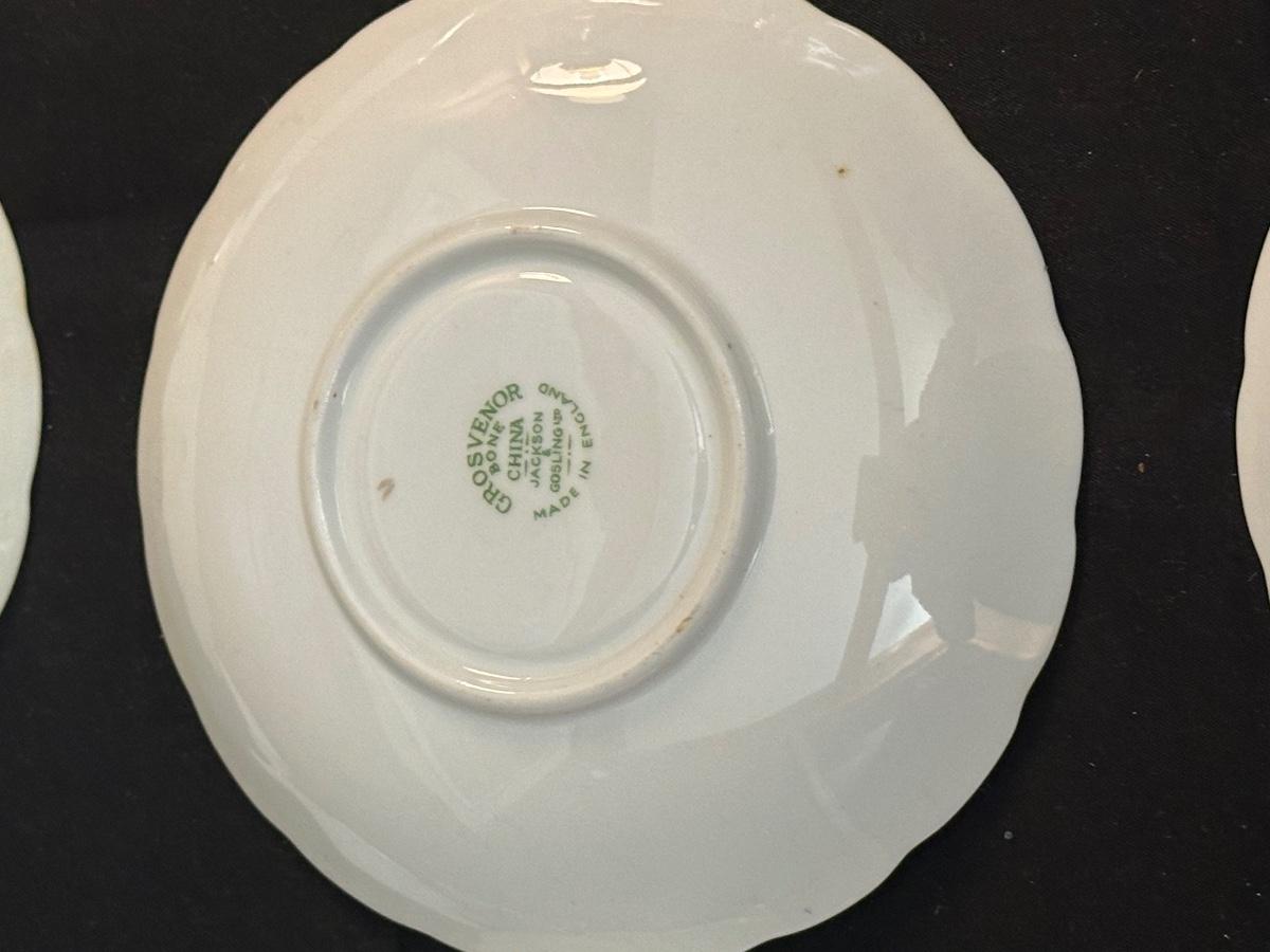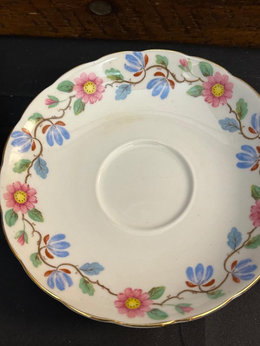 Beautiful china with some Patina. Three of the teacups have light green on the handle / Two of the plates do not have a double band (circle) in the middle.