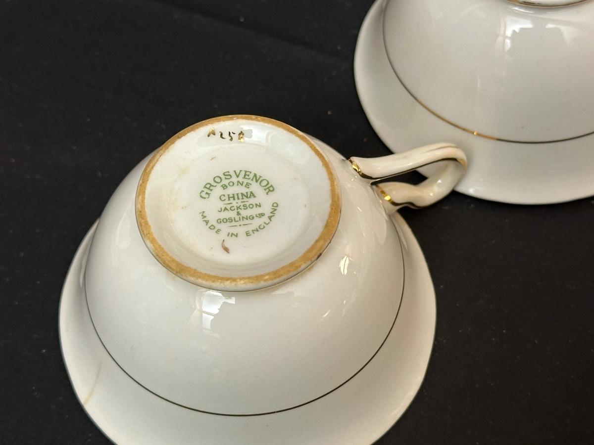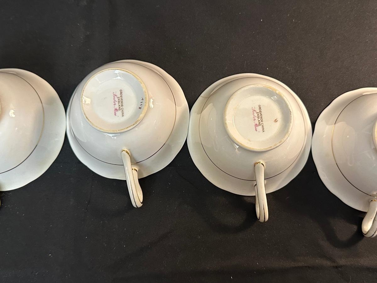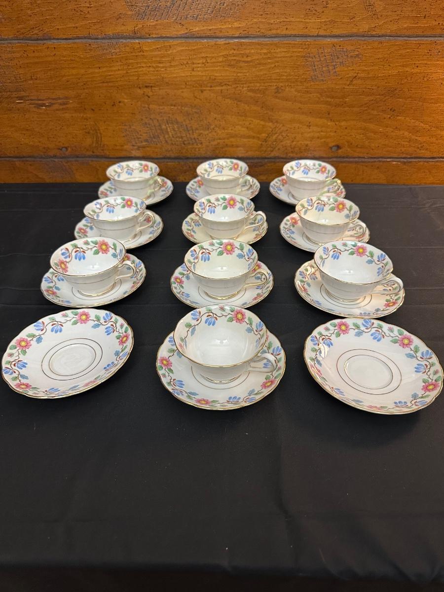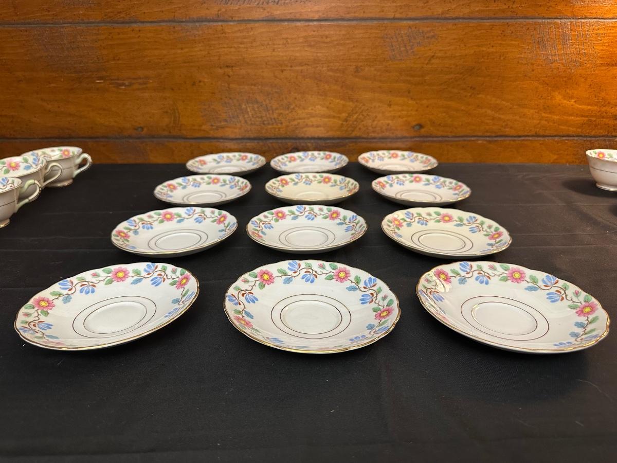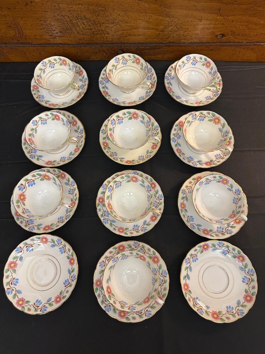 Beautiful china with some Patina. Three of the teacups have light green on the handle / Two of the plates do not have a double band (circle) in the middle.