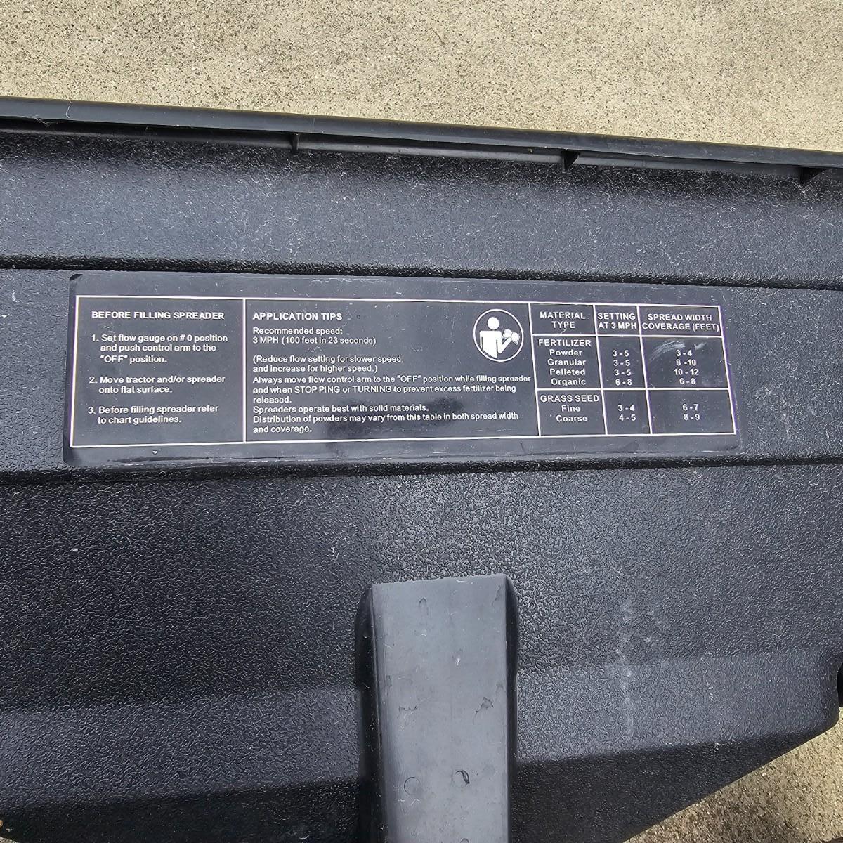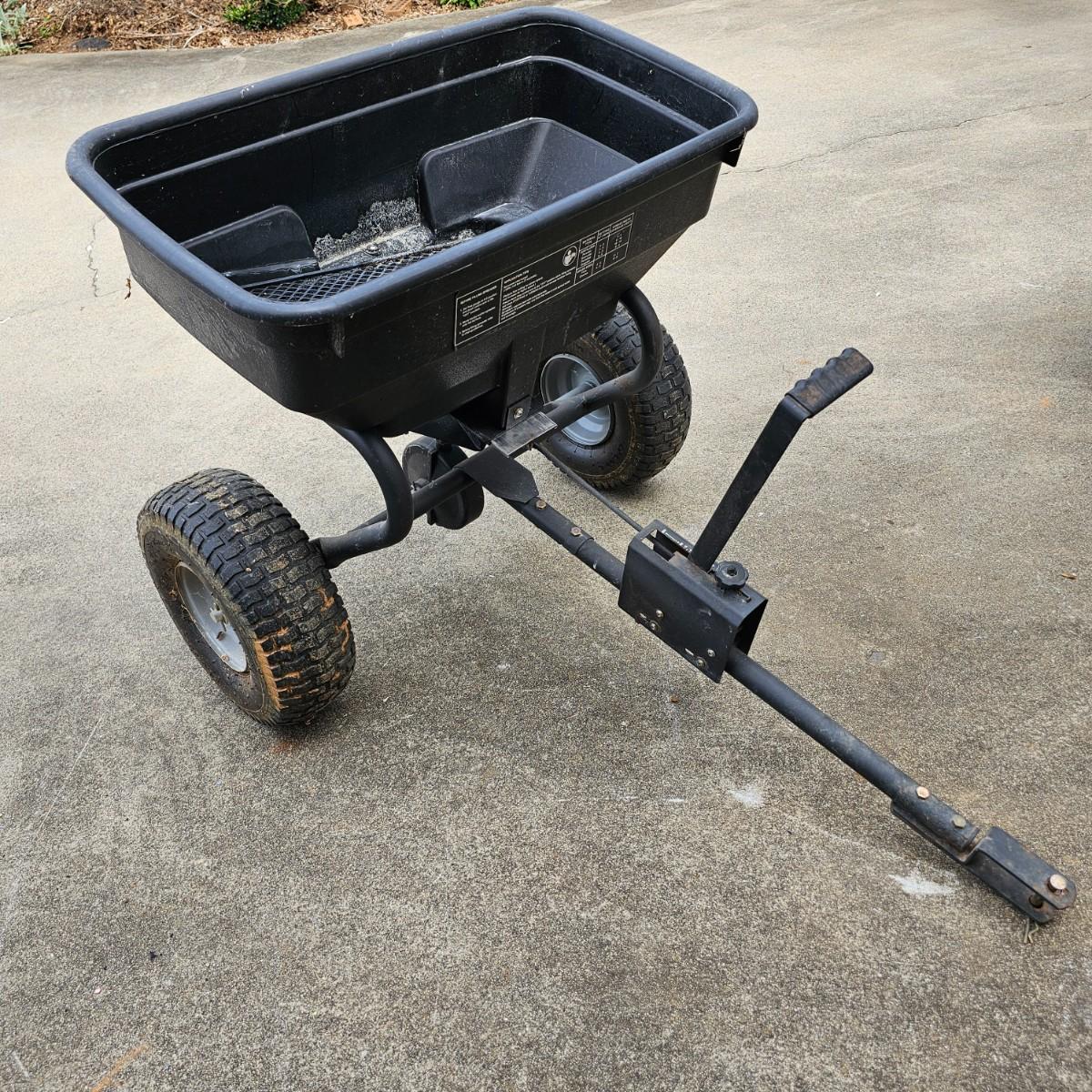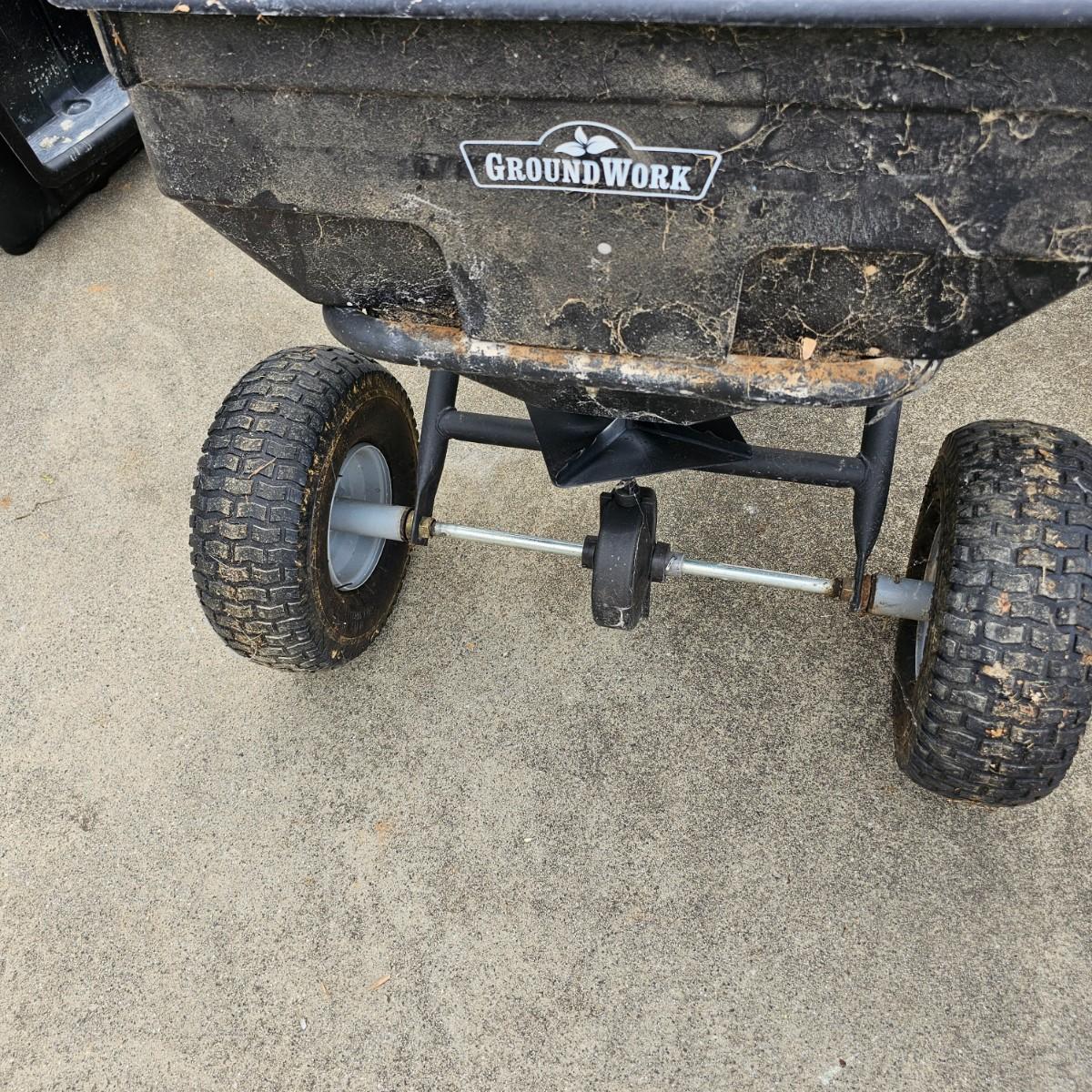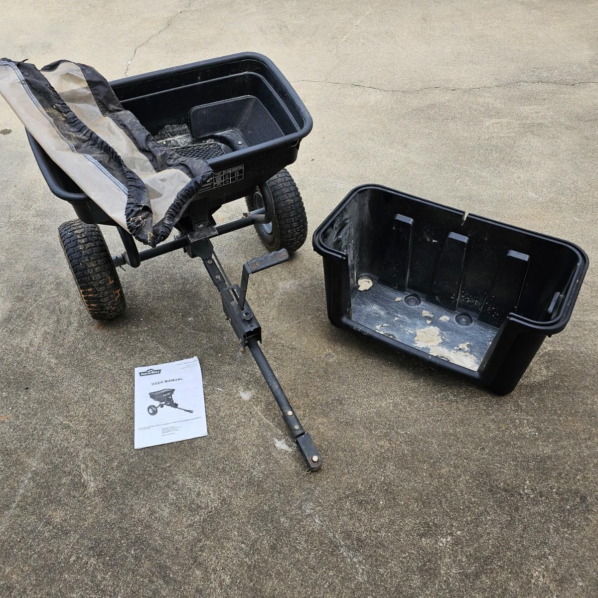 A pull behind spreader for large area applications. Made by Groundwork this unit has a 130 lb capacity hopper, adjustable spread rate and a cover. Includes original manual. Measures 42" x 32" x 30"H. Lot also has oversize tub for mixing or other, measures 16" x 29.5"x 15.5"H. See photos for details. Local pickup only.