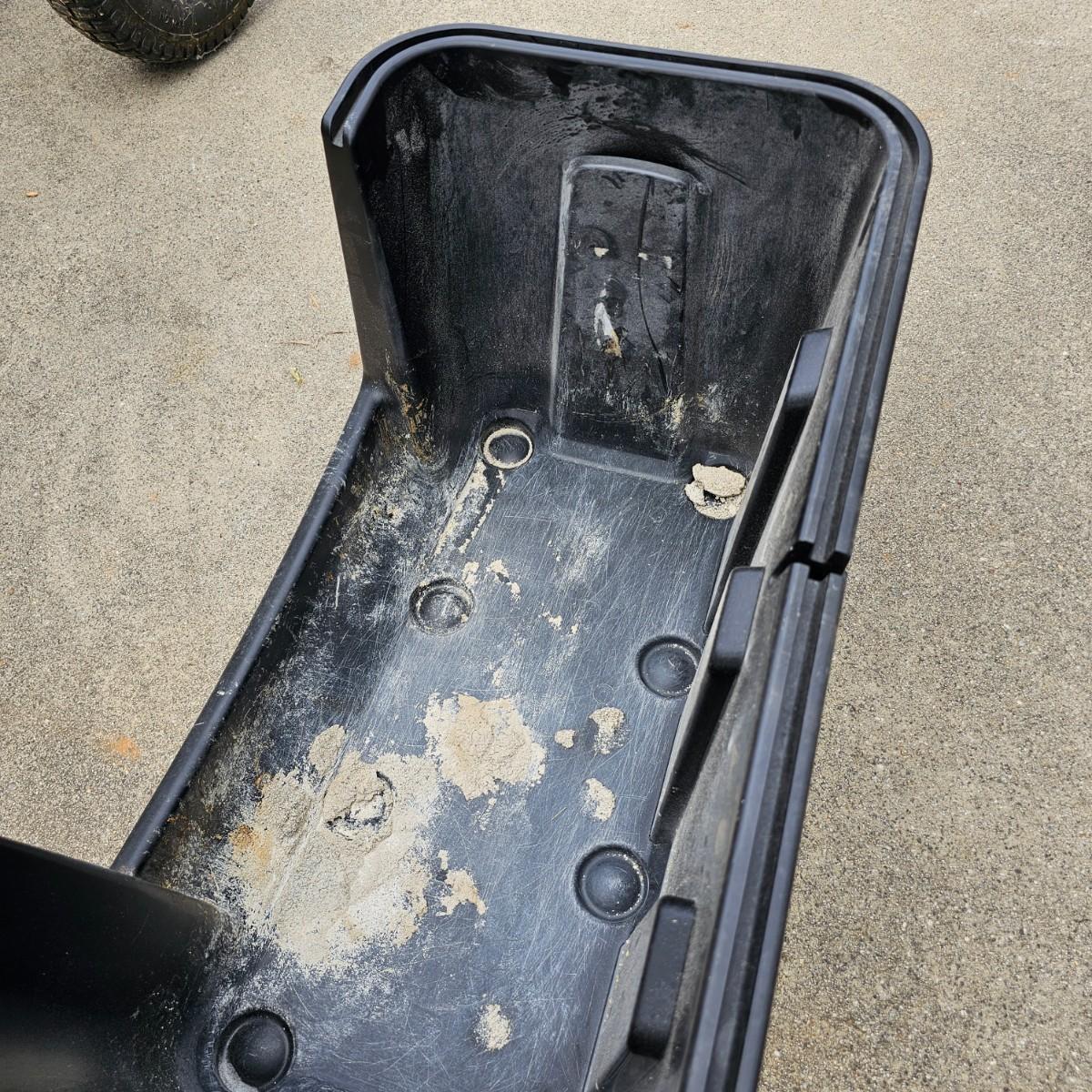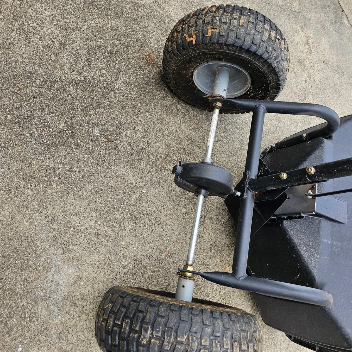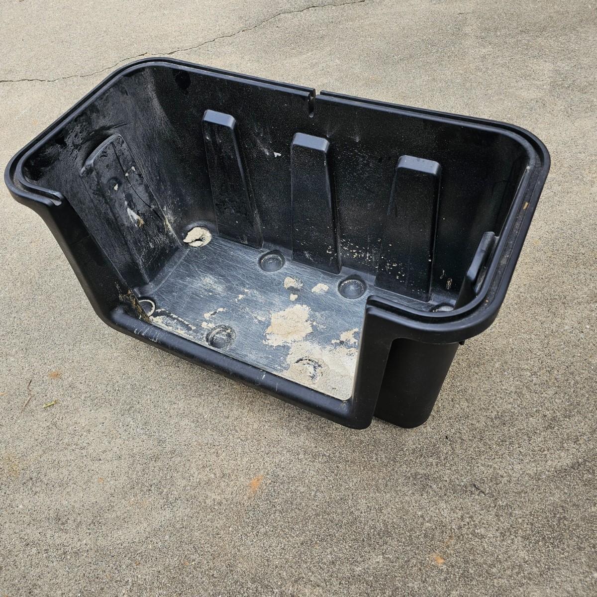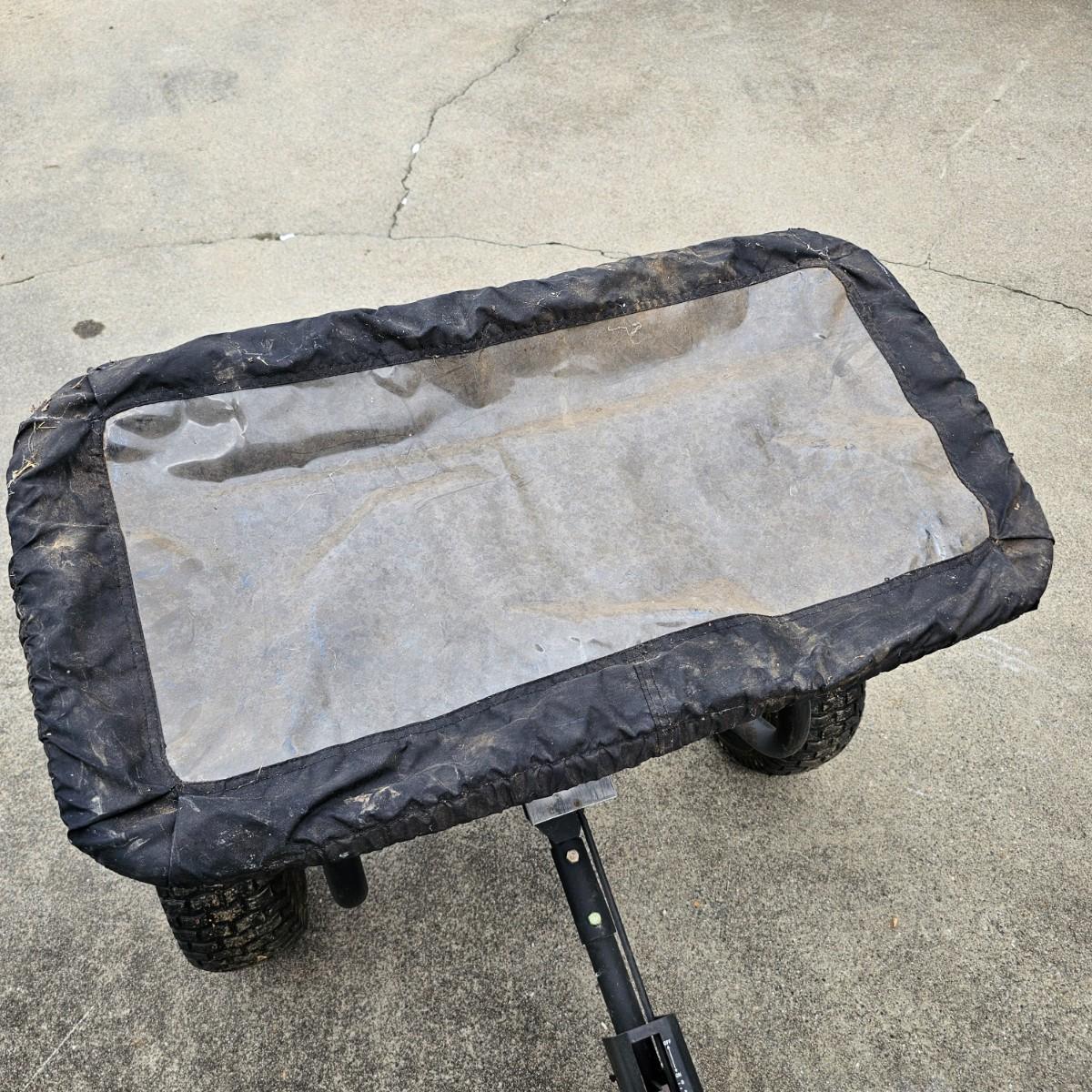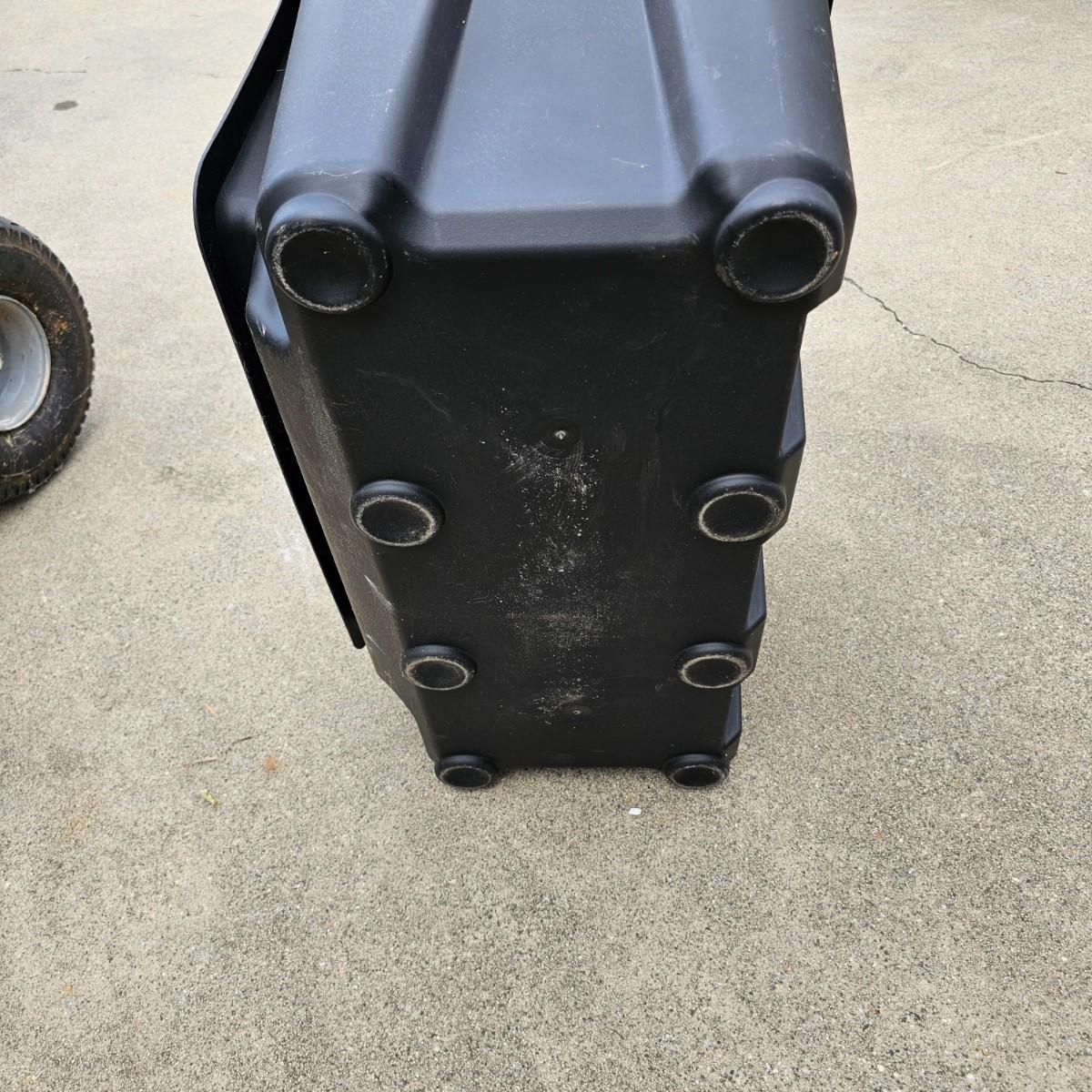 A pull behind spreader for large area applications. Made by Groundwork this unit has a 130 lb capacity hopper, adjustable spread rate and a cover. Includes original manual. Measures 42" x 32" x 30"H. Lot also has oversize tub for mixing or other, measures 16" x 29.5"x 15.5"H. See photos for details. Local pickup only.