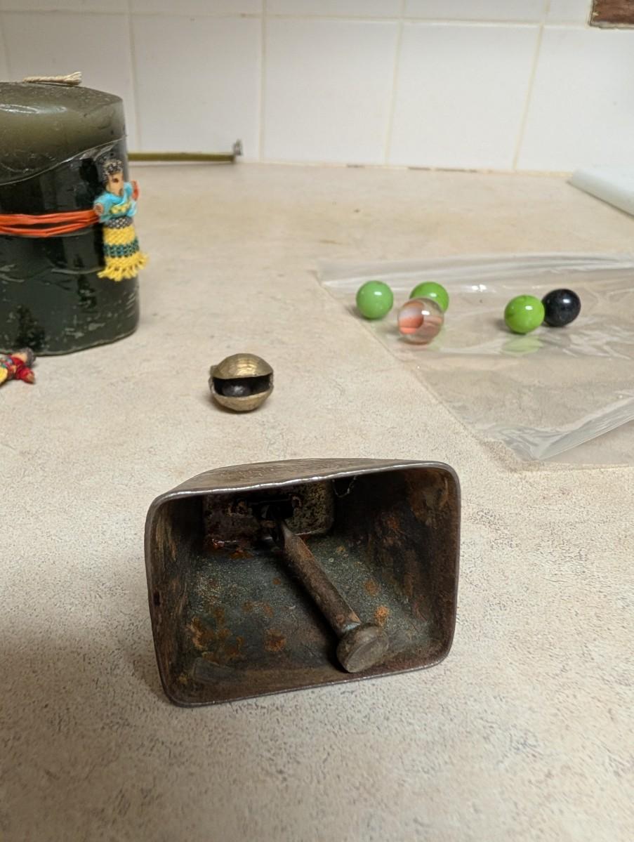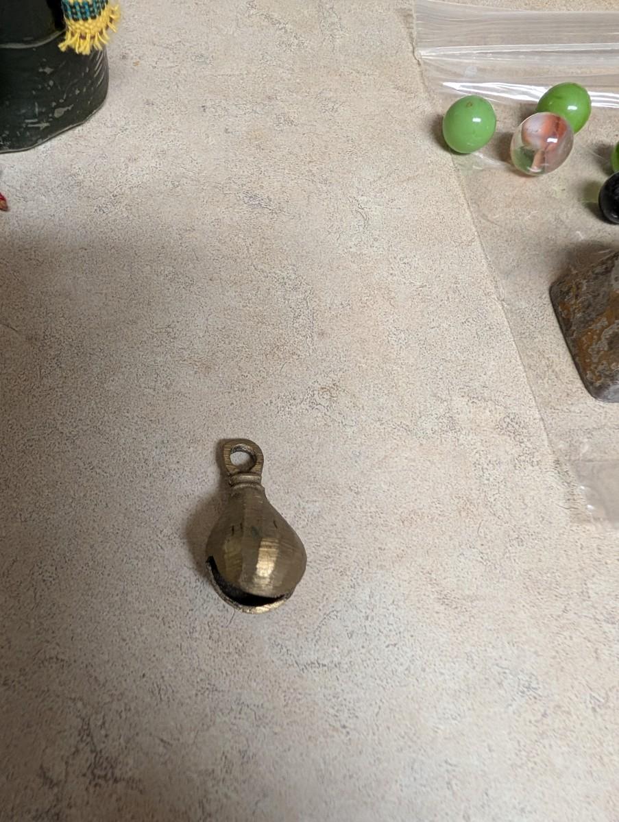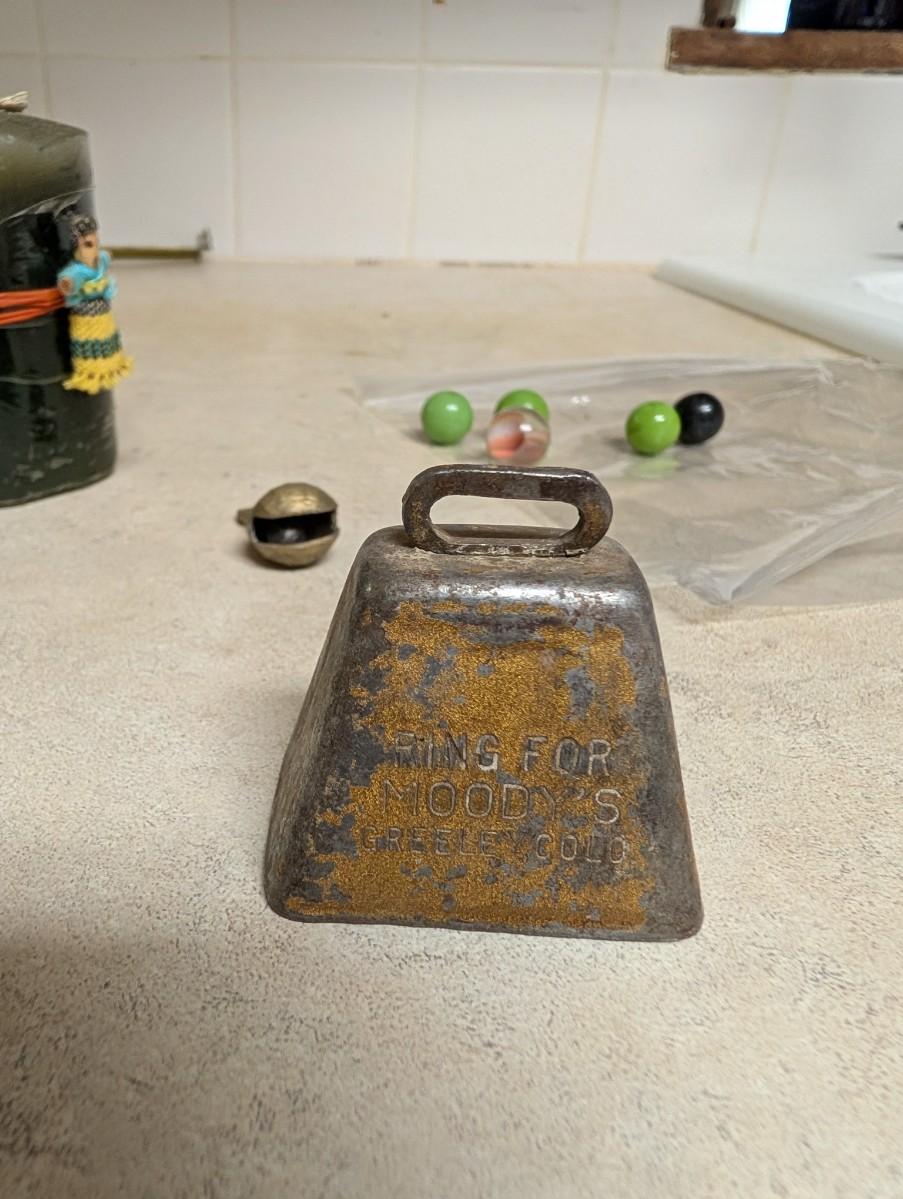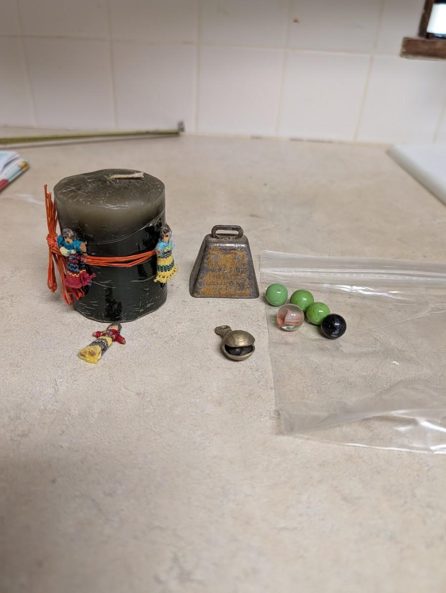 Green candle with worry dolls around it,small brass bell with a carved flower marked India,Small cow bell "Ring for Moodys" Greeley Colorado, Five Old marbles.