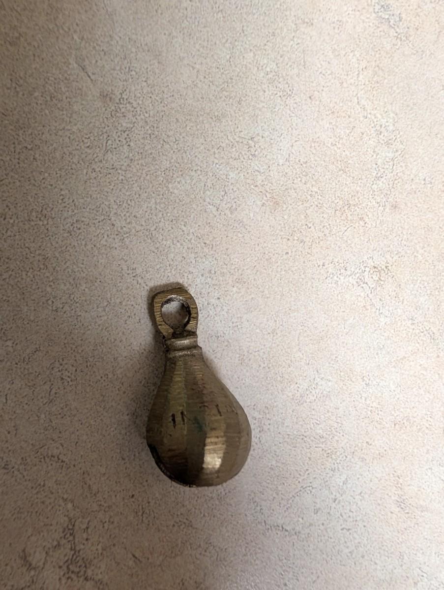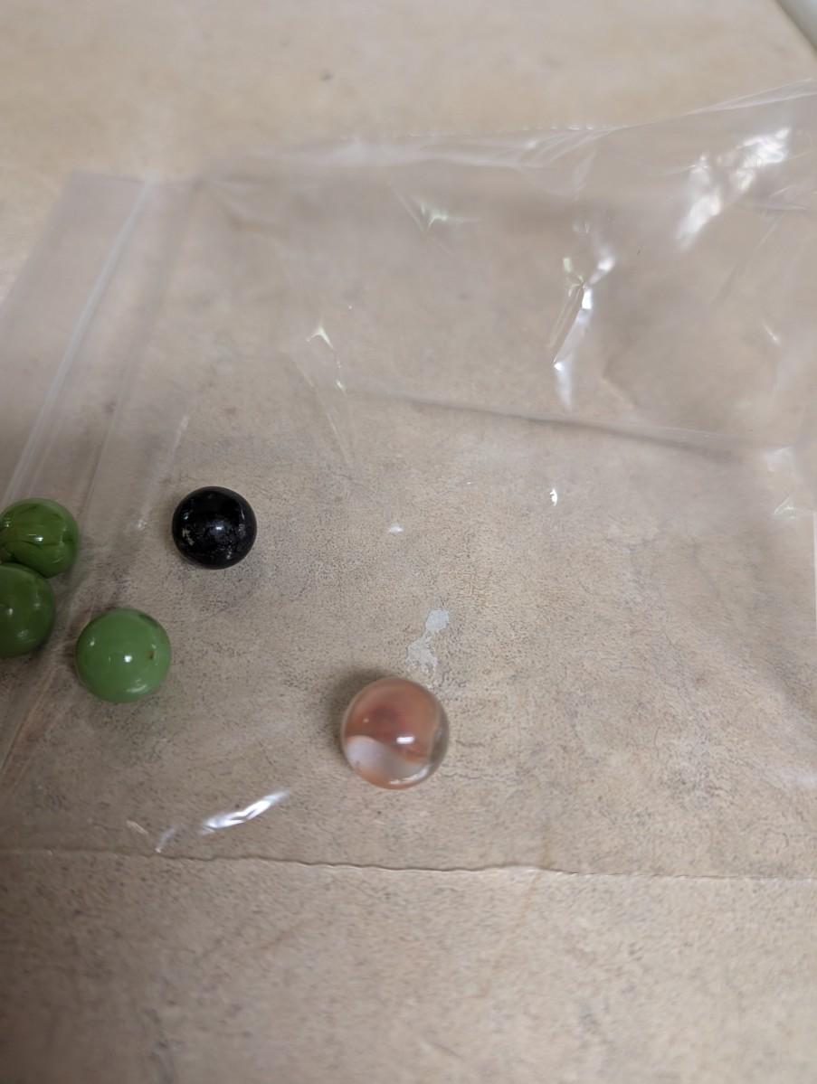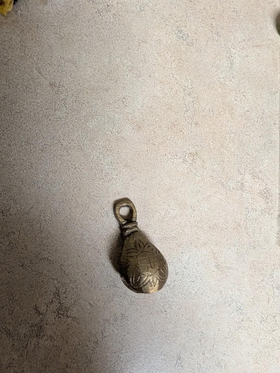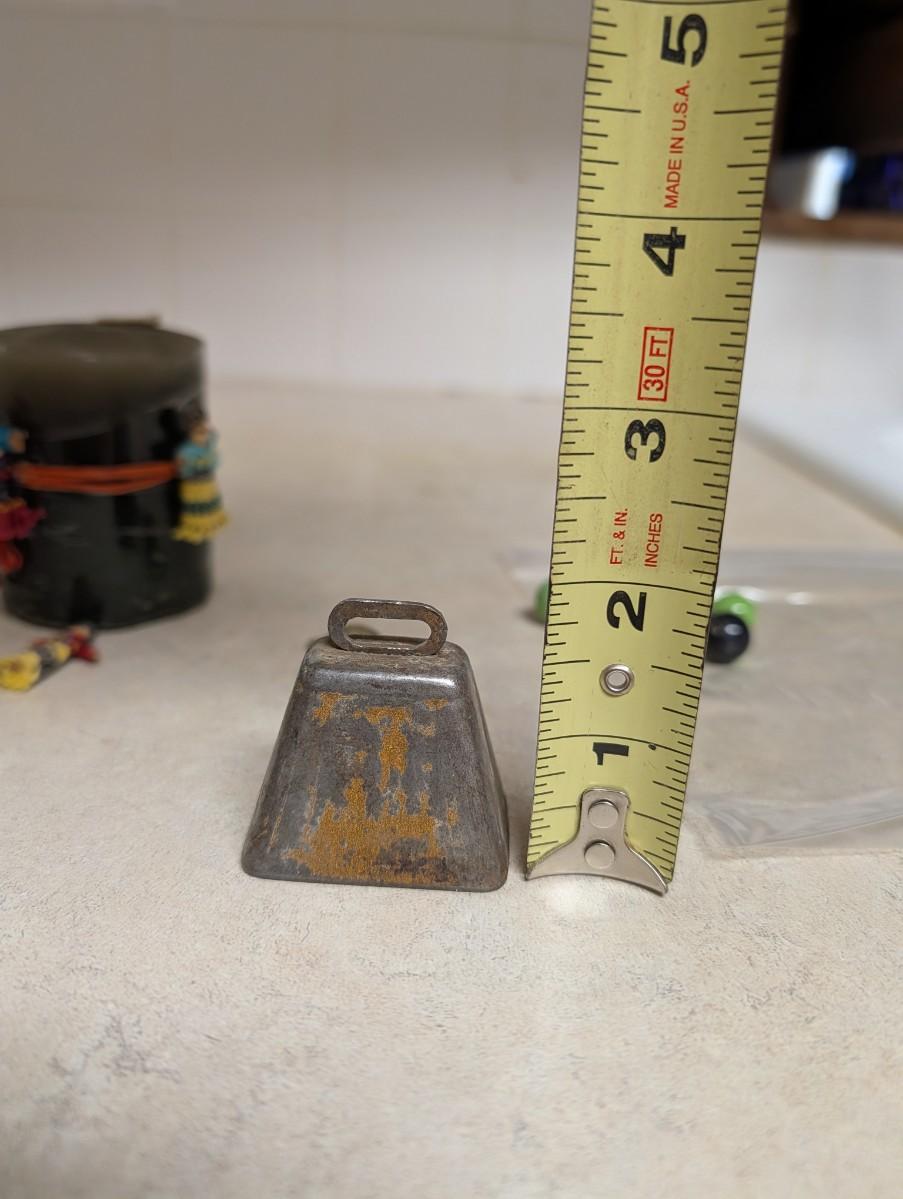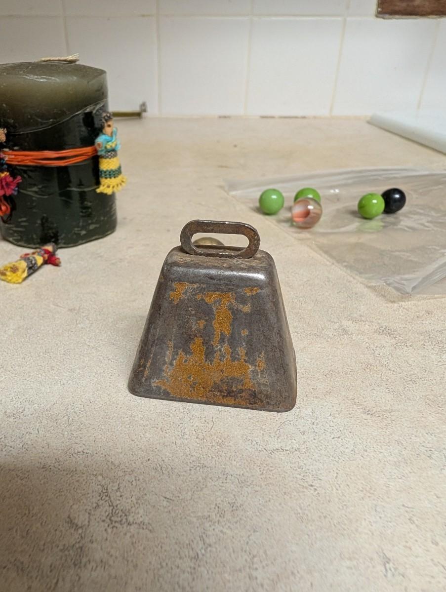 Green candle with worry dolls around it,small brass bell with a carved flower marked India,Small cow bell "Ring for Moodys" Greeley Colorado, Five Old marbles.