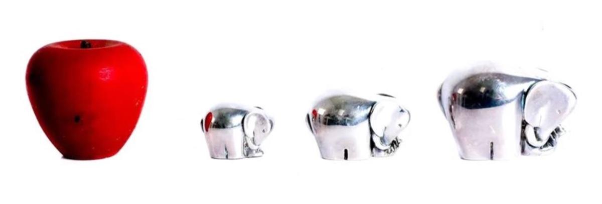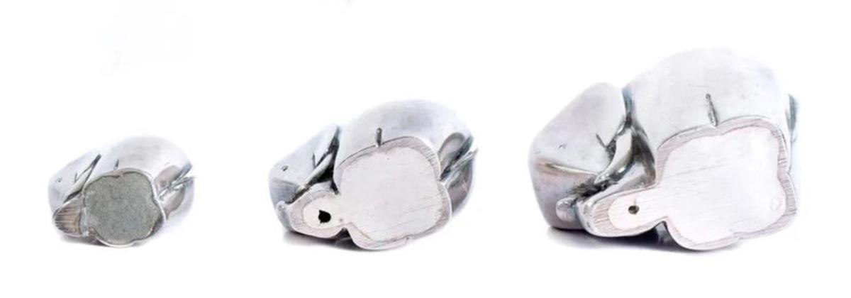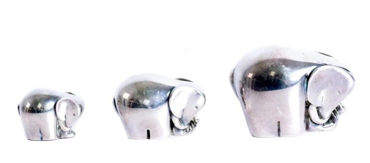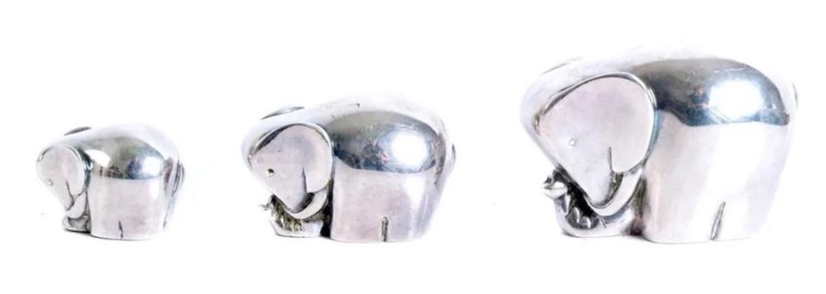 Group of three silver Modernist style elephants (family). Apparently unmarked. Approx. 2.32" x 3.25", 1.75" x 2.5", 1.25" x 1.75".