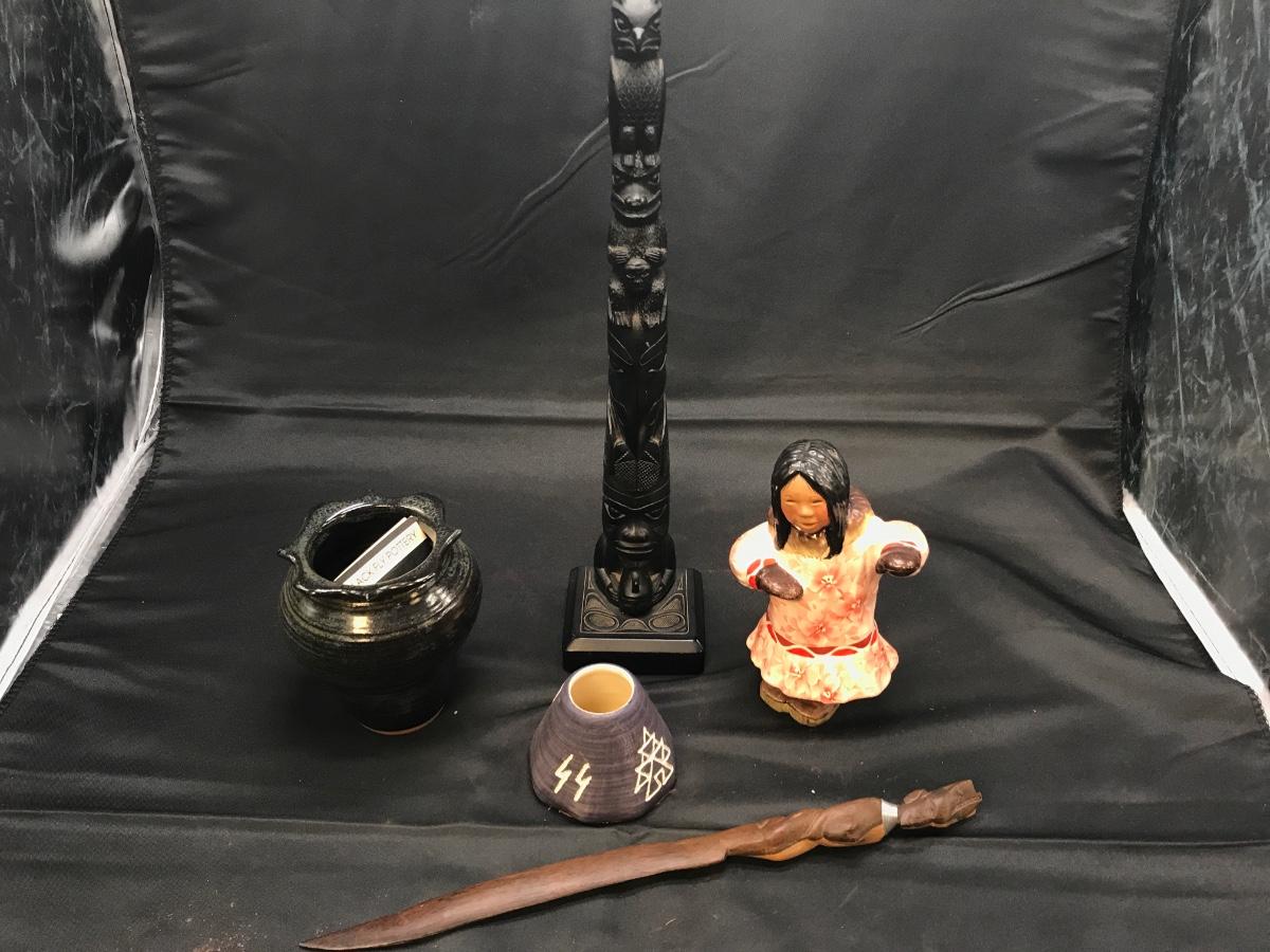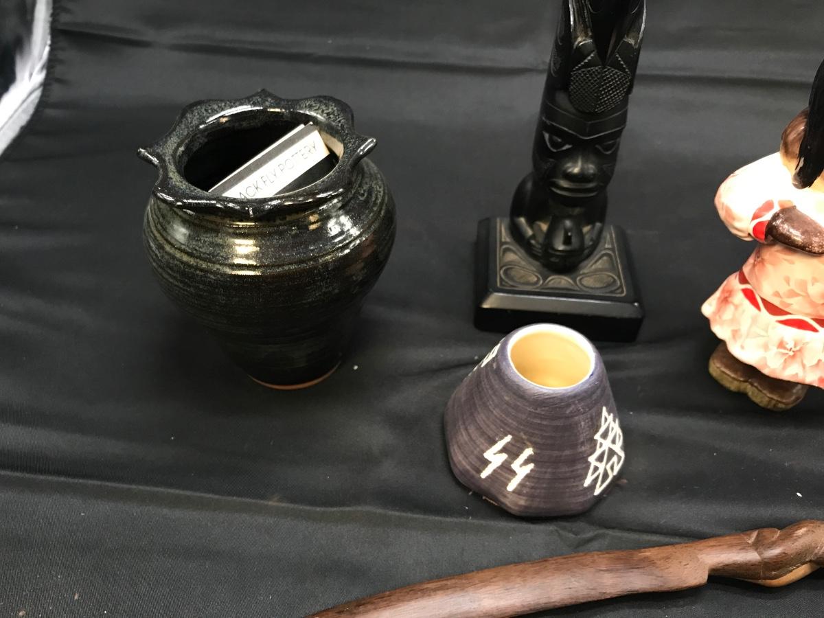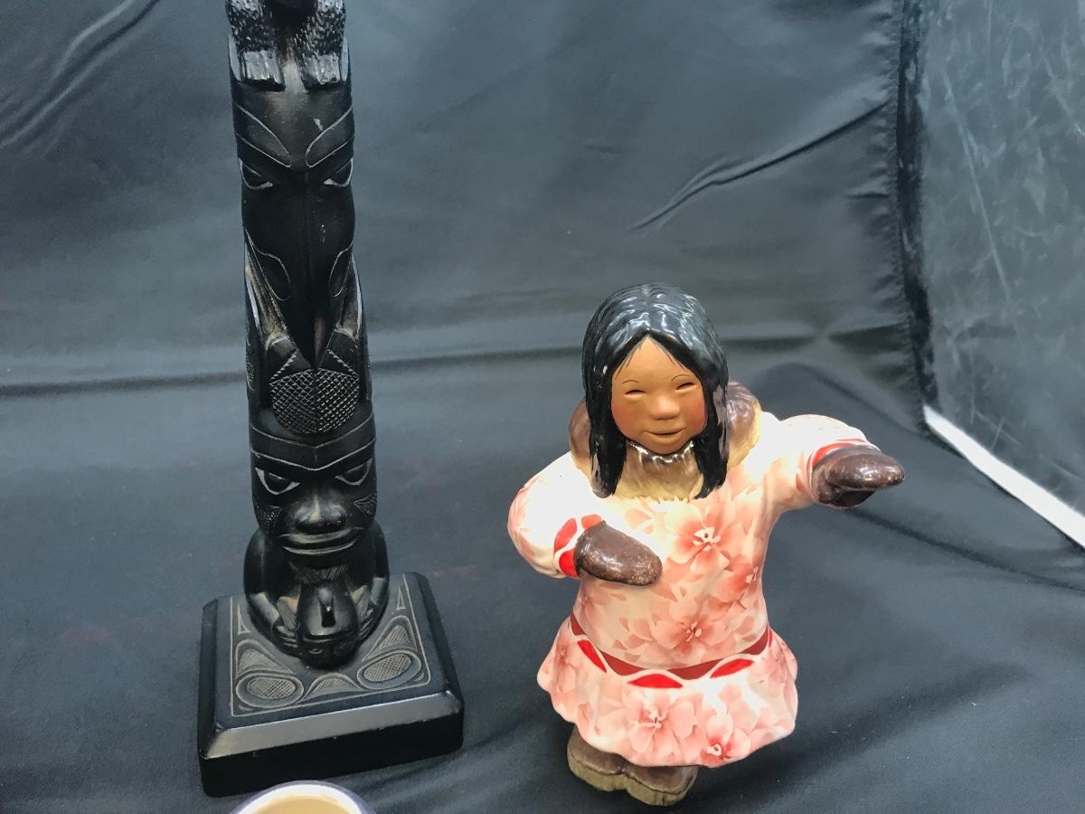 Inuit signed figure of a girl, totem , Sioux pot and others
