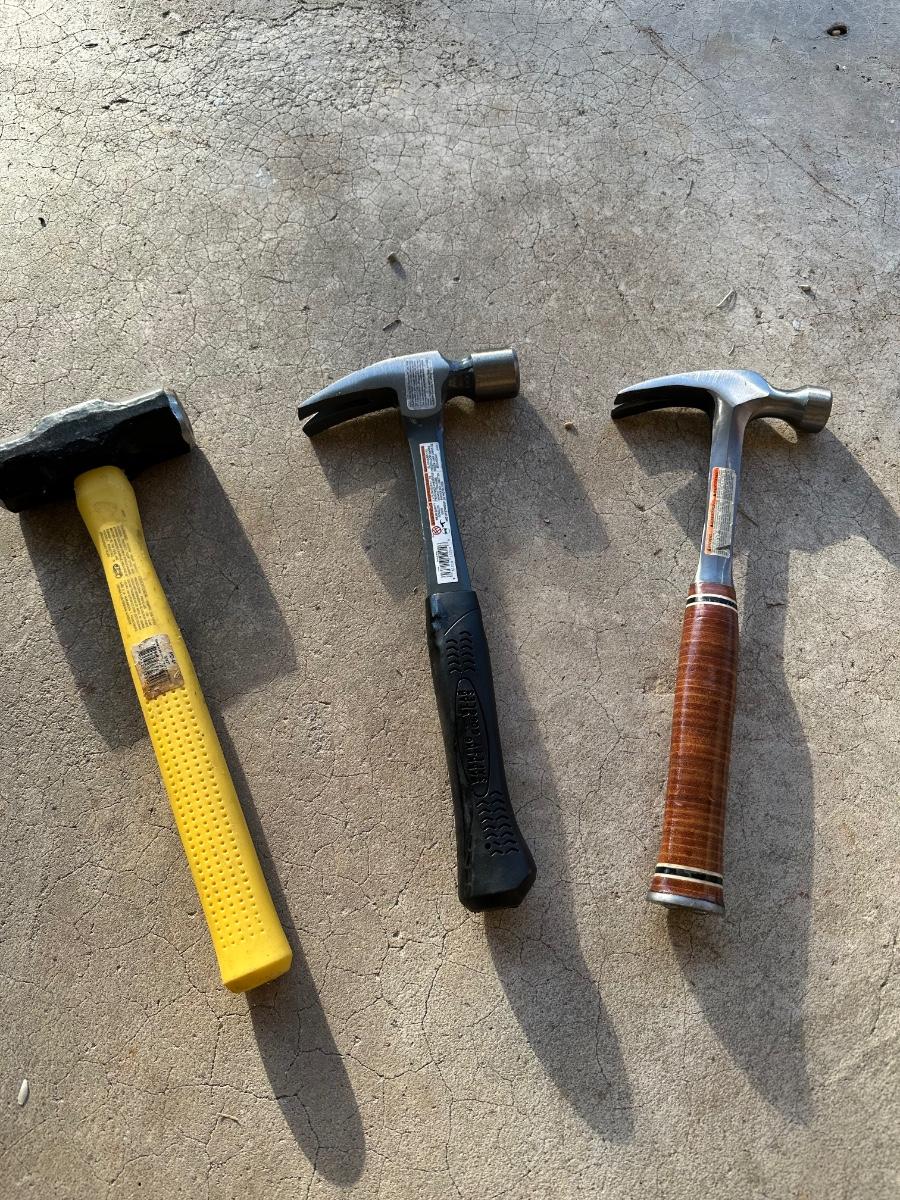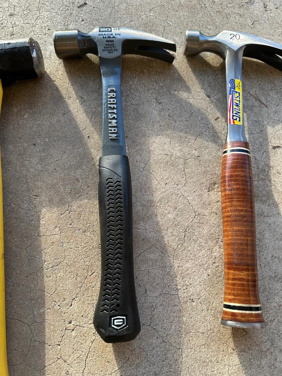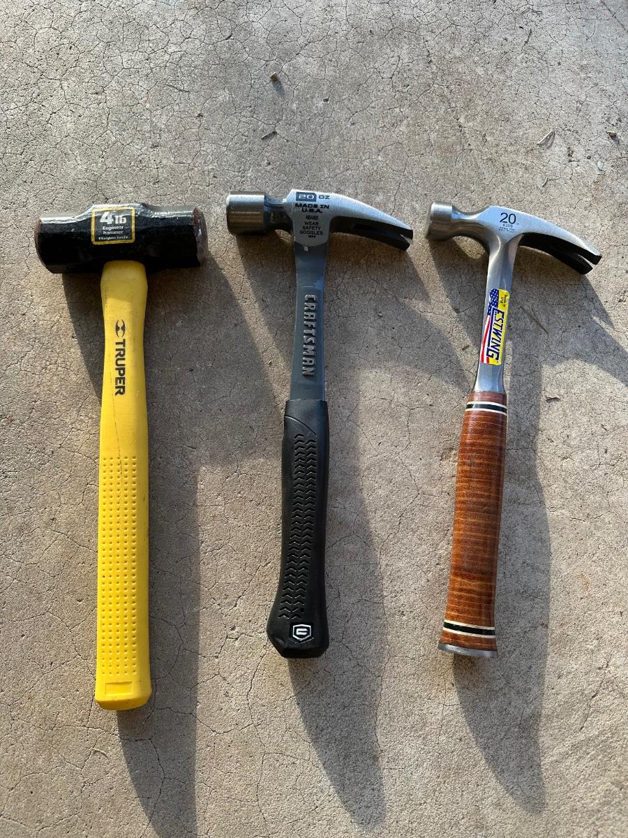 a Craftsman 20 oz claw hammer, an Estwing 20 oz leather-handled claw hammer, and a Truper 4 lb engineers hammer with fiberglass handle.