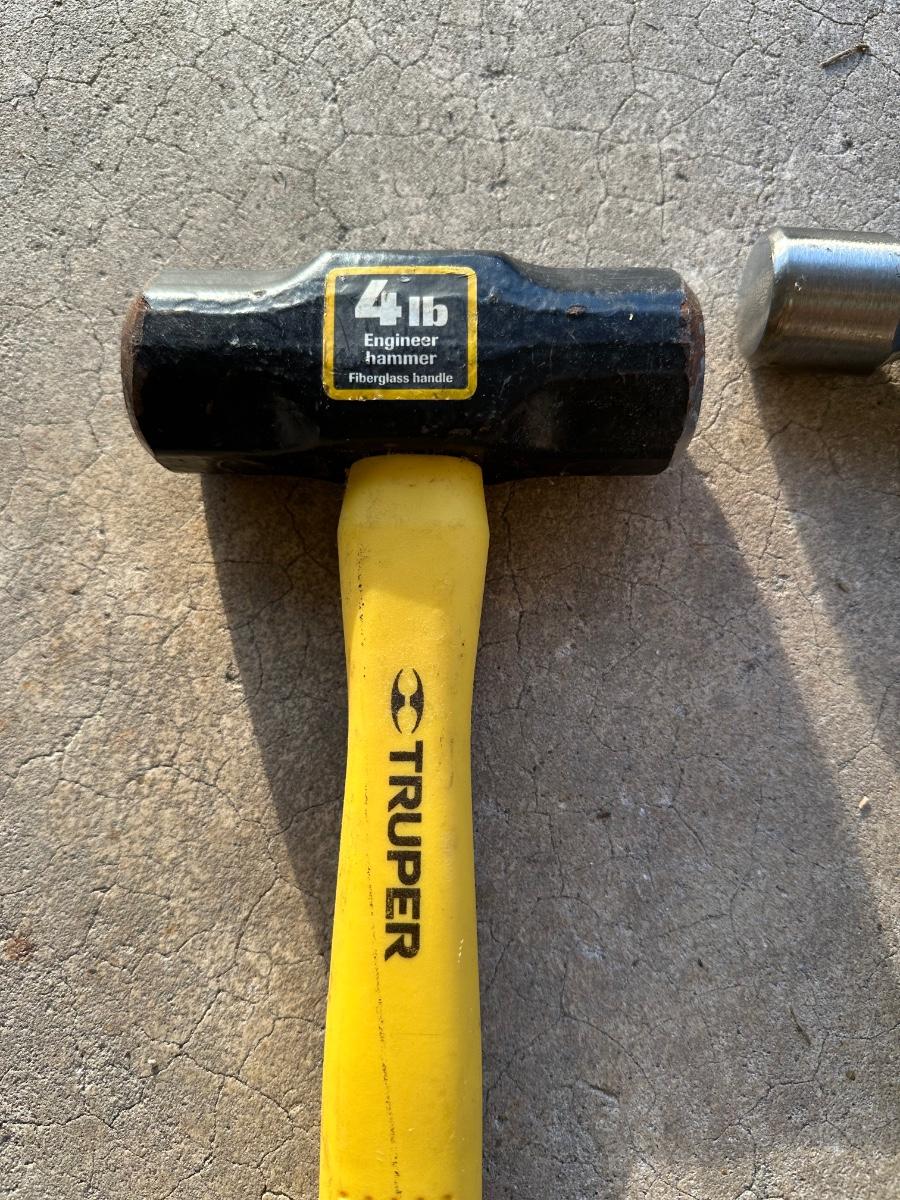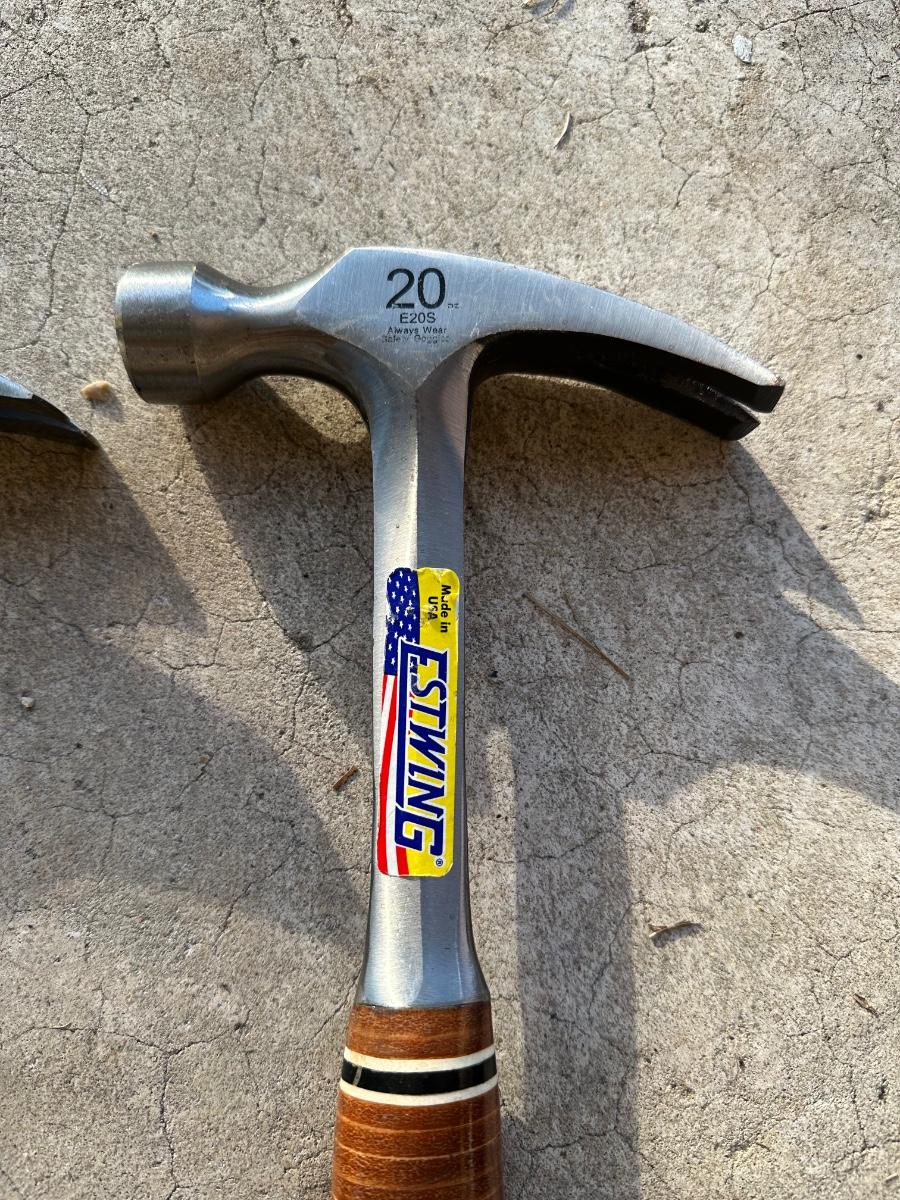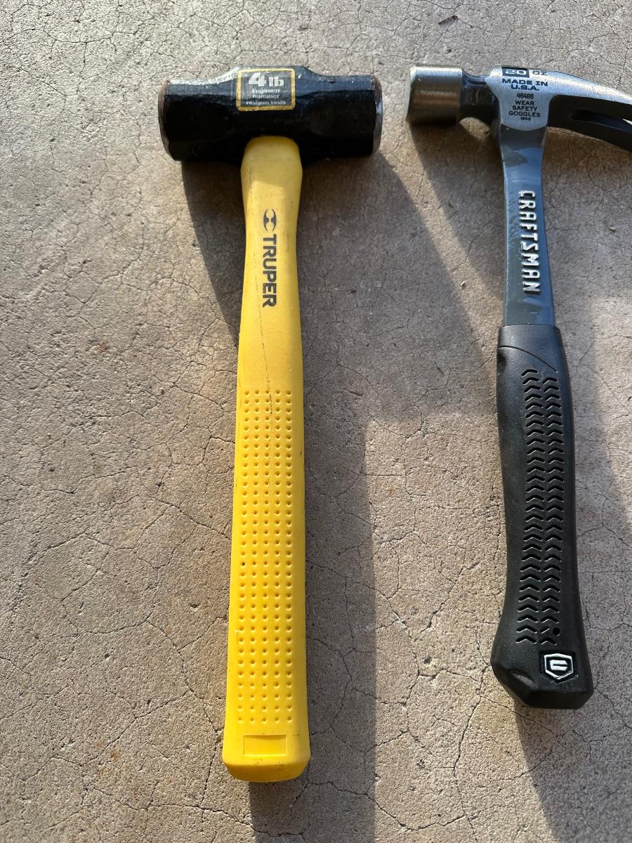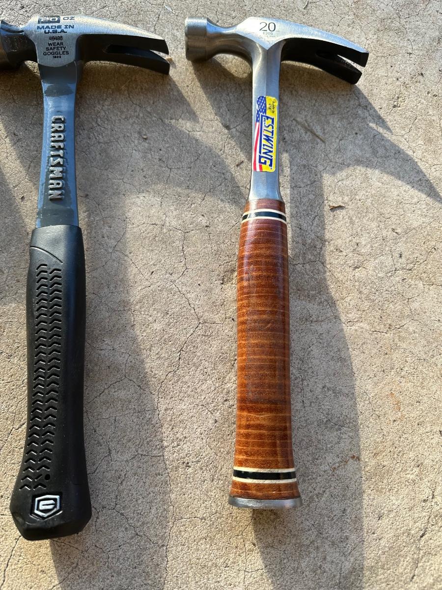 a Craftsman 20 oz claw hammer, an Estwing 20 oz leather-handled claw hammer, and a Truper 4 lb engineers hammer with fiberglass handle.