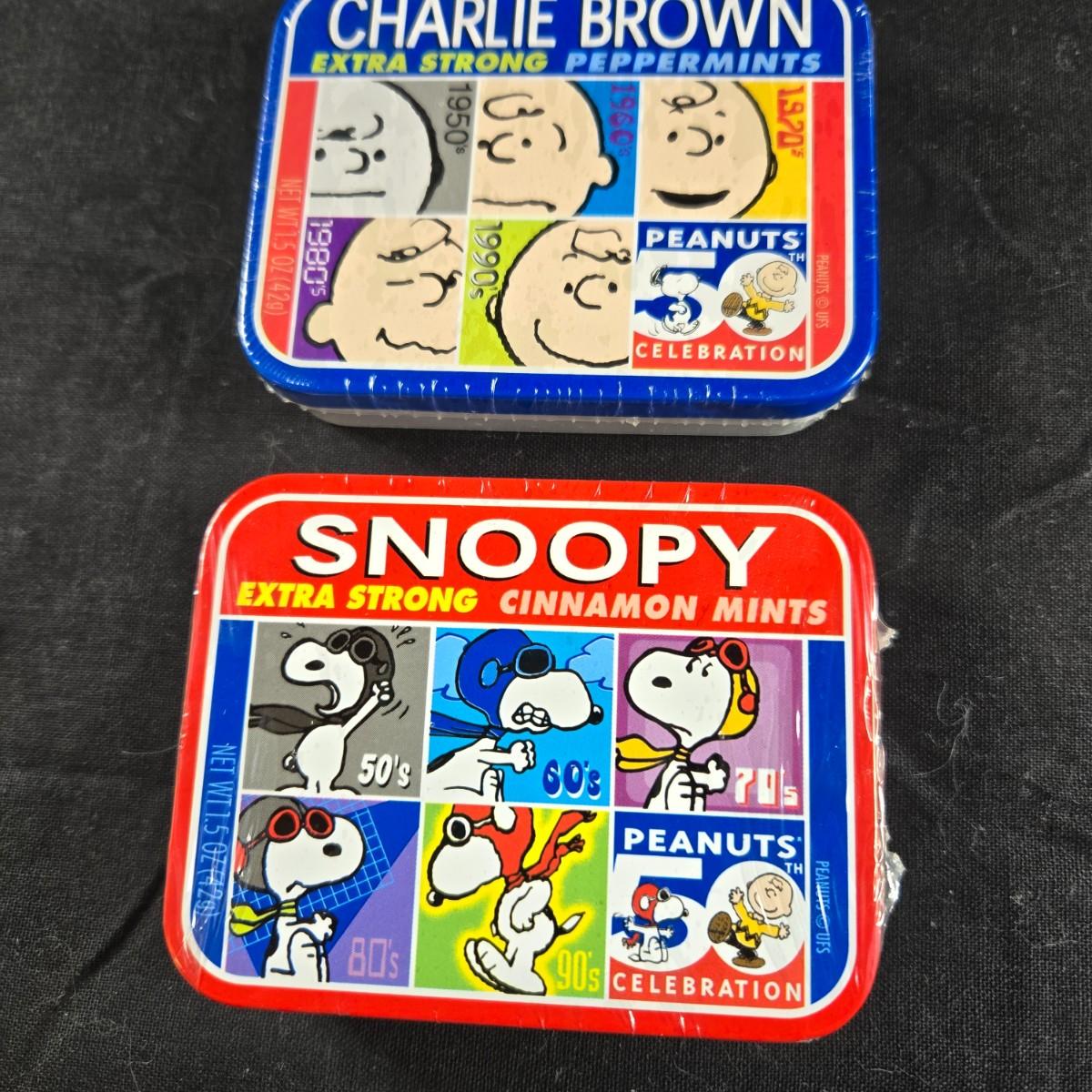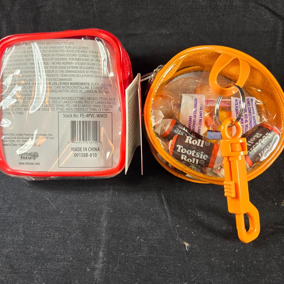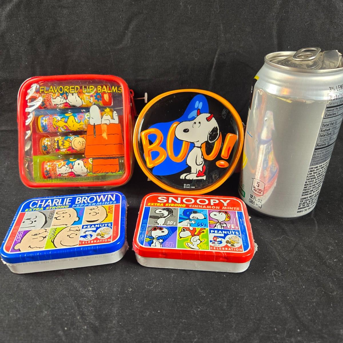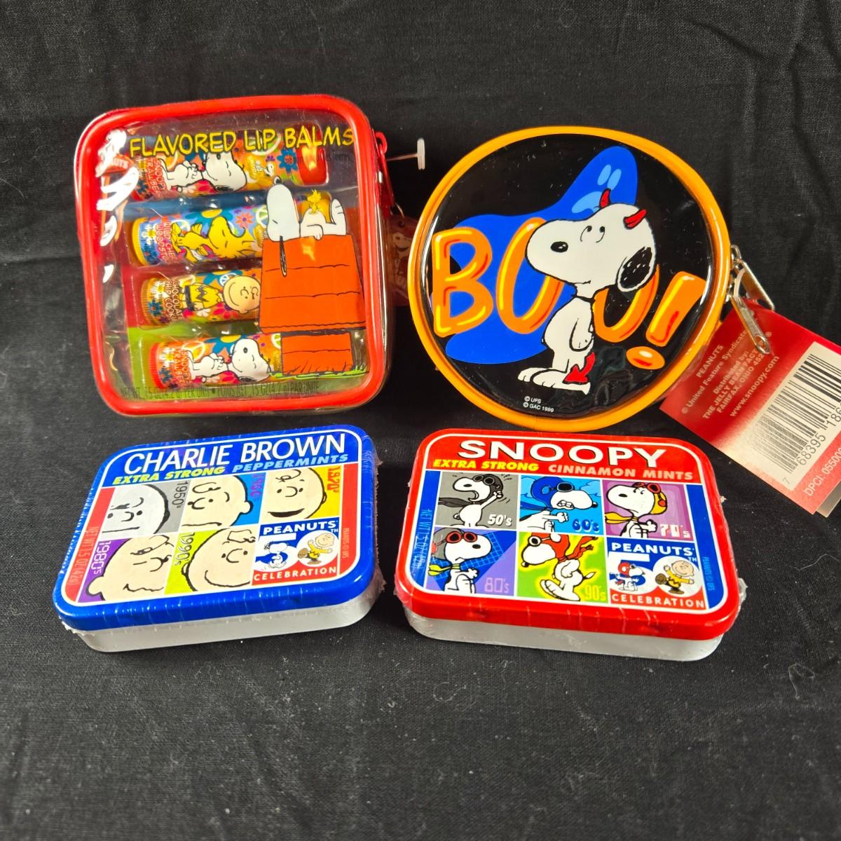 This auction lot is for a Group of 4 Peanut's Small Candy/Lip Balm Containers. There are 2 unopened collector mint tins, a small zippered purse full of Halloween candy and a zippered pouch full of 4 new lip balms. Not sure of age, if wanting to eat or wear, use your best judgement. They are in new unused condition. From a serious collector's collection.