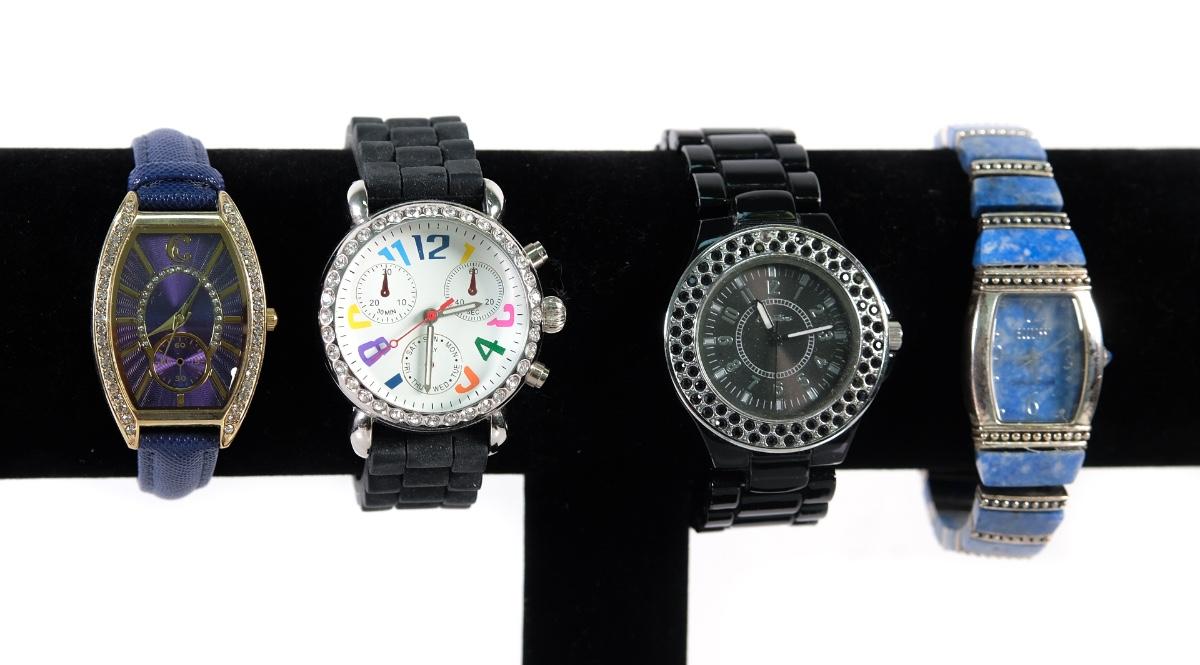 4 watches total. Charming Charlie( 6.5" band length), Unknown(7.5" band length), Curations(5.5" band length), Ecclissi(2.5 inner diameter). Unsure of working condition, they need new batteries.