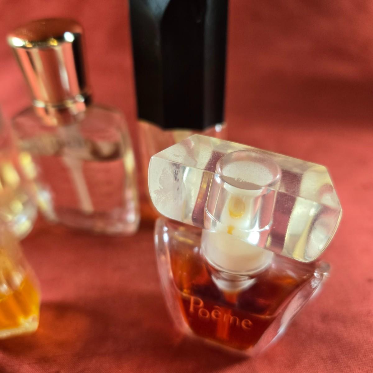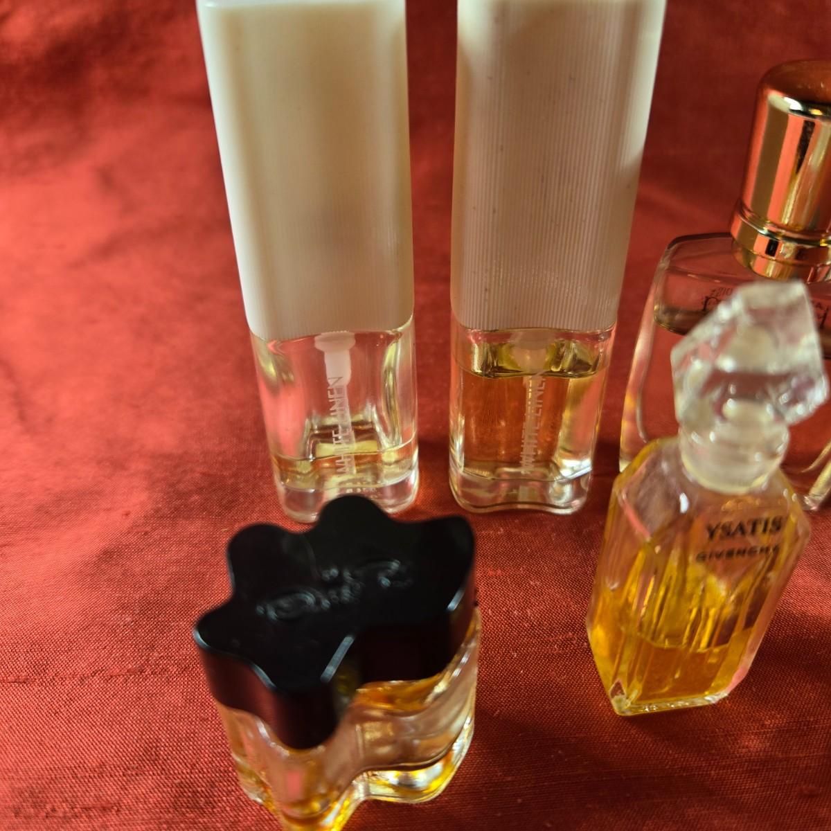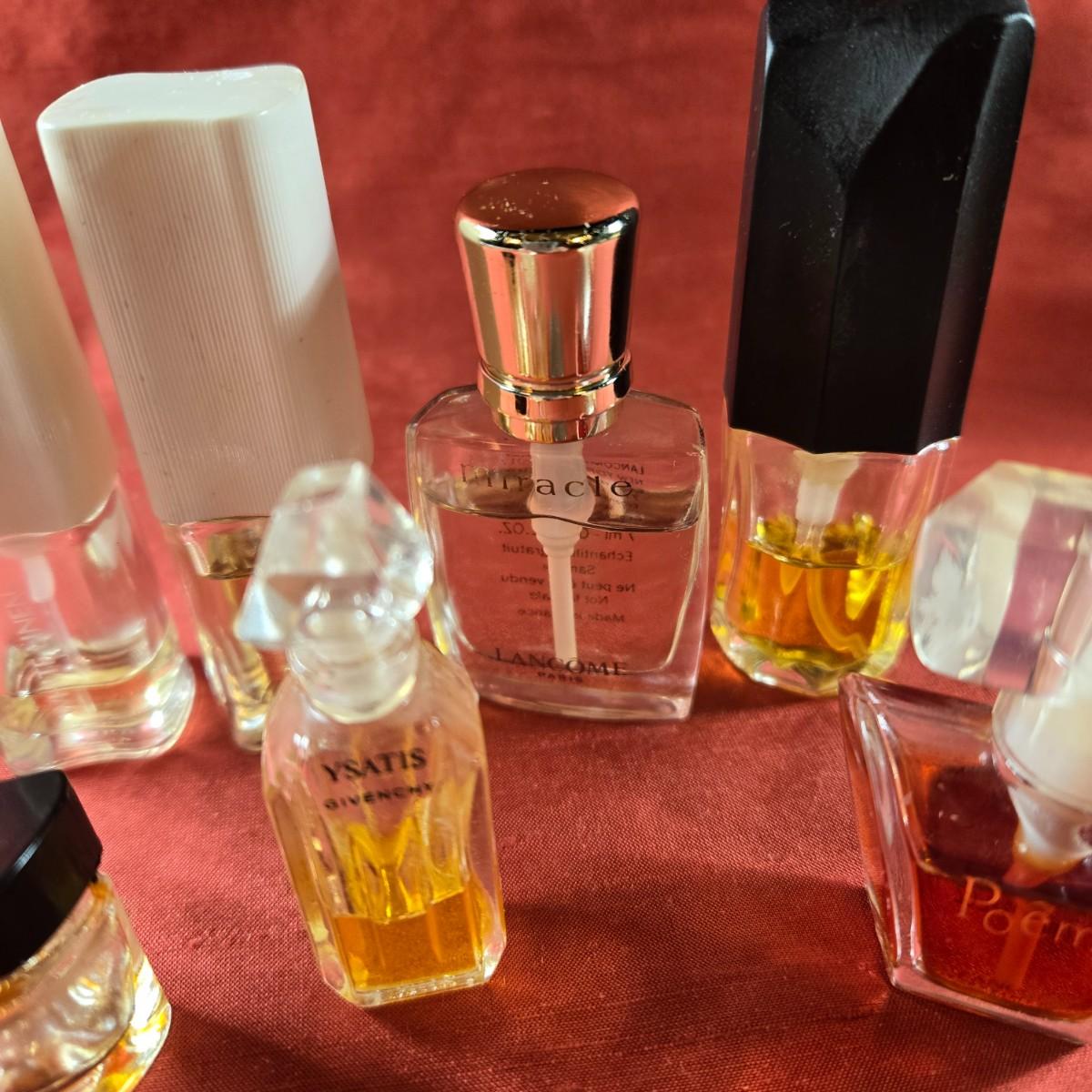 This auction lot is for a Group of 7 Salesman Sample Parfumes. This is a lot of 7 Salesman Sample Parfumes with various levels of fullness. Poeme by Lancome of Paris - 7 ml - Spray, mostly full, Este Lauder "Knowing" - Spray. Miracle by Lancome - 7 ml. Two White Linen - Spray - one is almost full, one is 1/4 full. Ysatis by Givency - bottle stopper is chipped and is 1/3 full. The last bottle is Oscar de La Renta - it is empty but an unusual shaped bottle for those who are bottle collectors,