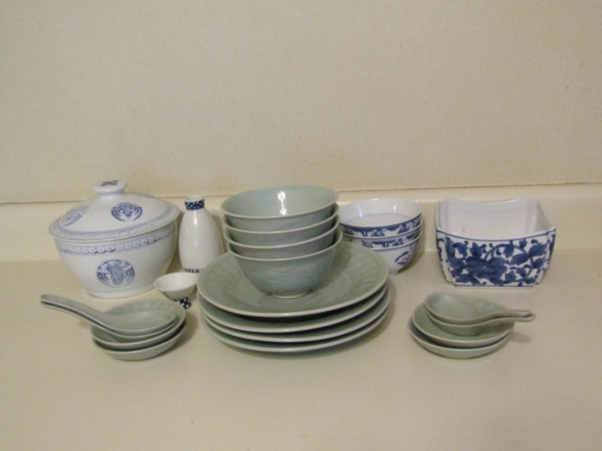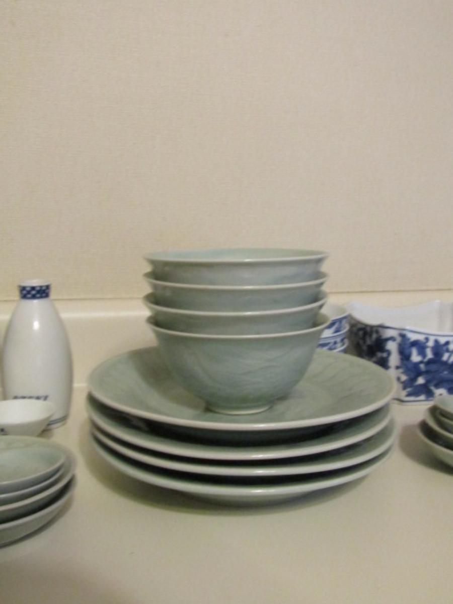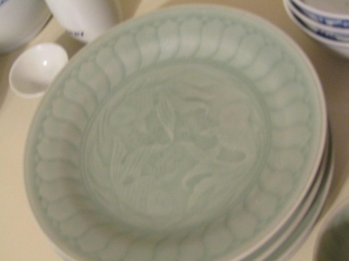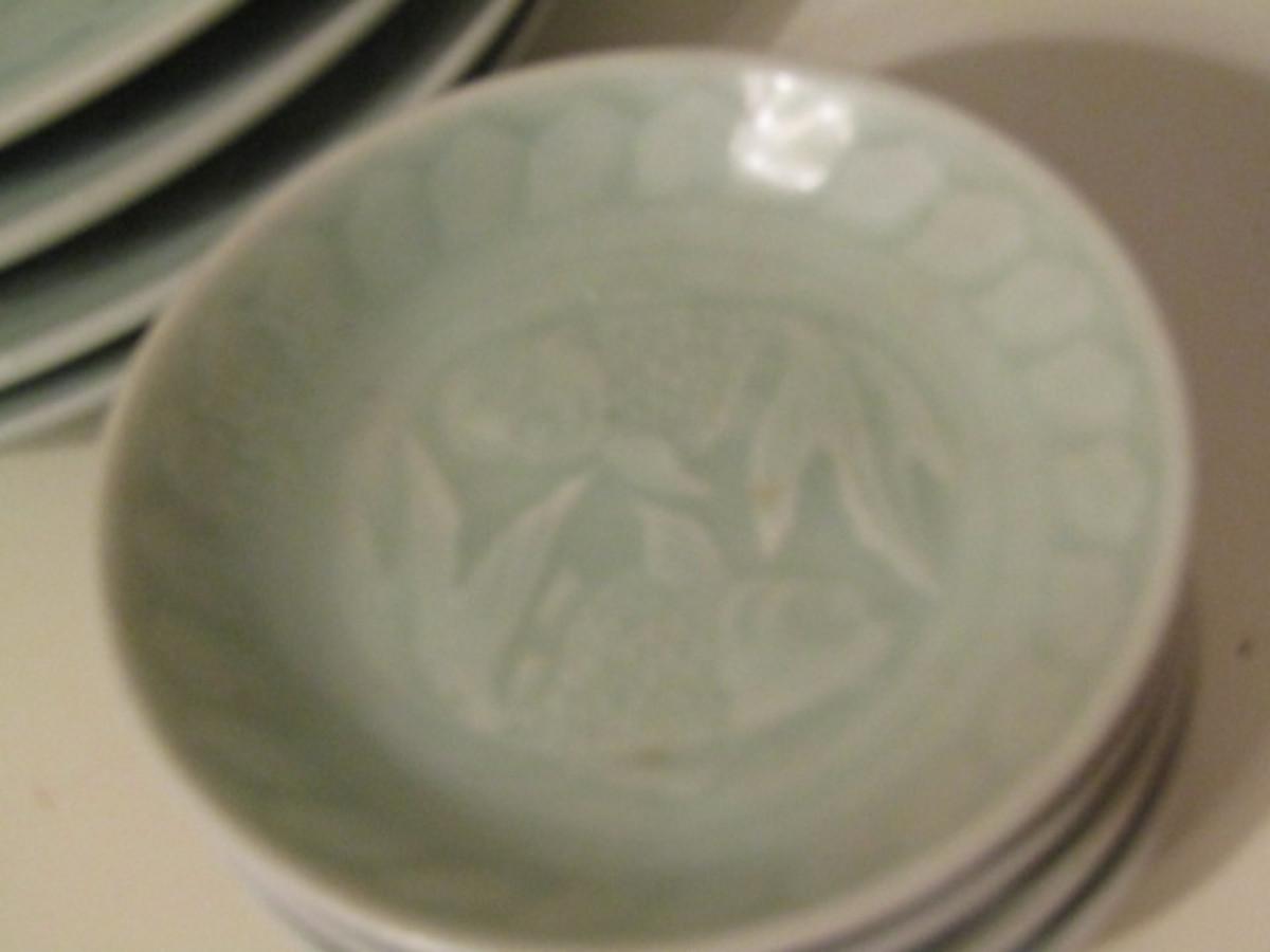 Group of Asian Dishes- green set is decorated with coy fish and has four place settings (plate, bowl, spoon, and small dish).