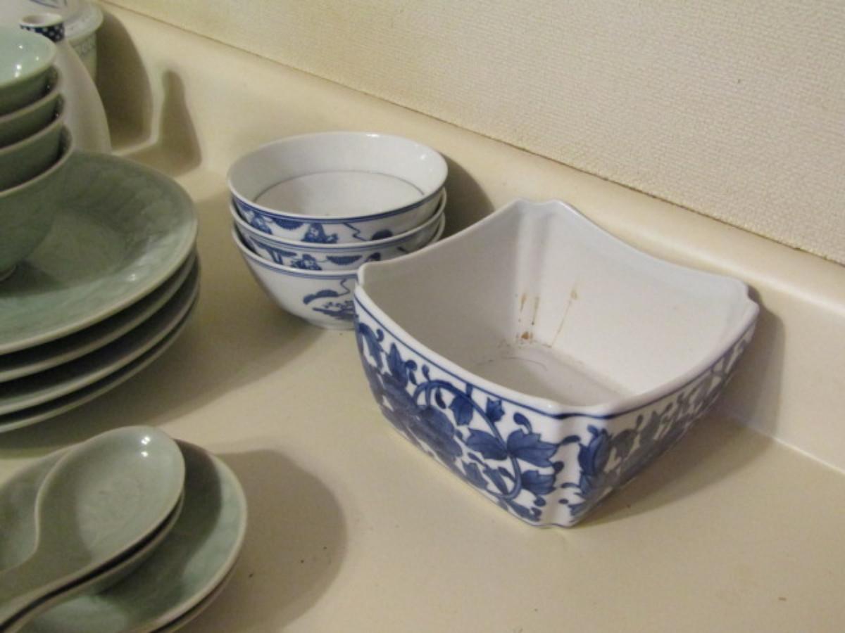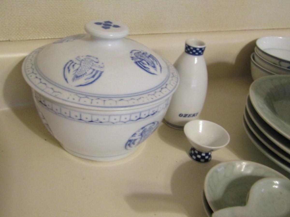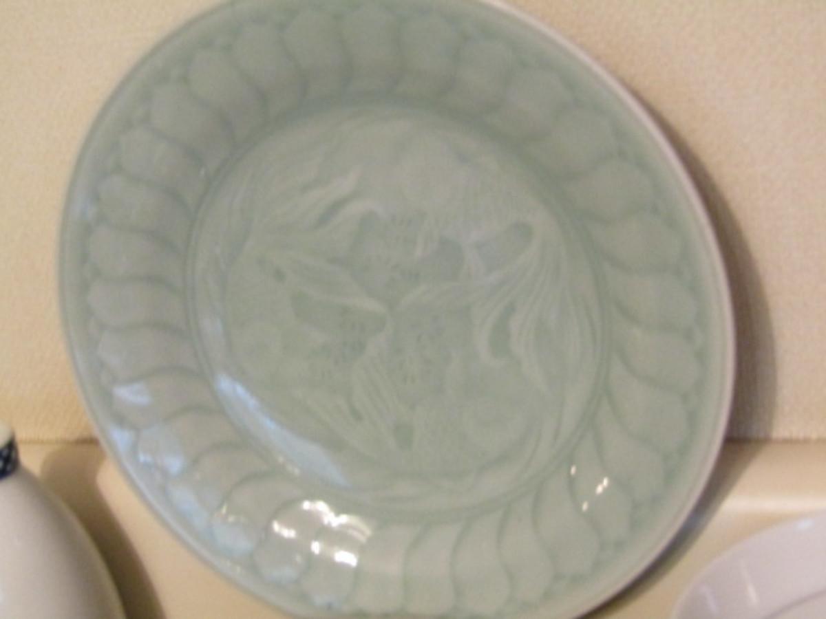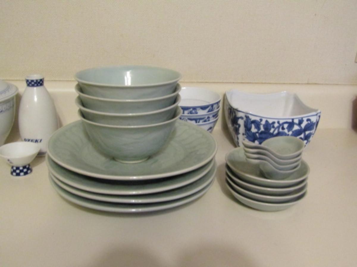 Group of Asian Dishes- green set is decorated with coy fish and has four place settings (plate, bowl, spoon, and small dish).