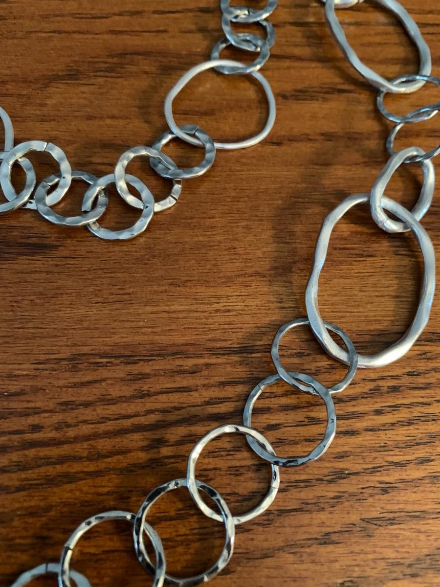 1 is a double strand with hammered metal accents loops, 1 more delicate and other slightly bigger hoops.