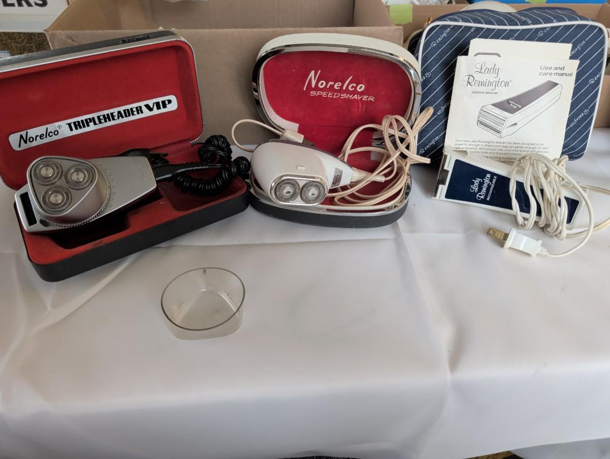 Two Norelco vintage electric razors, they do work. One woman's rechargeable Remington razor.