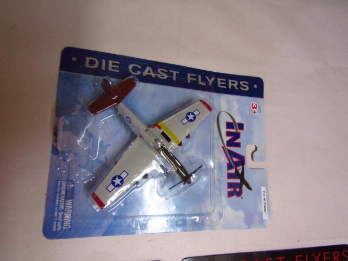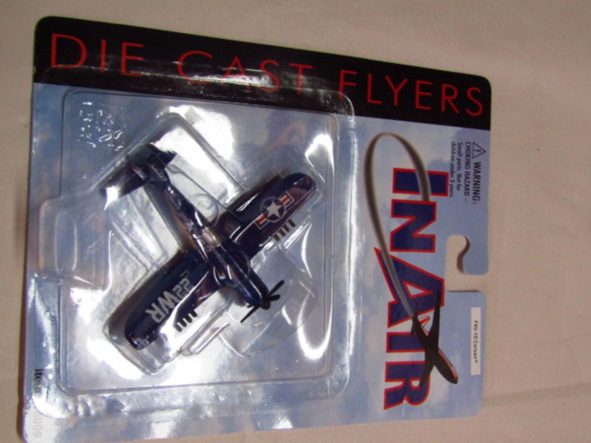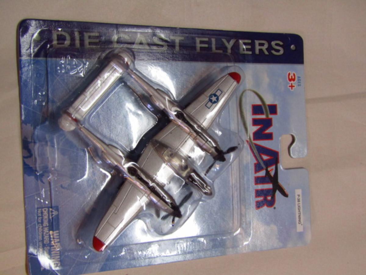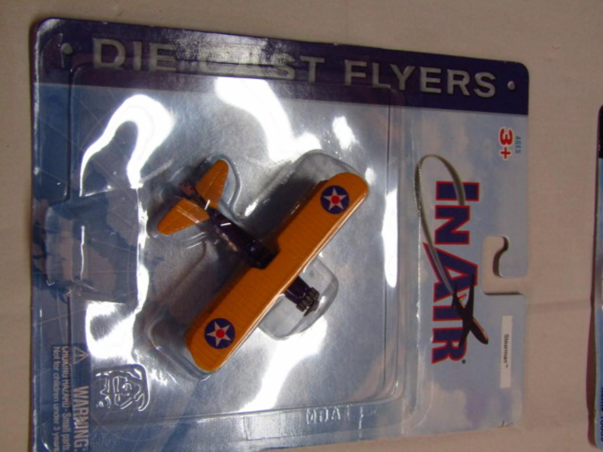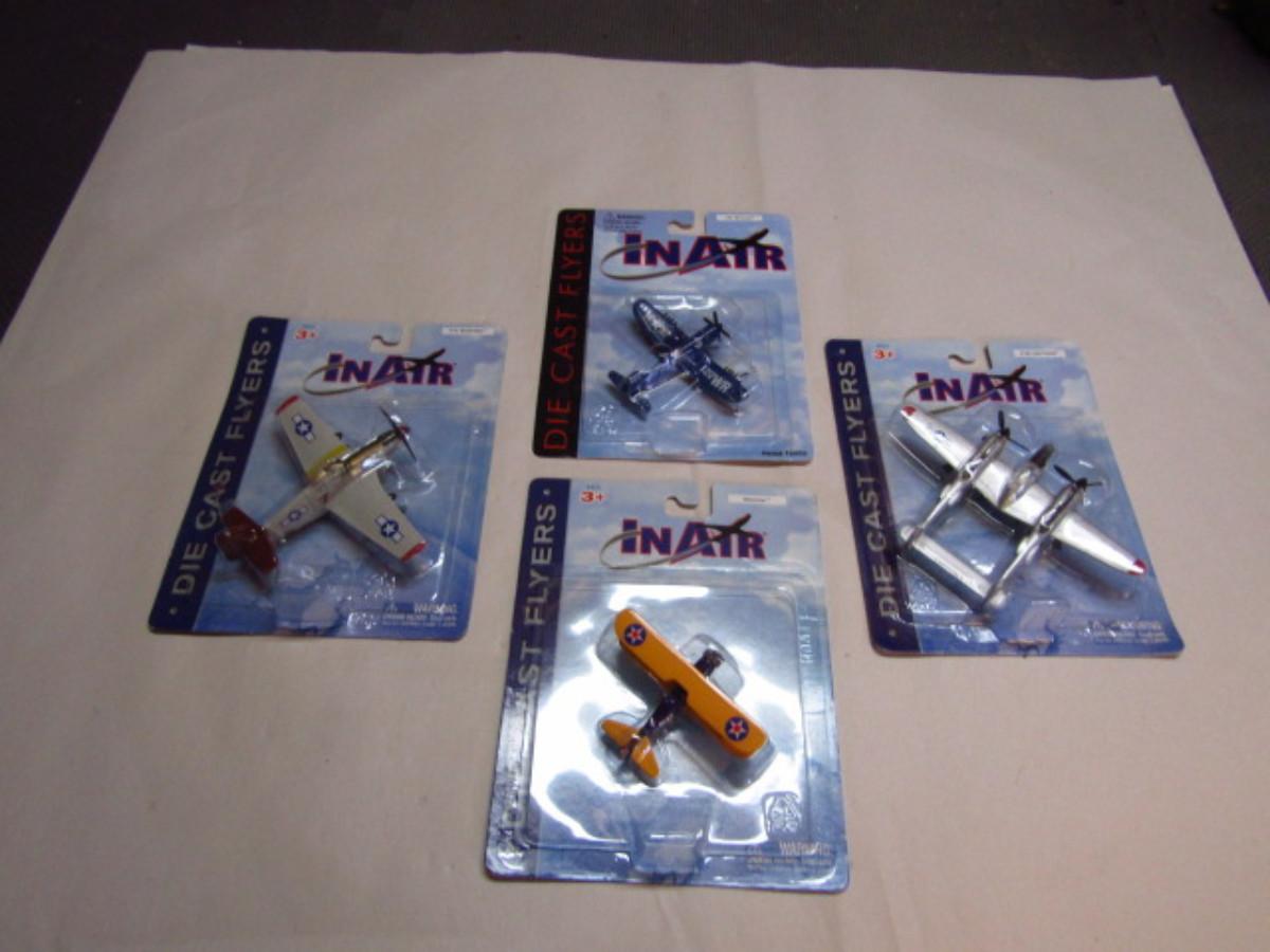 Group of Four 'In Air' Die Cast Flyers (G). P-51 Mustang, Stearman, F4U-1D Corsair, P-38 Lightning.