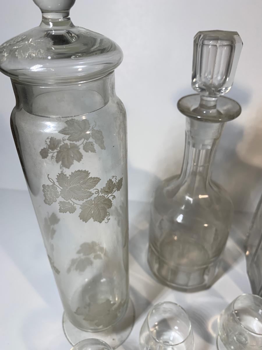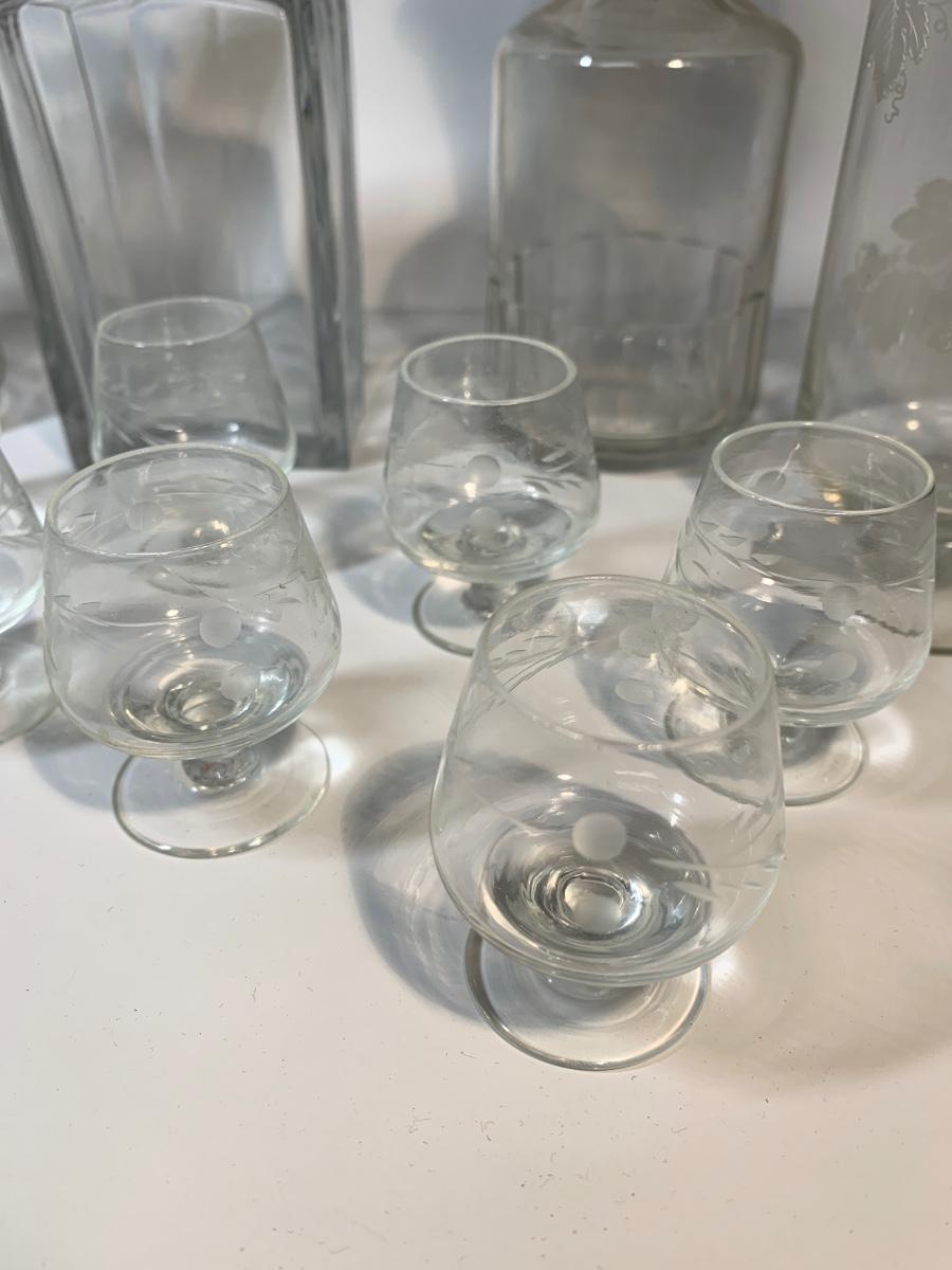 Quality glass decanters together with mini brandy glasses beautifully etched