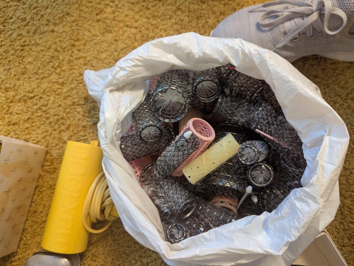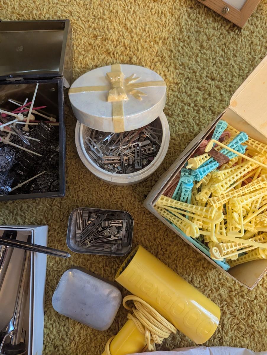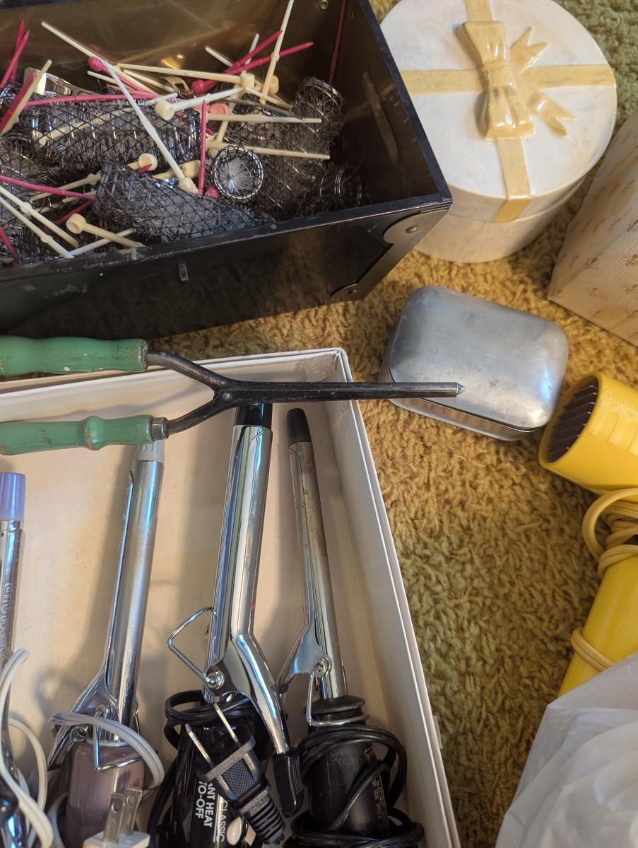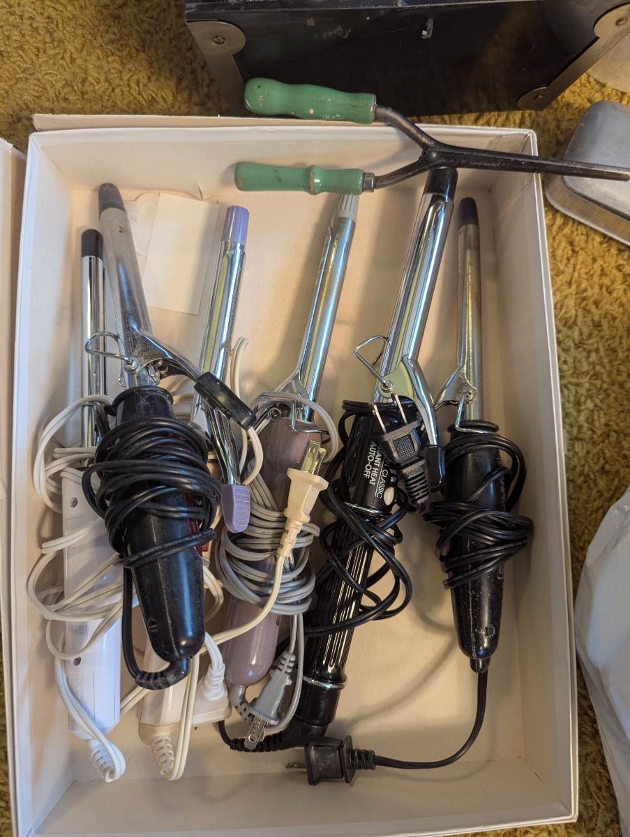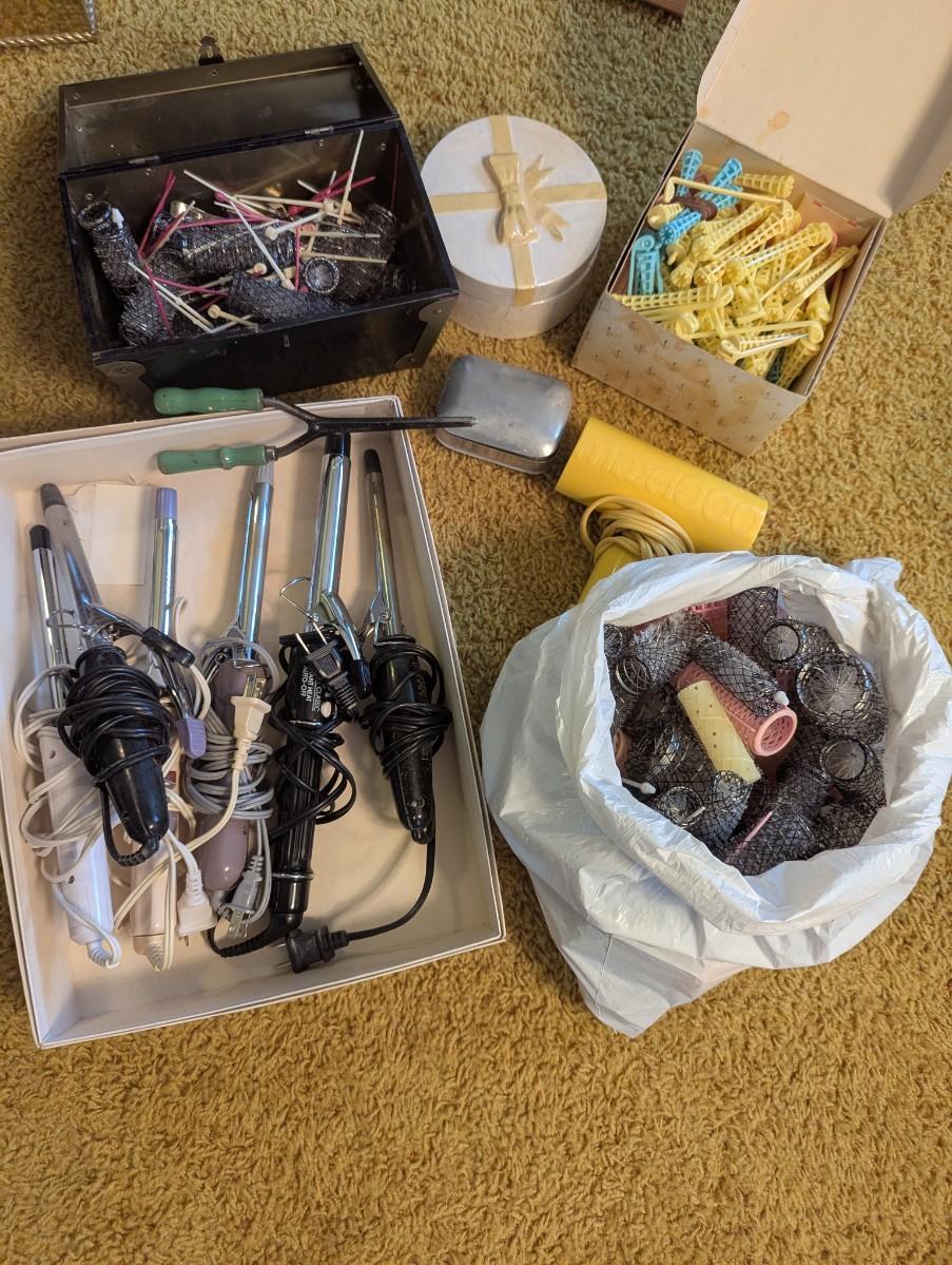 Curling iron, rollers, perm rods, blow dryer, pins.