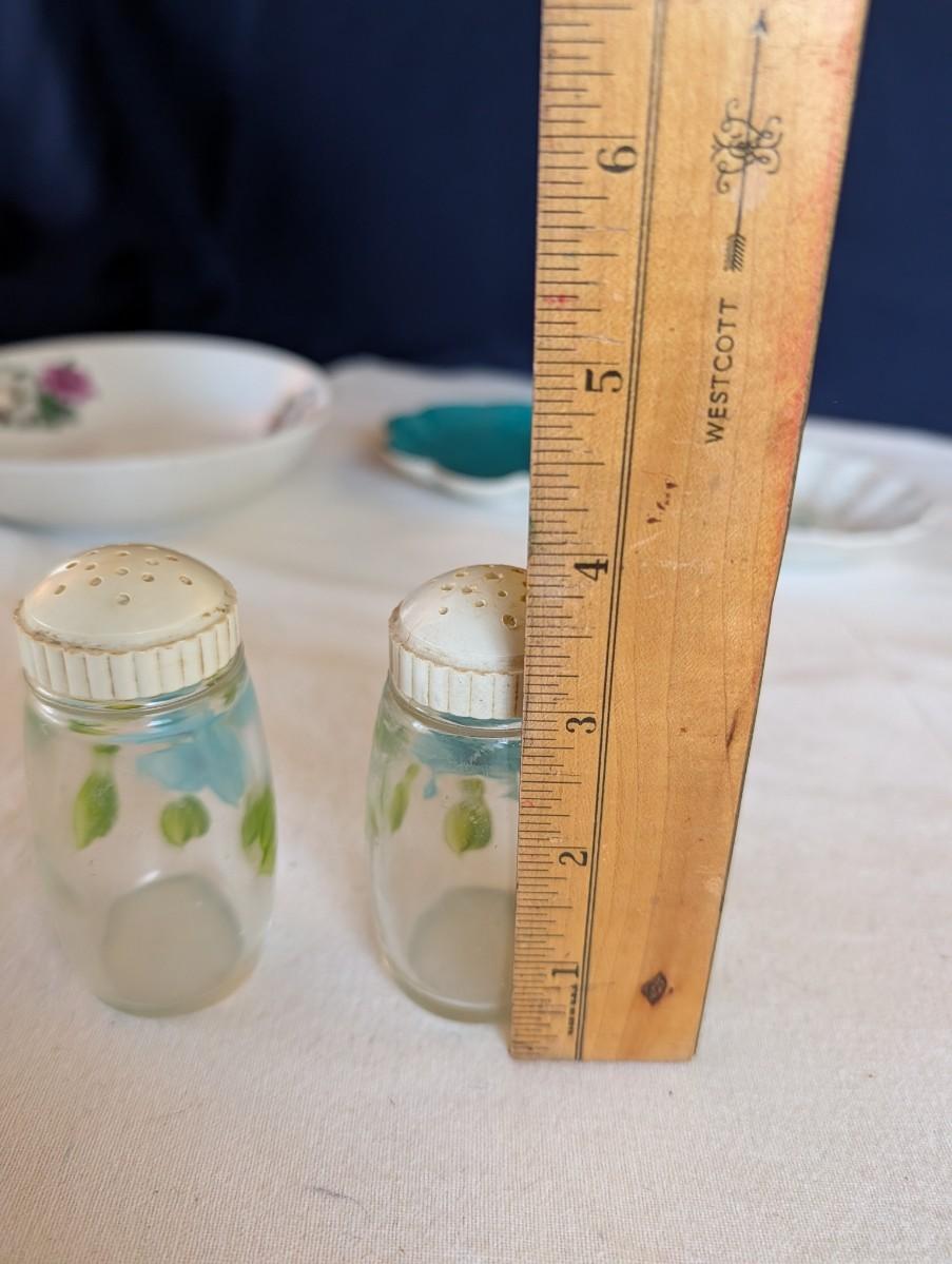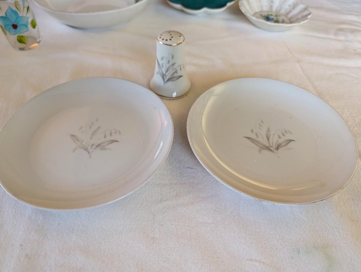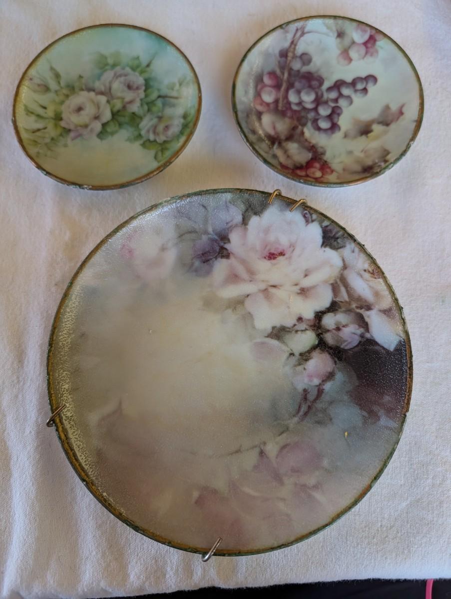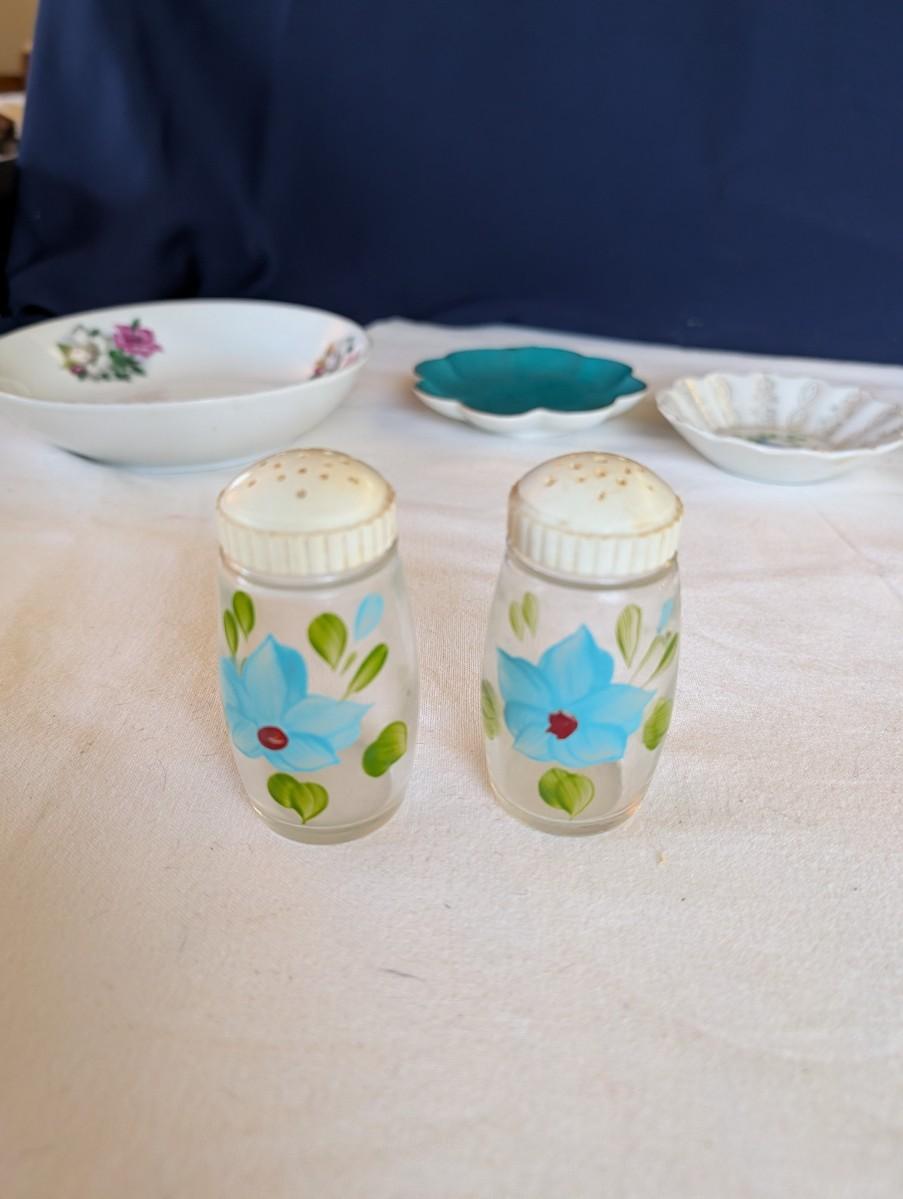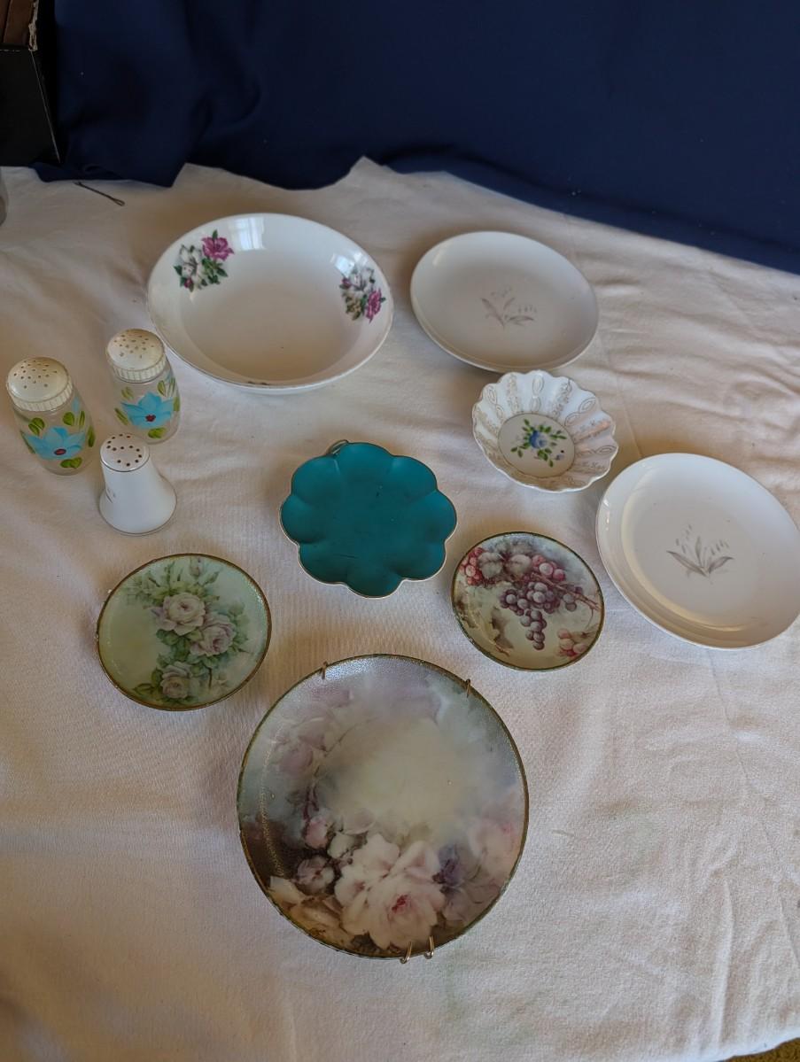 3 hand painted plates with hangers on the back. Hand painted salt and pepper shakers, salt shaker, 2 small china plates, bowl with beautiful flowers. 2 miscellaneous small dishes.