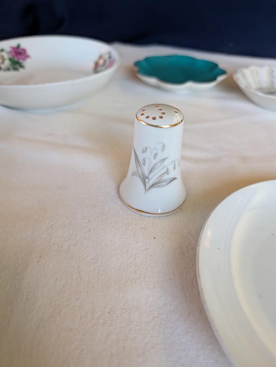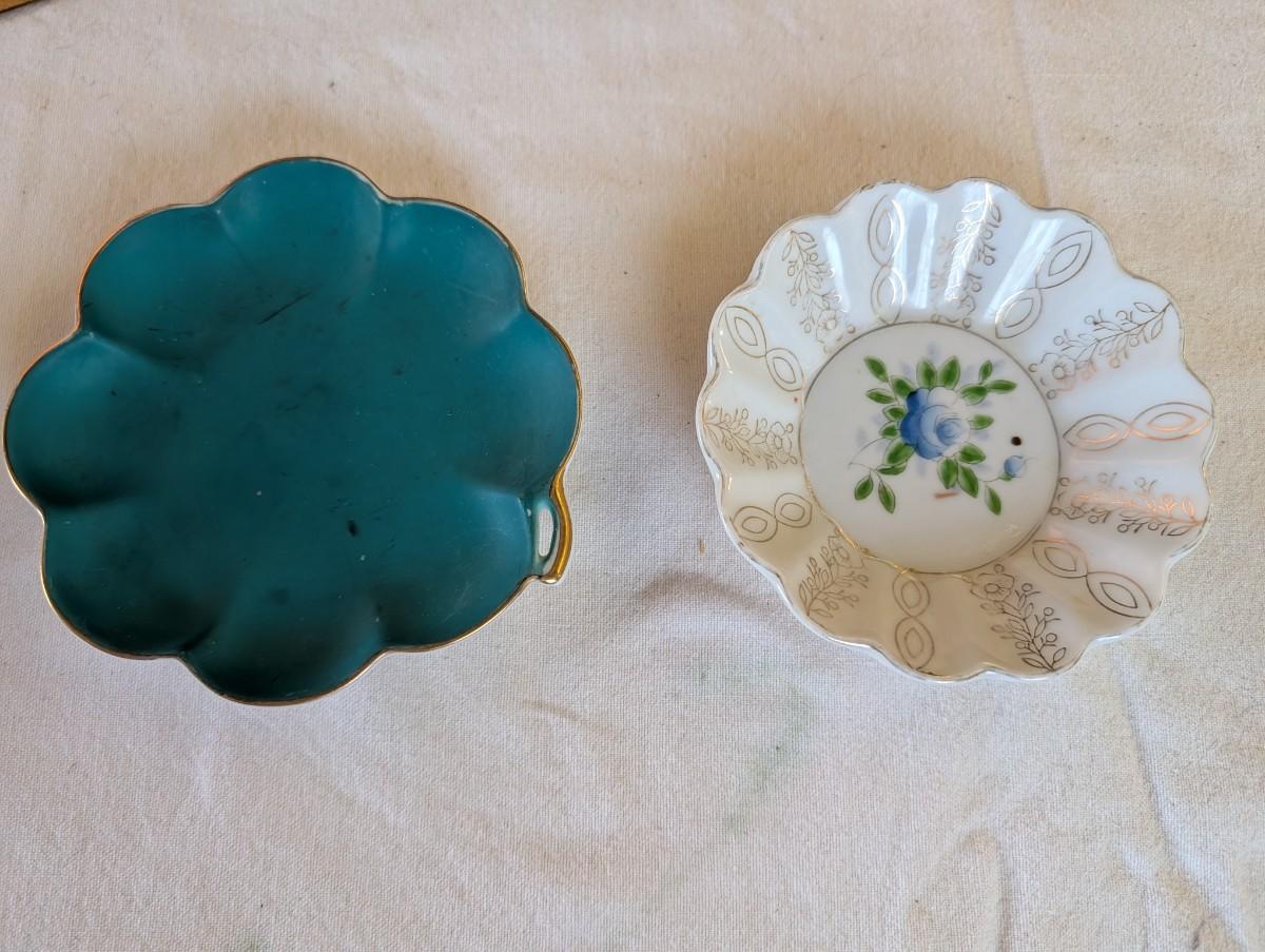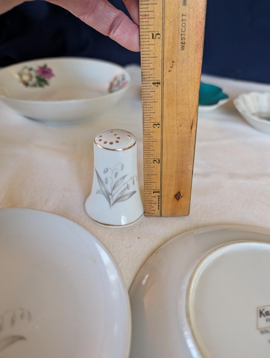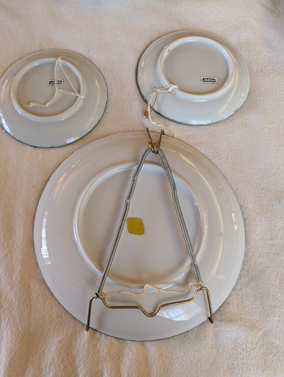 3 hand painted plates with hangers on the back. Hand painted salt and pepper shakers, salt shaker, 2 small china plates, bowl with beautiful flowers. 2 miscellaneous small dishes.