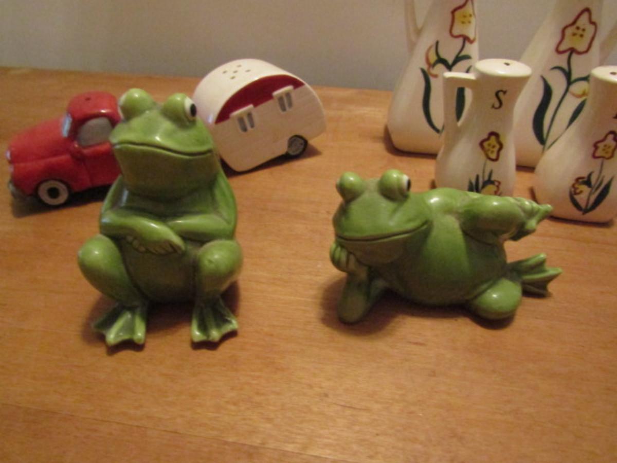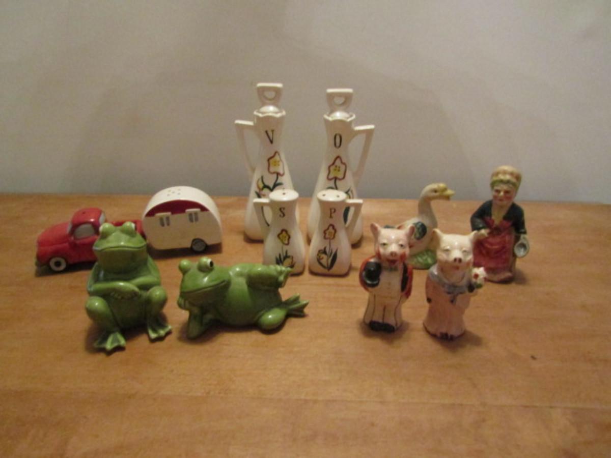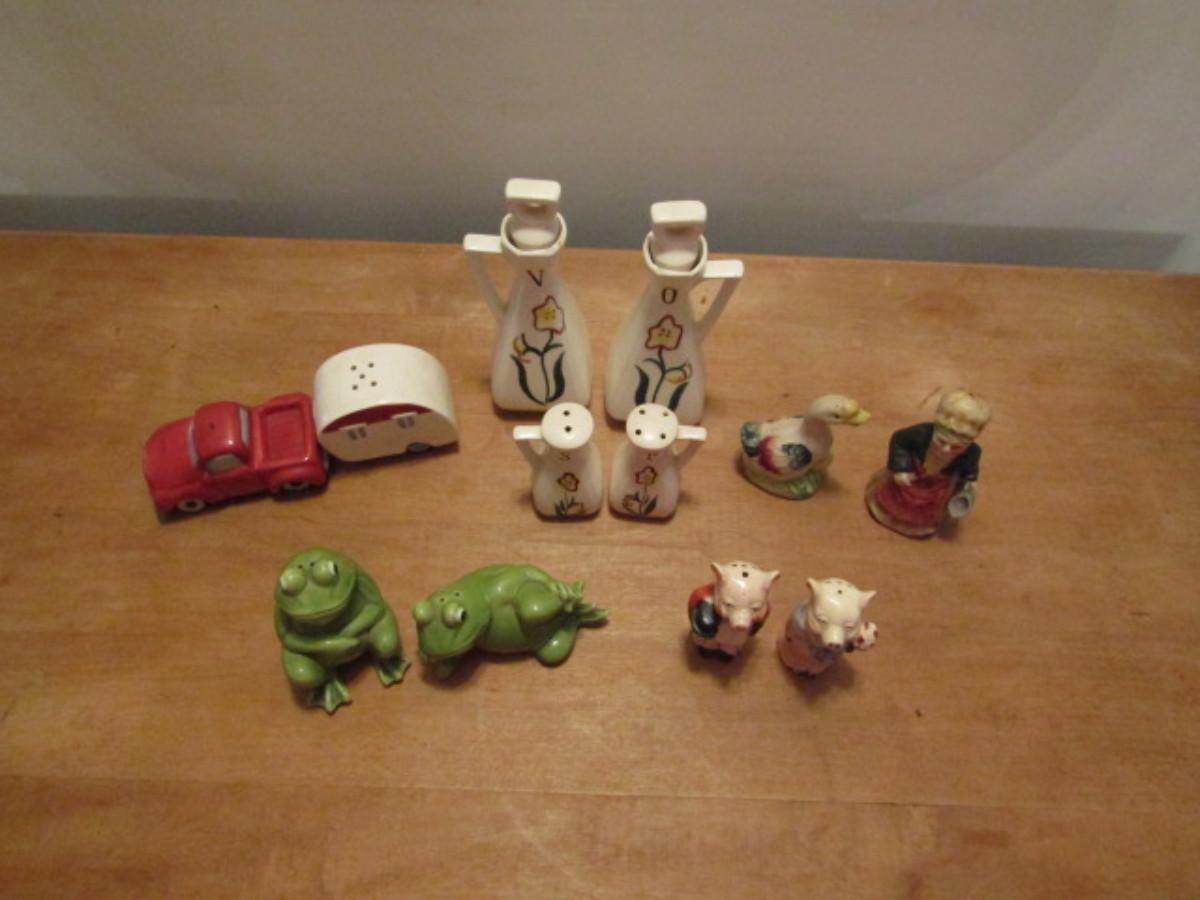Group of Salt and Pepper Shakers. Matching oil and vinegar cruets included with one set. Some need bottom cork/plug.