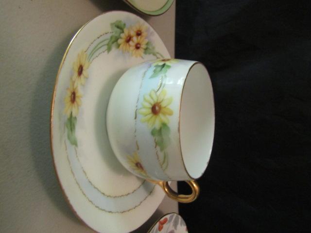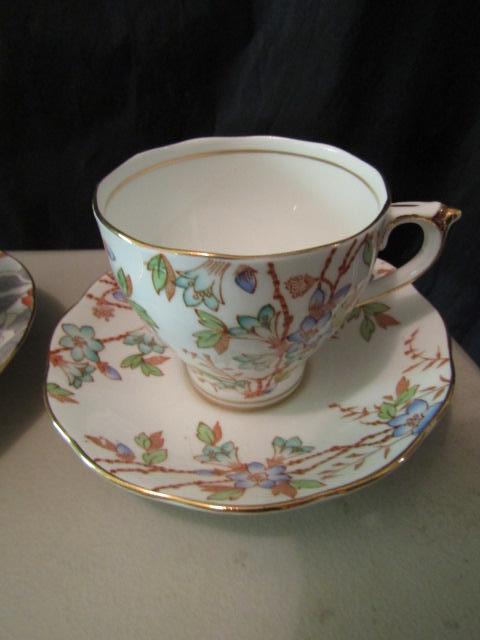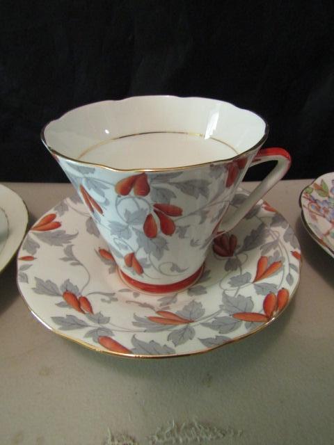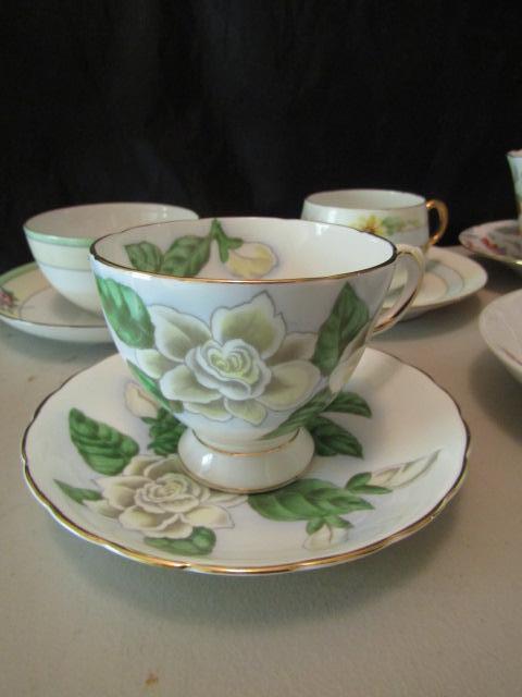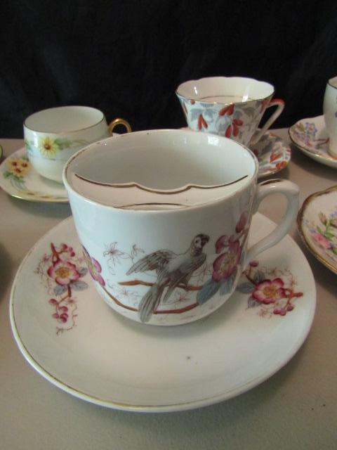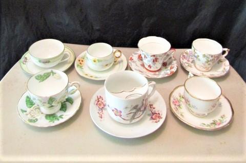 Group of Seven Fine Bone China Cups and Saucers- Assorted Makers (One is a Mustache Cup)