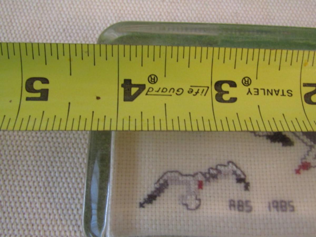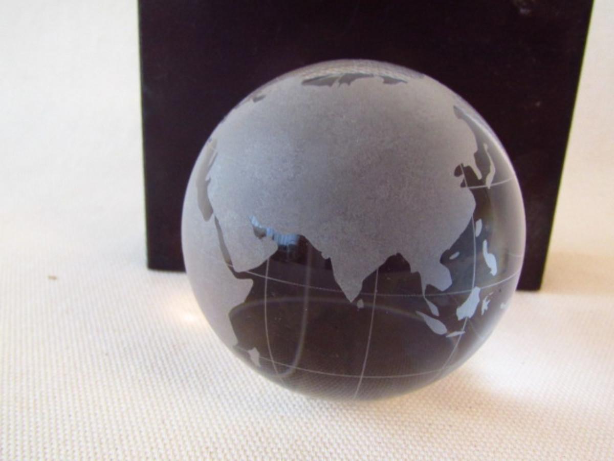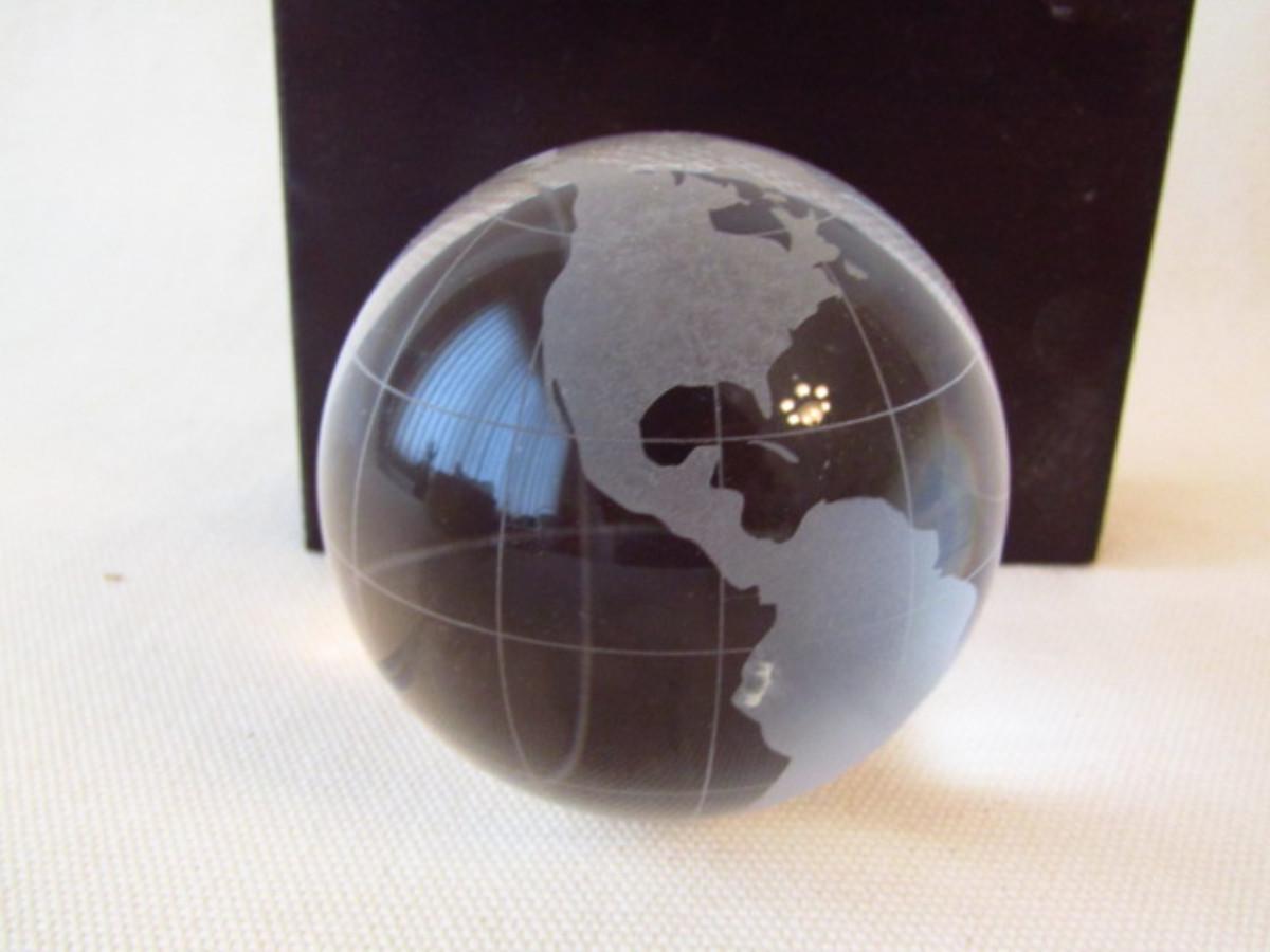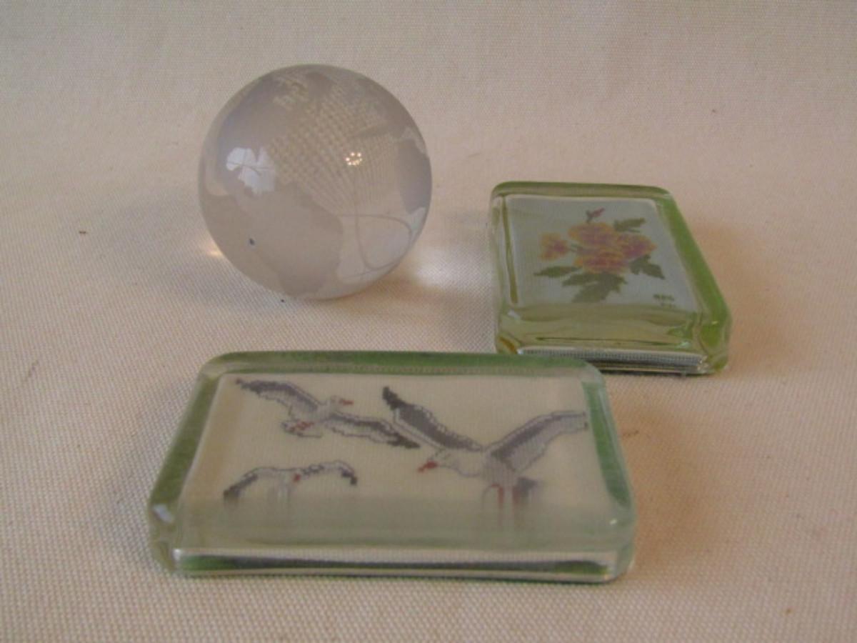Group of Three Paperweights. Round globe is unsigned. Rectangular pieces are needlework topped with glass.