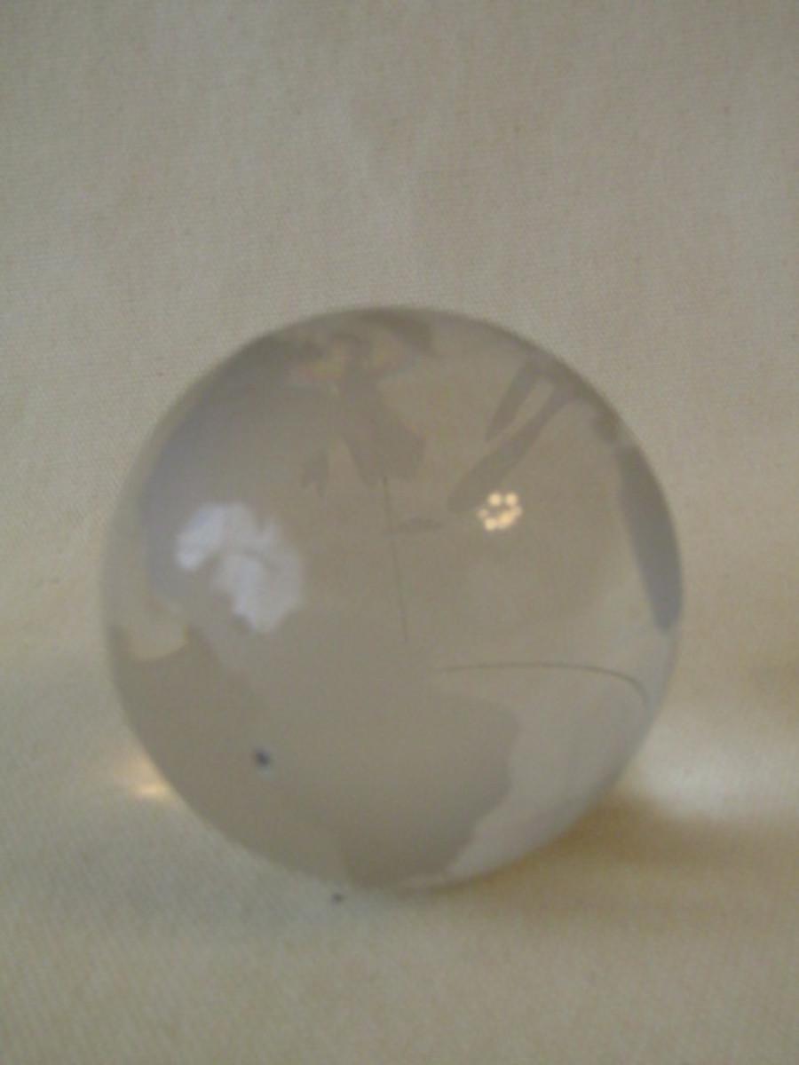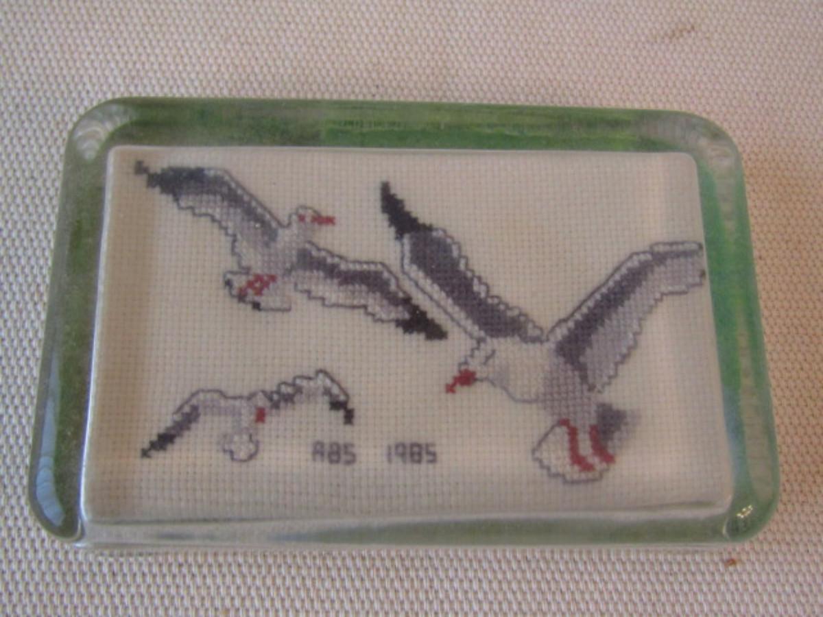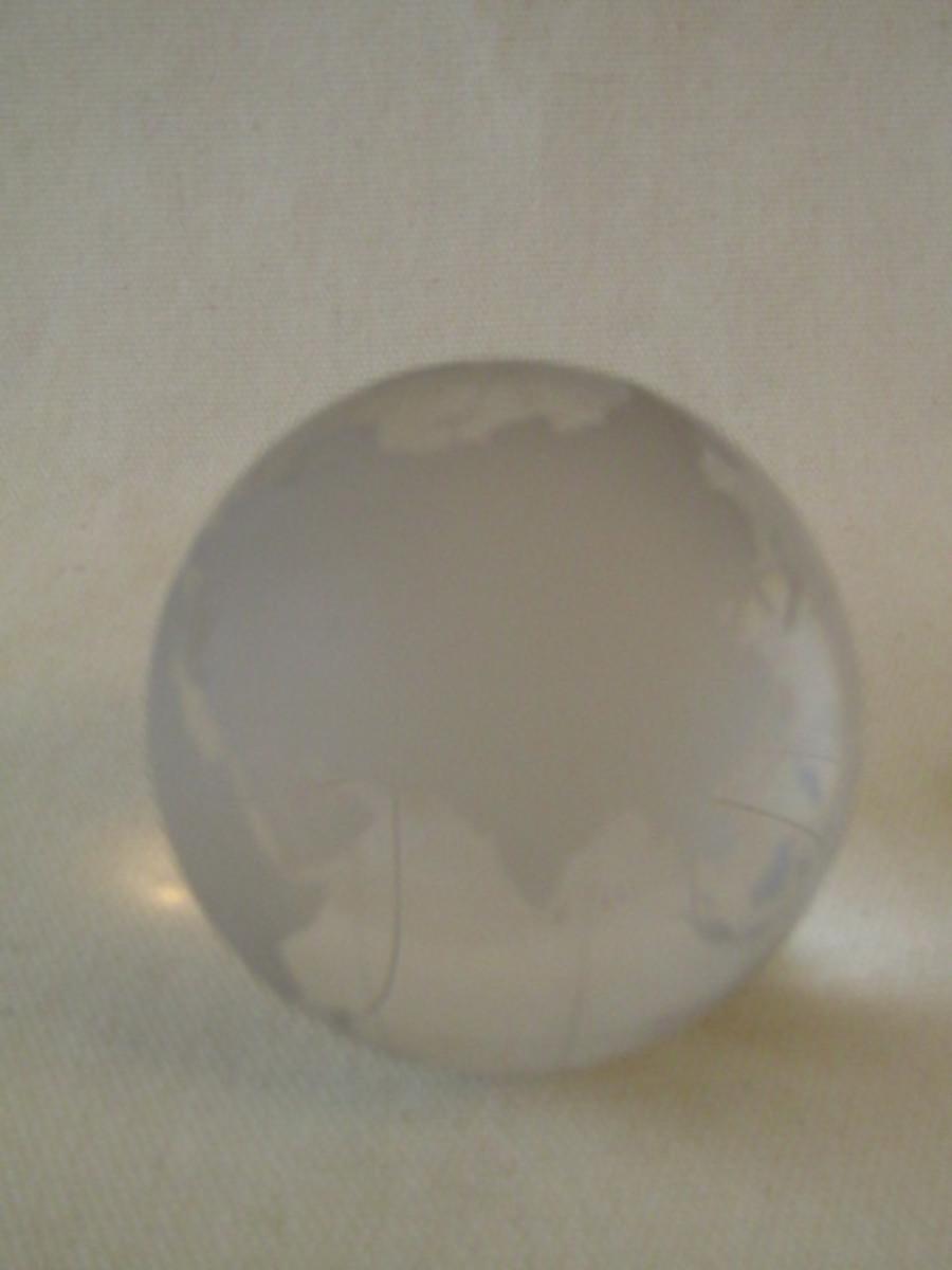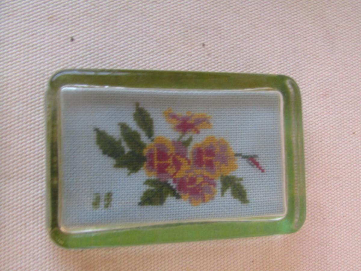 Group of Three Paperweights. Round globe is unsigned. Rectangular pieces are needlework topped with glass.