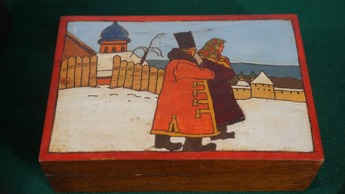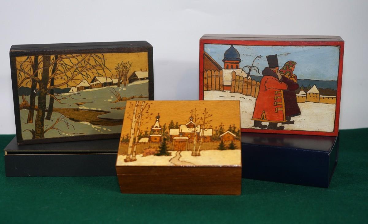 GROUP OF THREE VINTAGE WOODEN HINGED RUSSIAN PYROGRAPHY LID BOXES/ HAND DECORATED - GREAT GIFT IDEA
