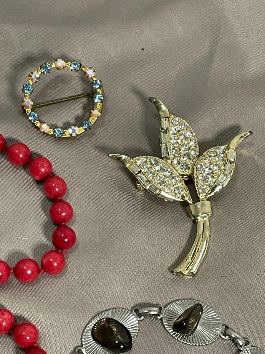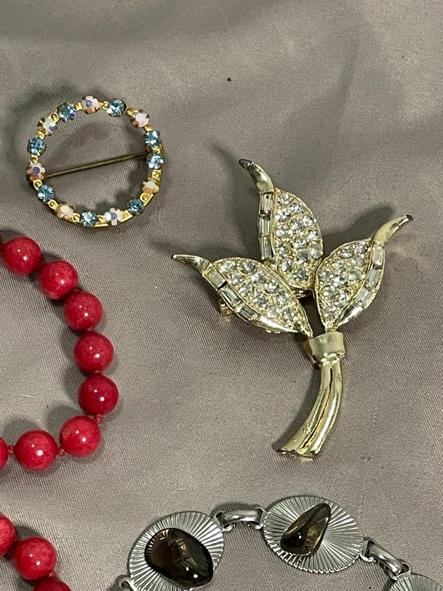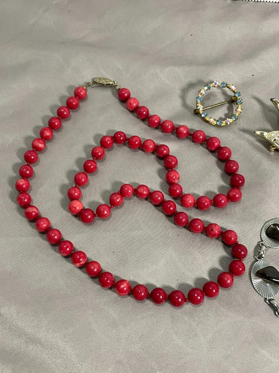 The red beaded necklace appears to be glass beads and is heavy. All of the other pieces are costume and unmarked.