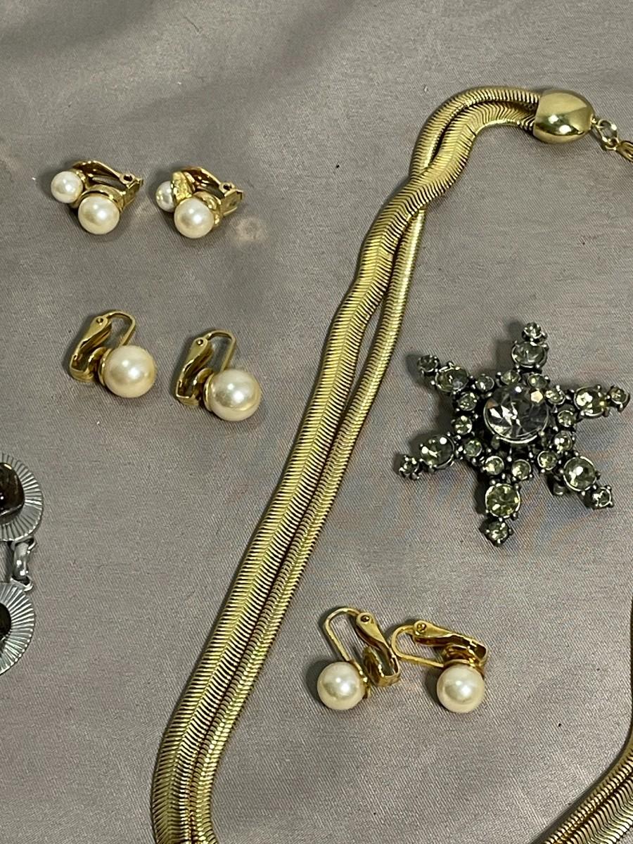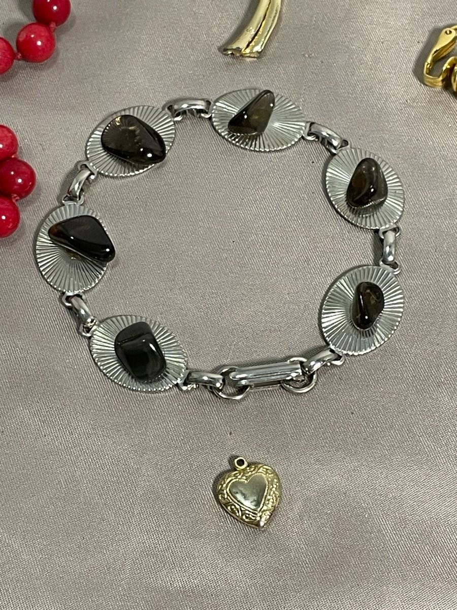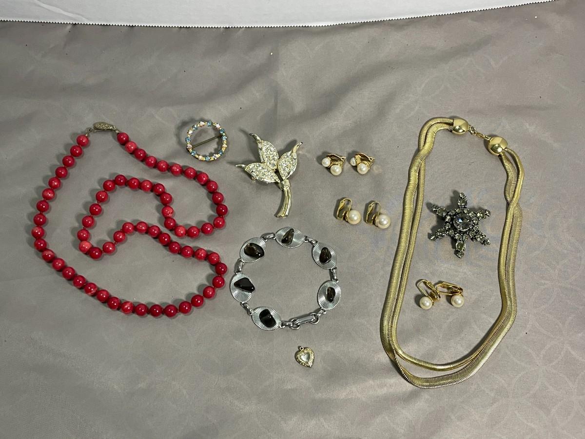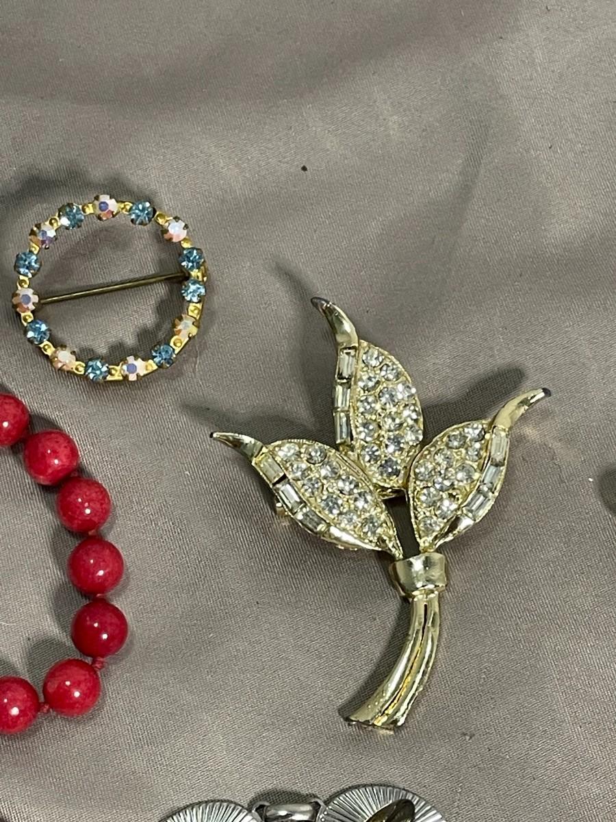 The red beaded necklace appears to be glass beads and is heavy. All of the other pieces are costume and unmarked.