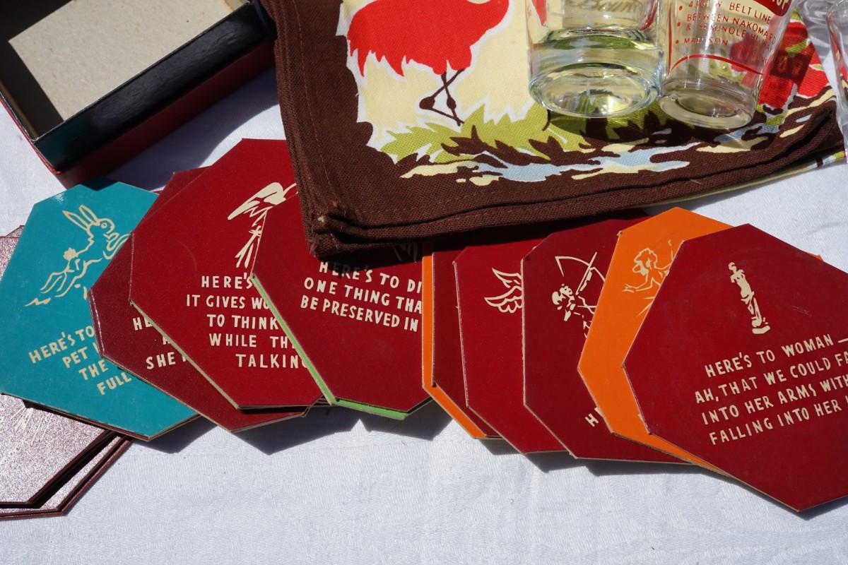the Tom Collin glasses have heat transfers of the Seattle Works Fair _ blue and the other is for the introduction of world Transit. both are in good condition. The box of coasters is a comical assortment of different verses of bar comics. All in the original box and have not been used