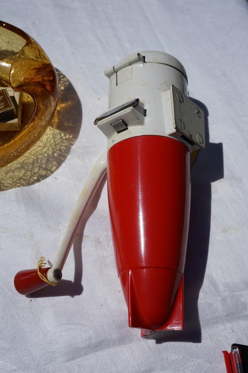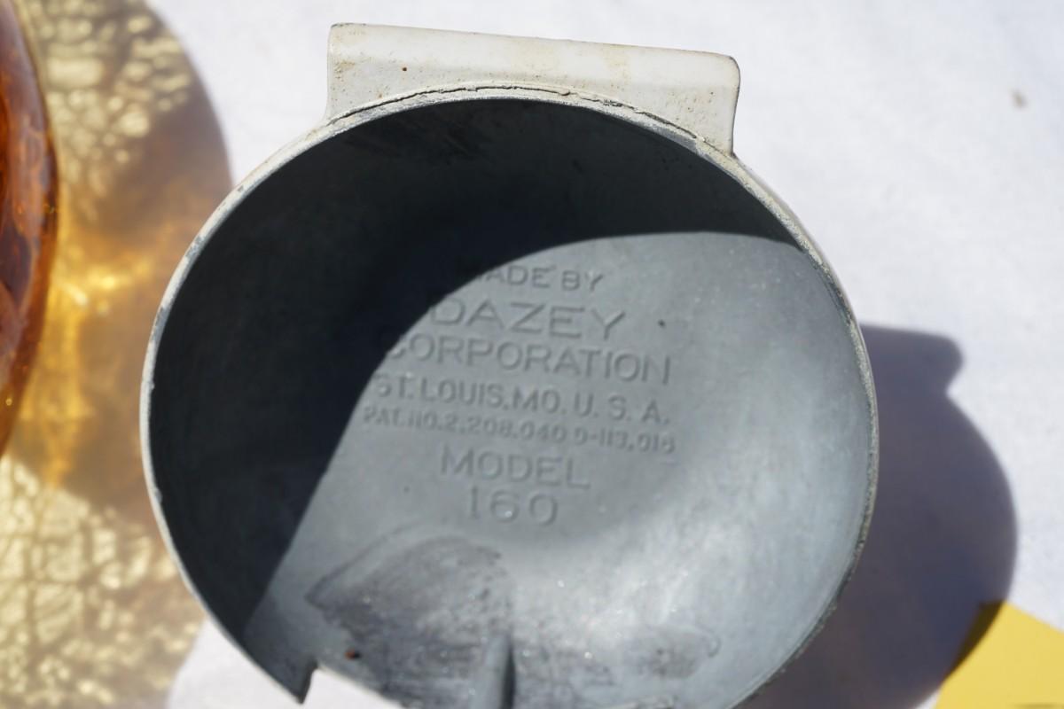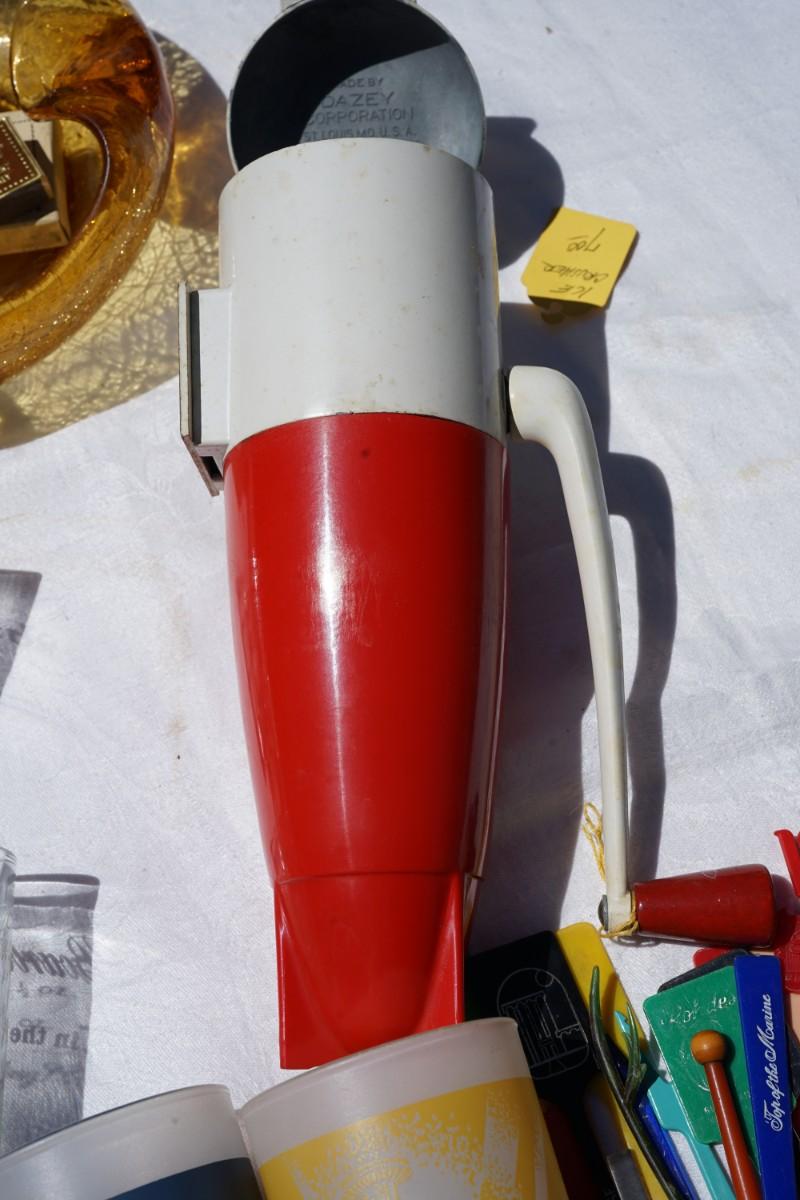 the Dazy ice crusher from the 50's mounts by the bar. turn the crank and hold down the lid to crush ice into the cup. This is in very good condition. clean and the label is on the base . The Dazyt is red and white.