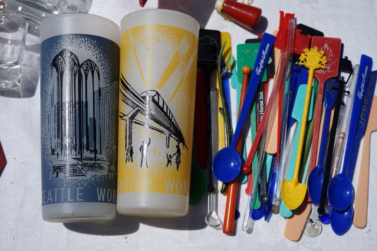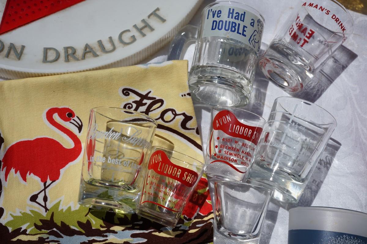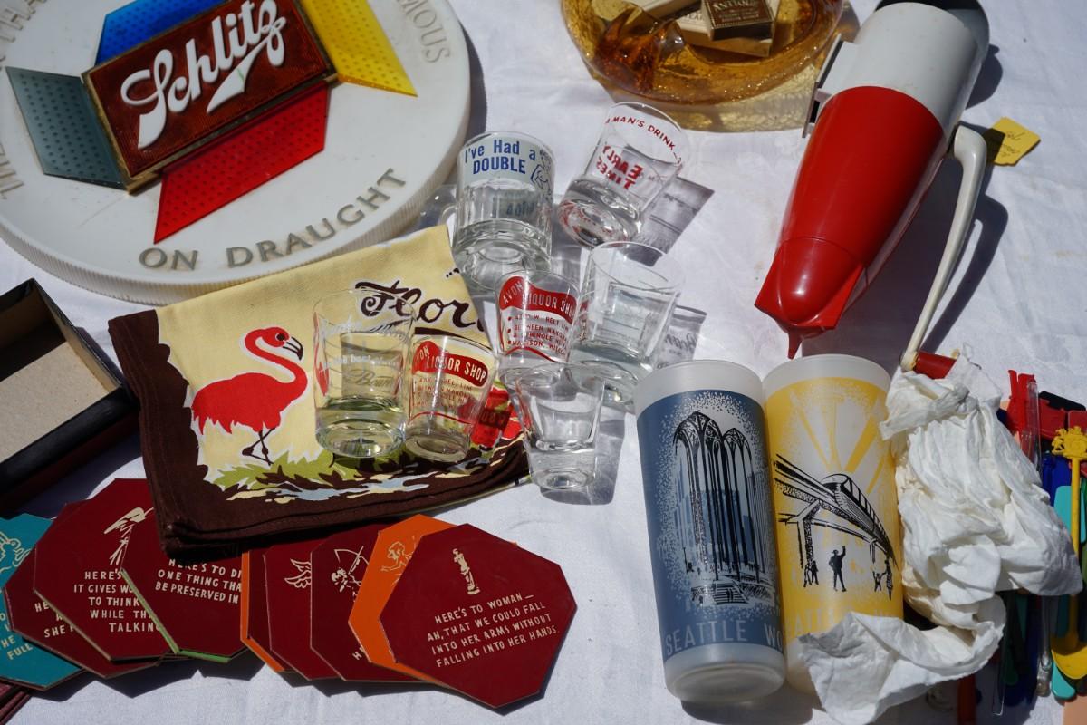 GROUP VINTAGE LOT SHOT GLASSES, JOKE COASTERS, DAZY ICE CRUSHER/ SEATTLES WORLDS FAIR ICE TEA GLASS
