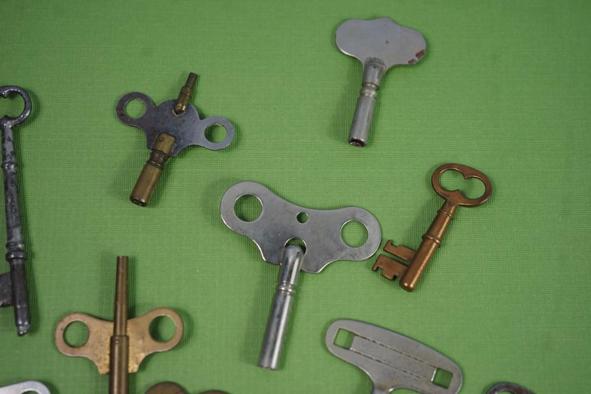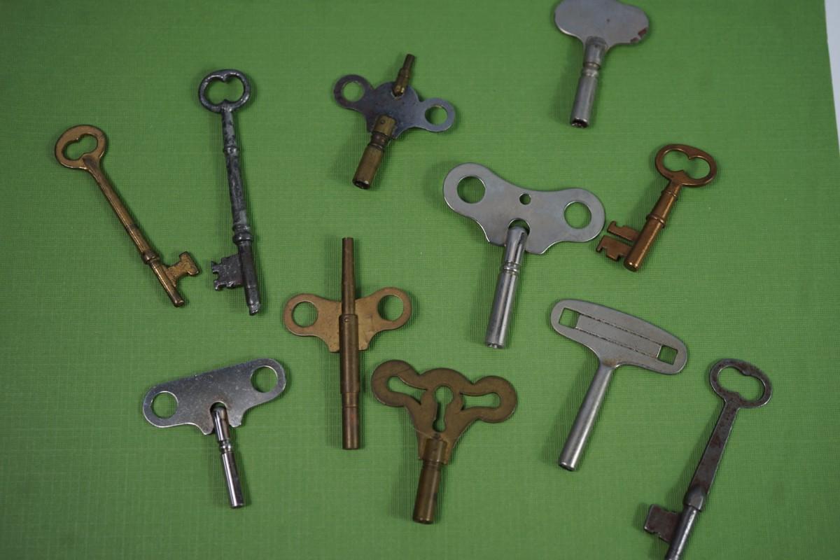 GROUPING OF 11 ANTIQUE KEYS SKELETON, CLOCK KEY MIX