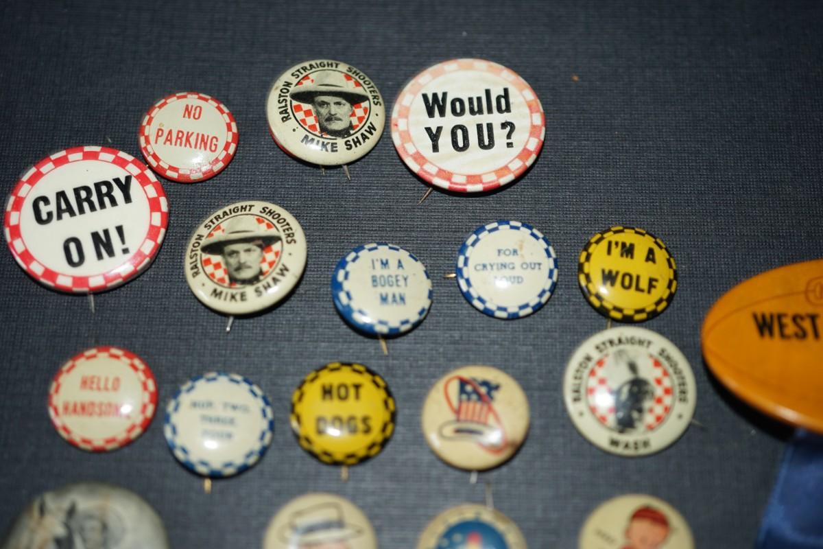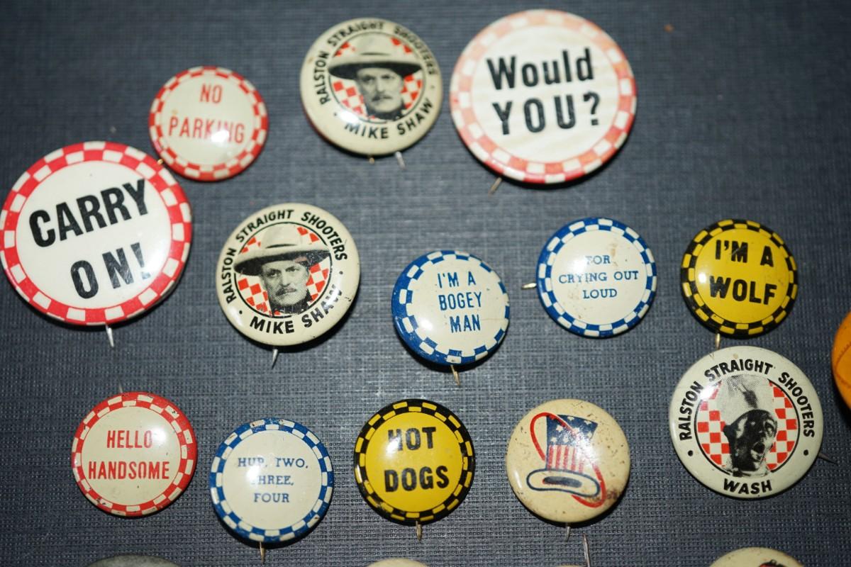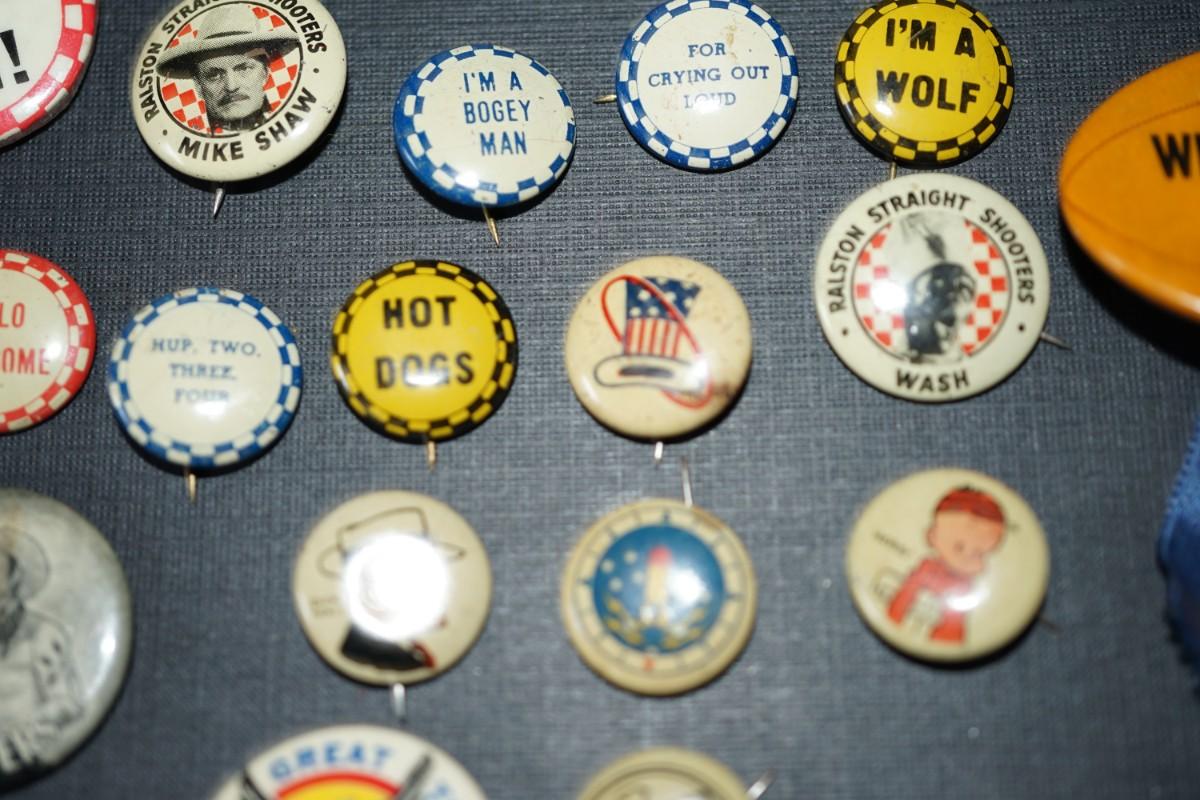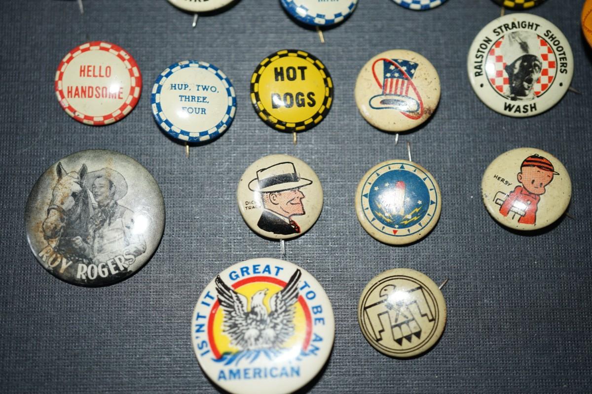vintage cereal box pins and other. 1940's and up.