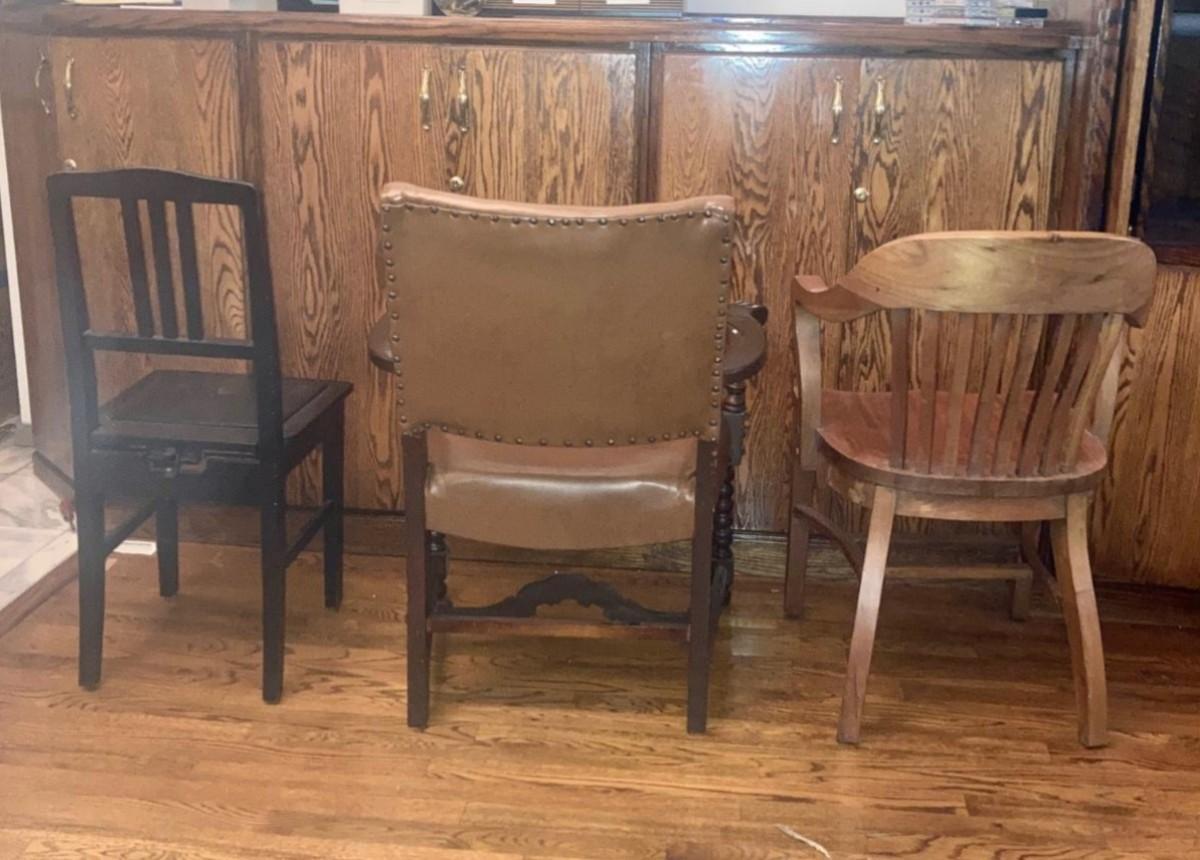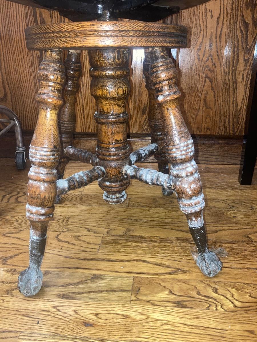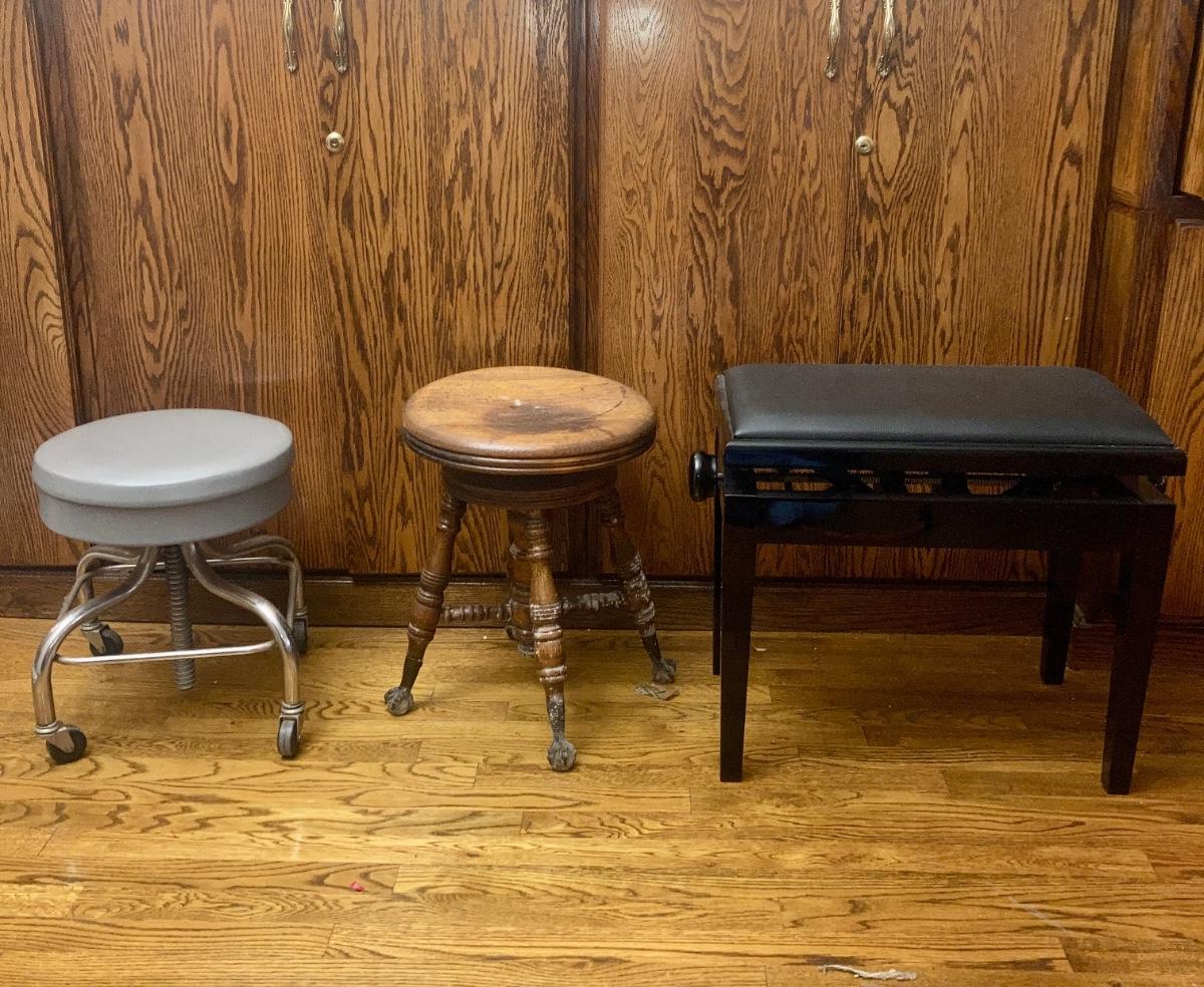 2 round top stools with adjustable seats seat diameter 13” and 14” ** SEE PHOTOS wood stool has mildew on 2 of the legs“¢“¢ 1 piano bench 23” x14” x 19”