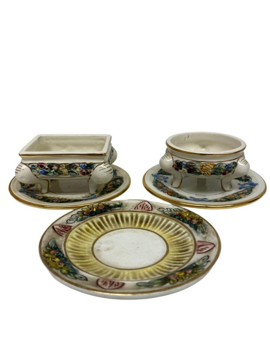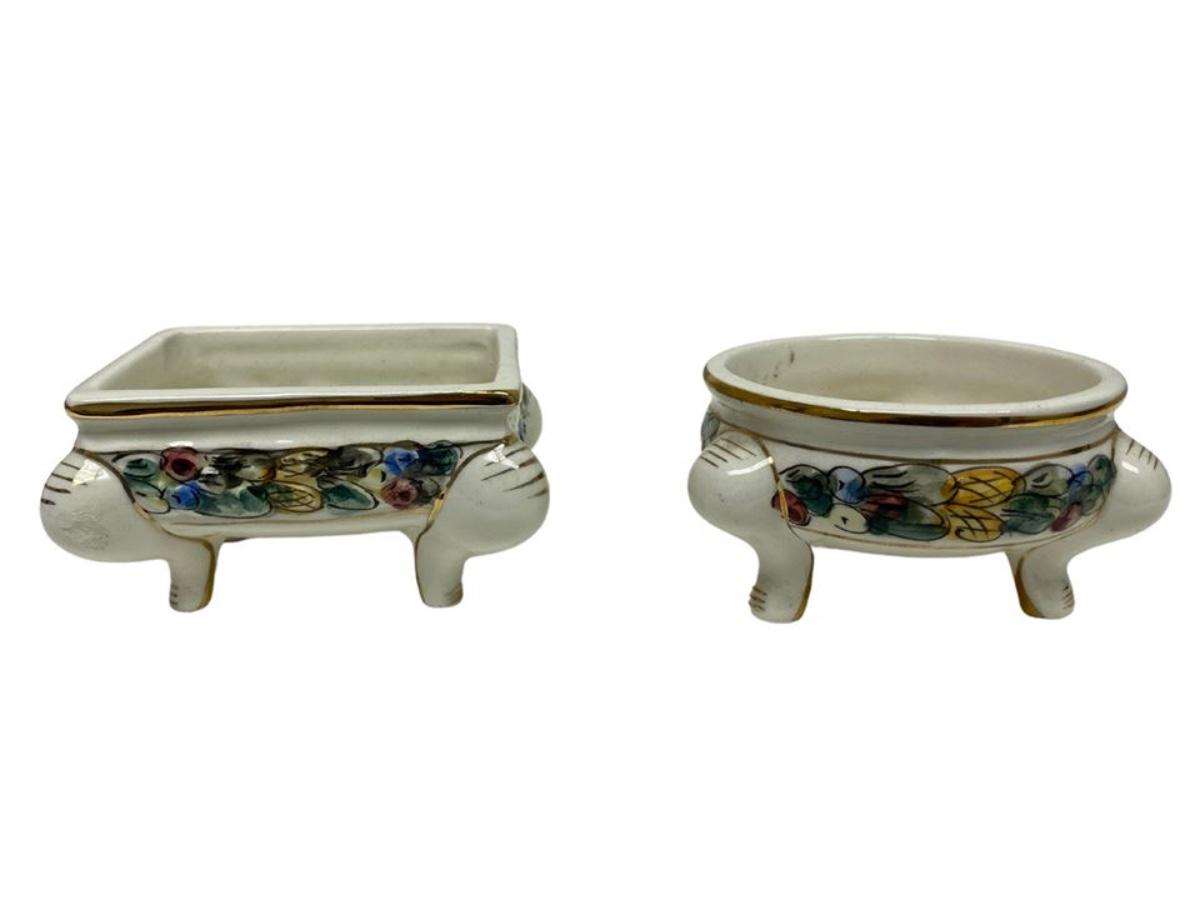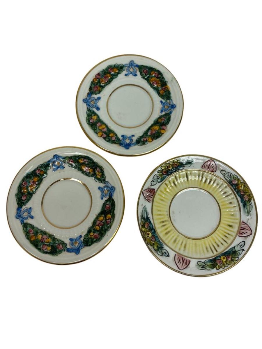 2 trinket bowls & 3 small plates. Trinket bowls measures approx.3.5"W x1.75"H x 3"D, other measures approx. 3" diameter x 1.75"H. One trinket bowl has slight damage, shown in photos. Plates measure approx. 5" diameter. Plates have some paint rubbing off and would benefit from a cleaning.