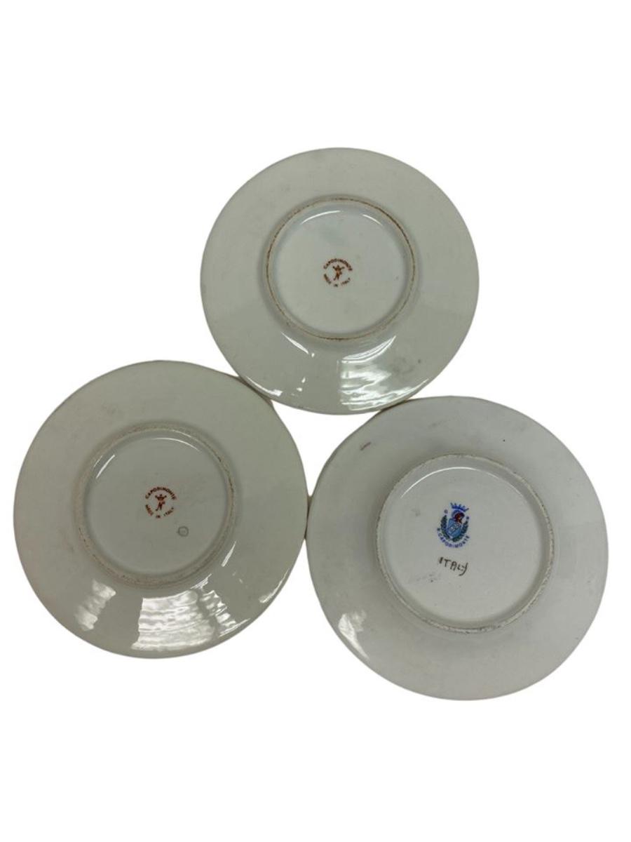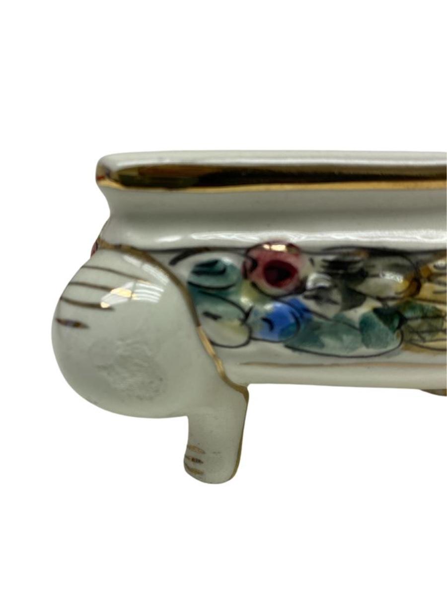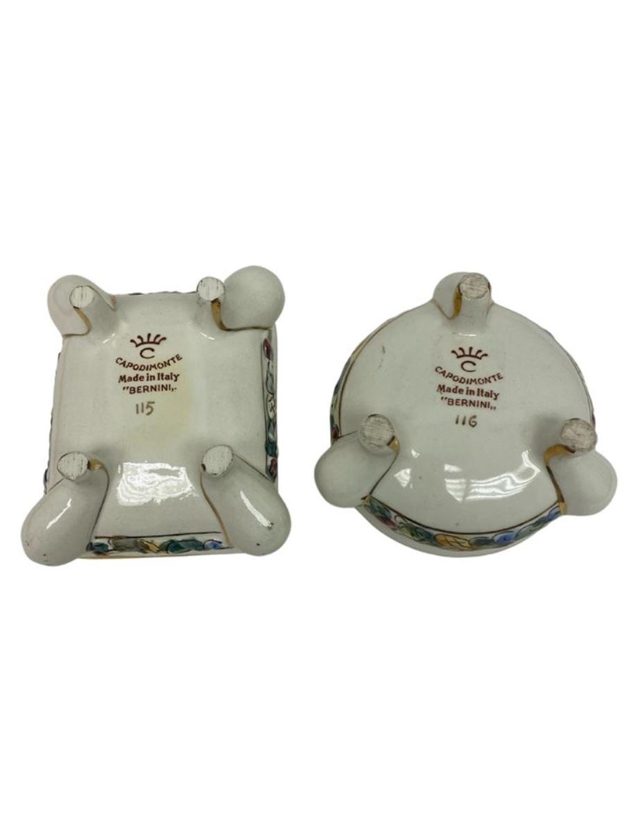 2 trinket bowls & 3 small plates. Trinket bowls measures approx.3.5"W x1.75"H x 3"D, other measures approx. 3" diameter x 1.75"H. One trinket bowl has slight damage, shown in photos. Plates measure approx. 5" diameter. Plates have some paint rubbing off and would benefit from a cleaning.