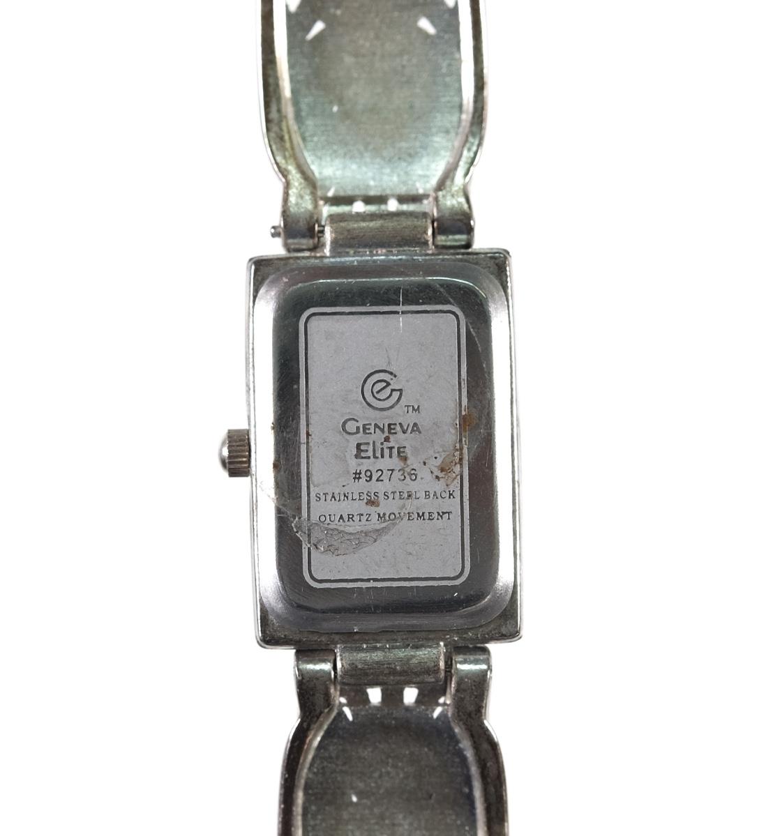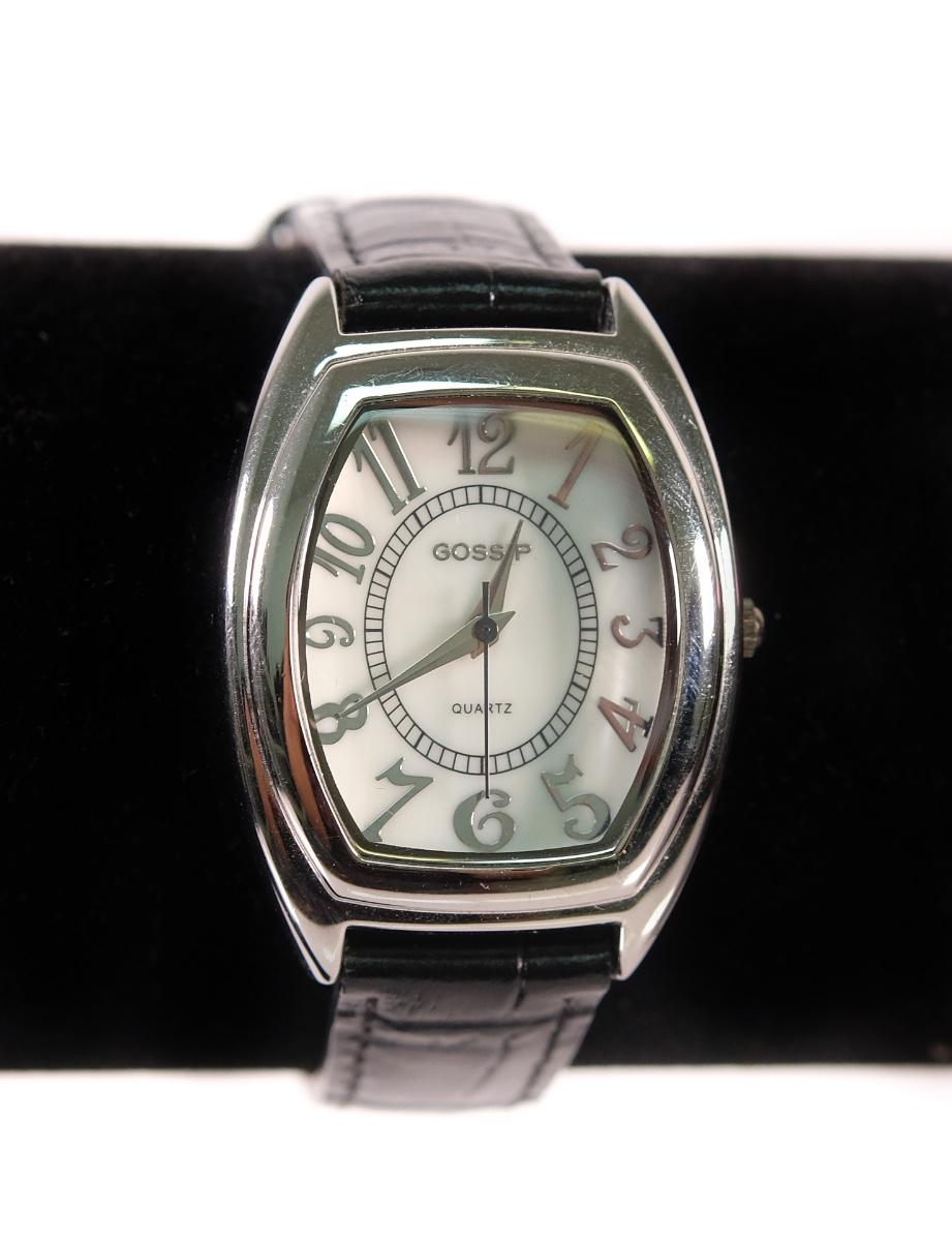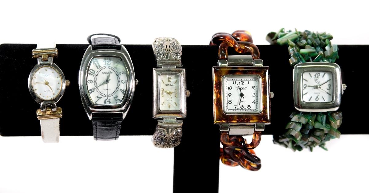 5 watches total. Gossip(7" band length), Peugeot(6.75" band length), Geneva(7.5" band length), CL(2.5" inner diameter), R.O.V(6" band length). Unsure of working condtion, they need new batteries.
