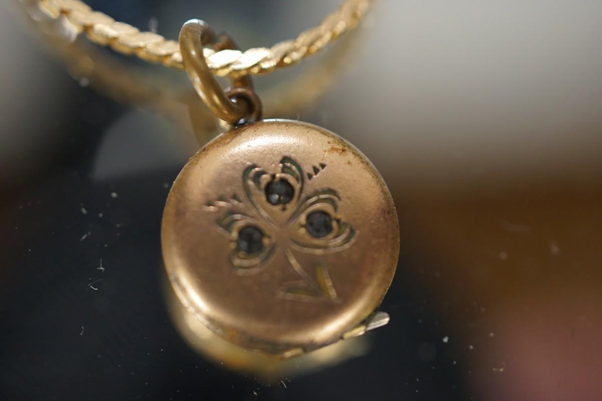 the locket is rose gold plate. tiny rhinestones, very worn and the locket doesn't open. 1/2" on non-vintage brass gold tone chain.