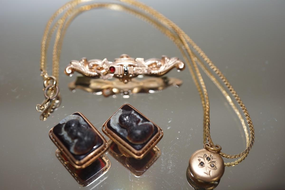 GROUPING OF ANTIQUE JEWELRY TO INCLUDE PINCH BACK BAR PIN/ MEN'S CAMEO CUFF LINKS/ TINY LOCKET