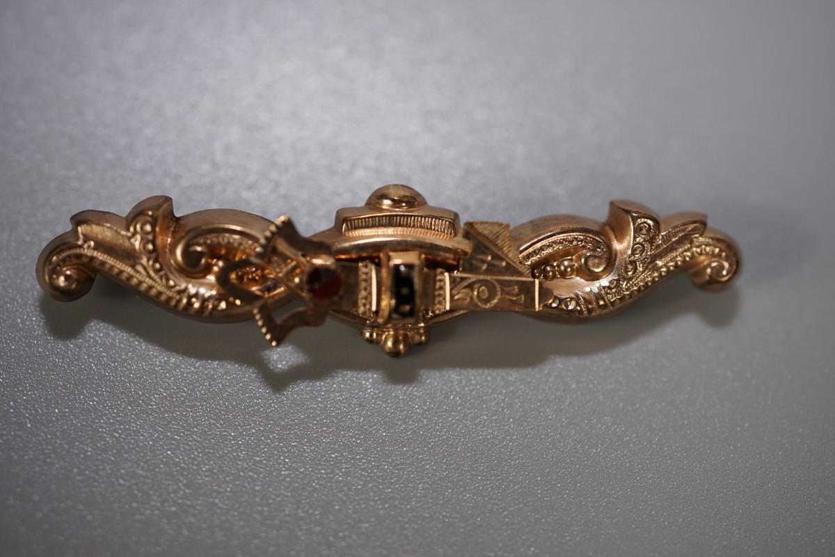 bar pin is rose gold plate. period engravings with garnet stone, replaced pin, length 2.'