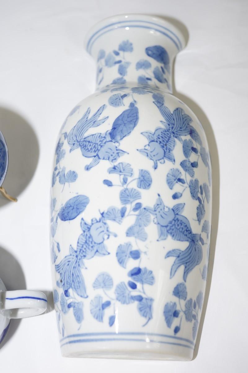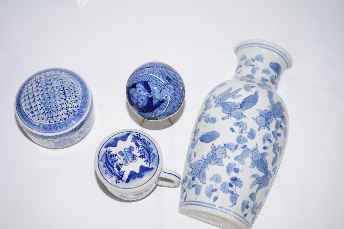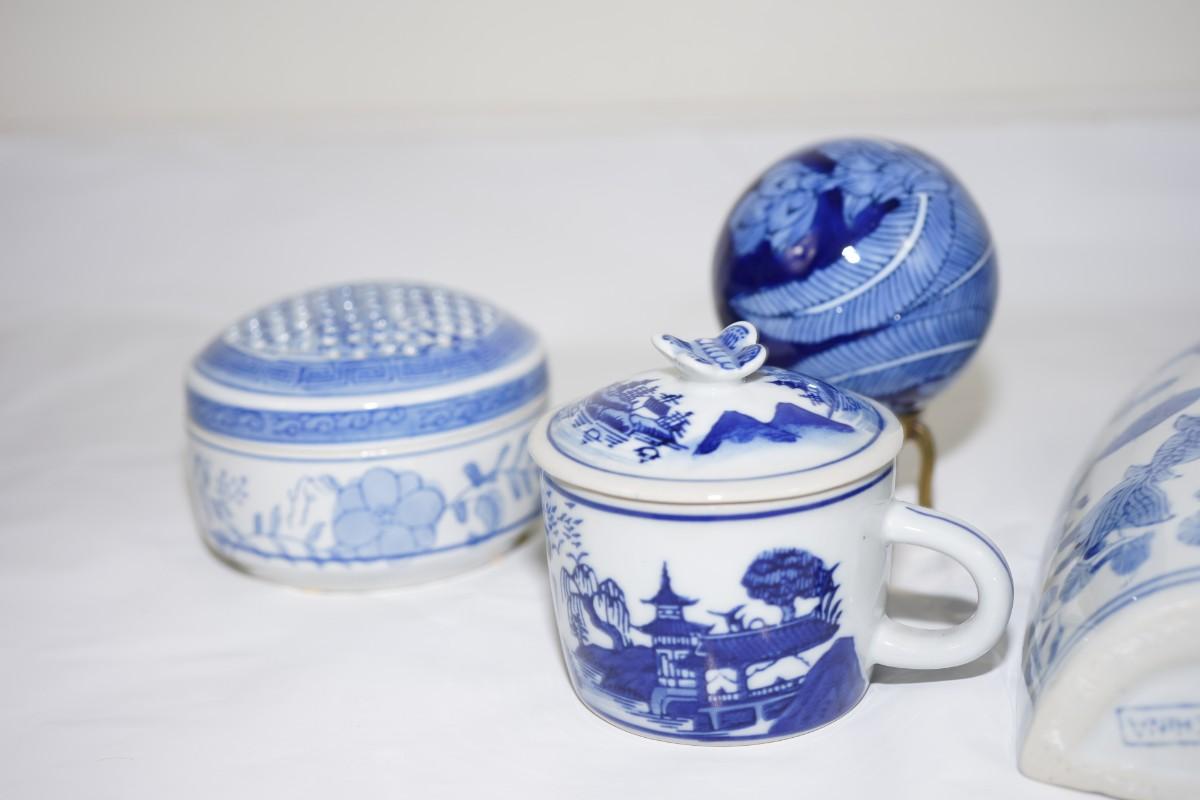 GROUPING OF CERAMIC BLUE & WHITE GLAZED ARTICLES TO INCLUDE BALL