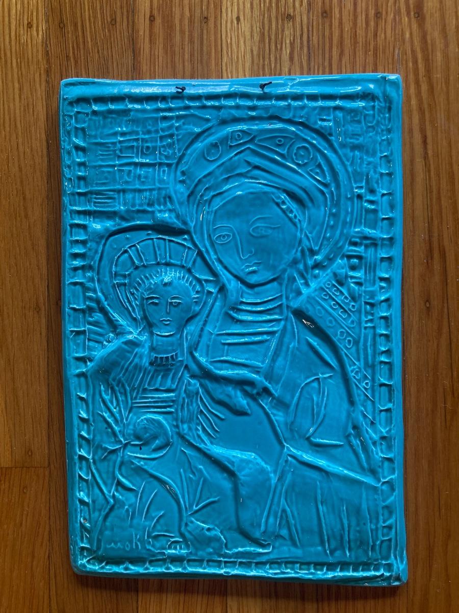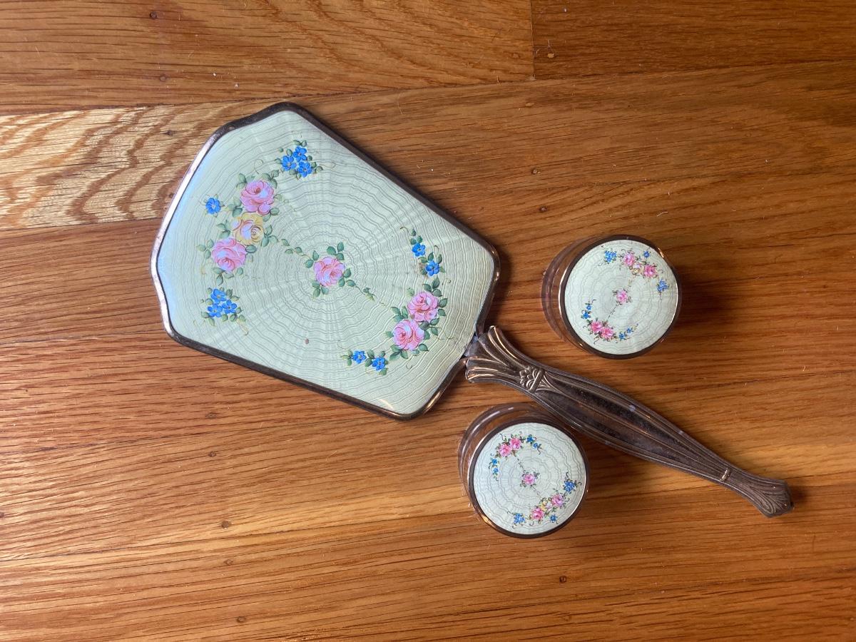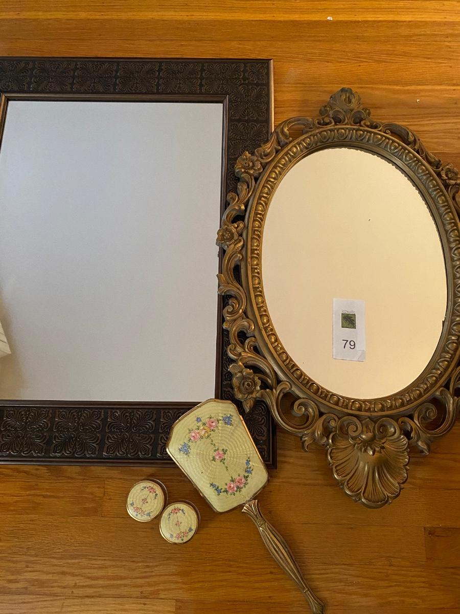 Lot consists of 2 mirrors one one composite and metal blue glazed religious motif decorative ceramic wall tile, handheld decorative mirror with 2 small matching lidded toiletry I accessories. W 19" x 29"