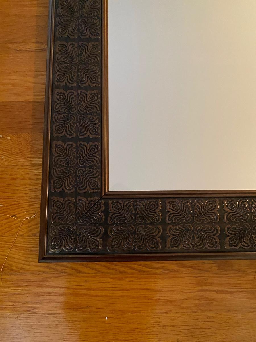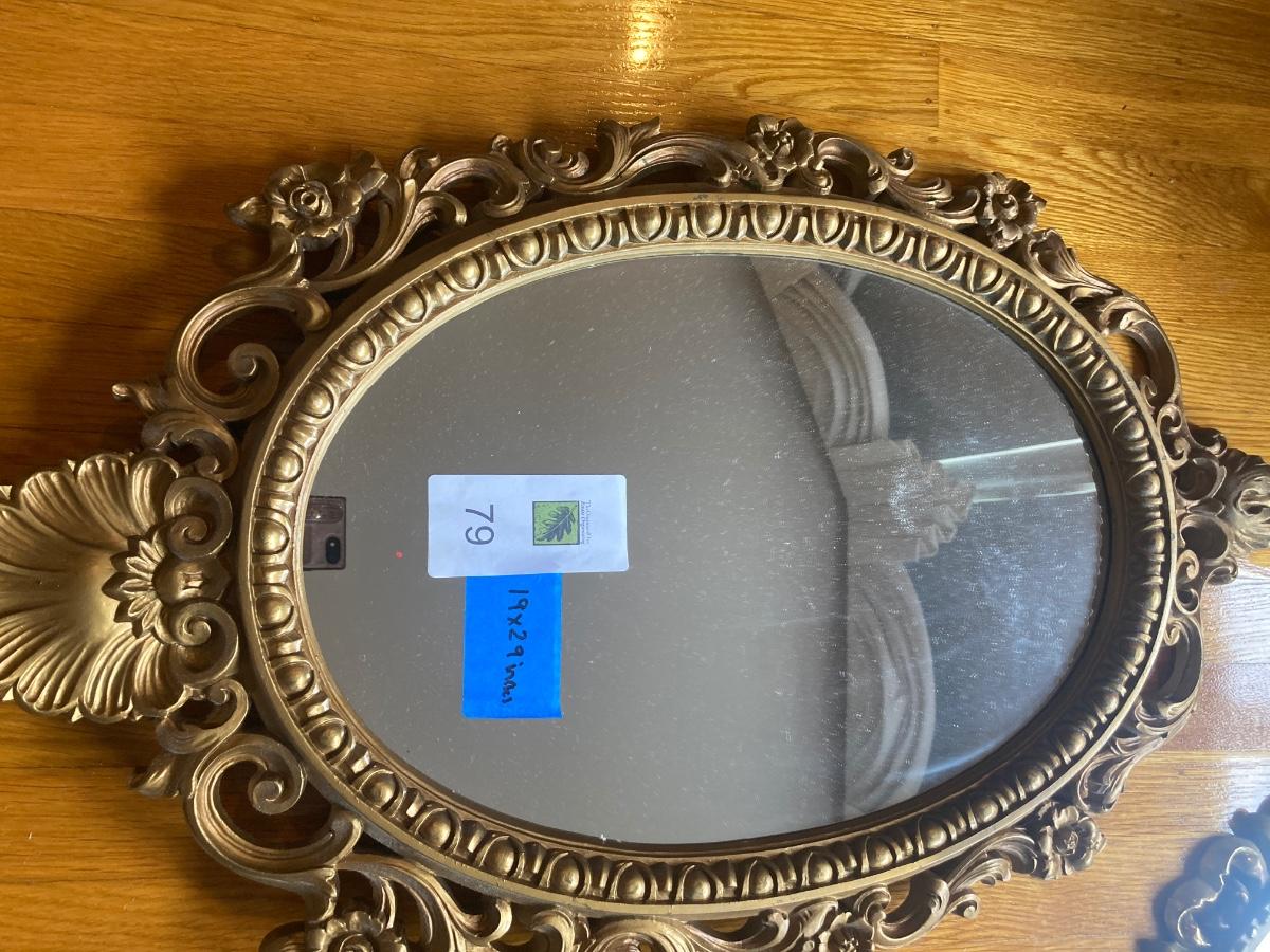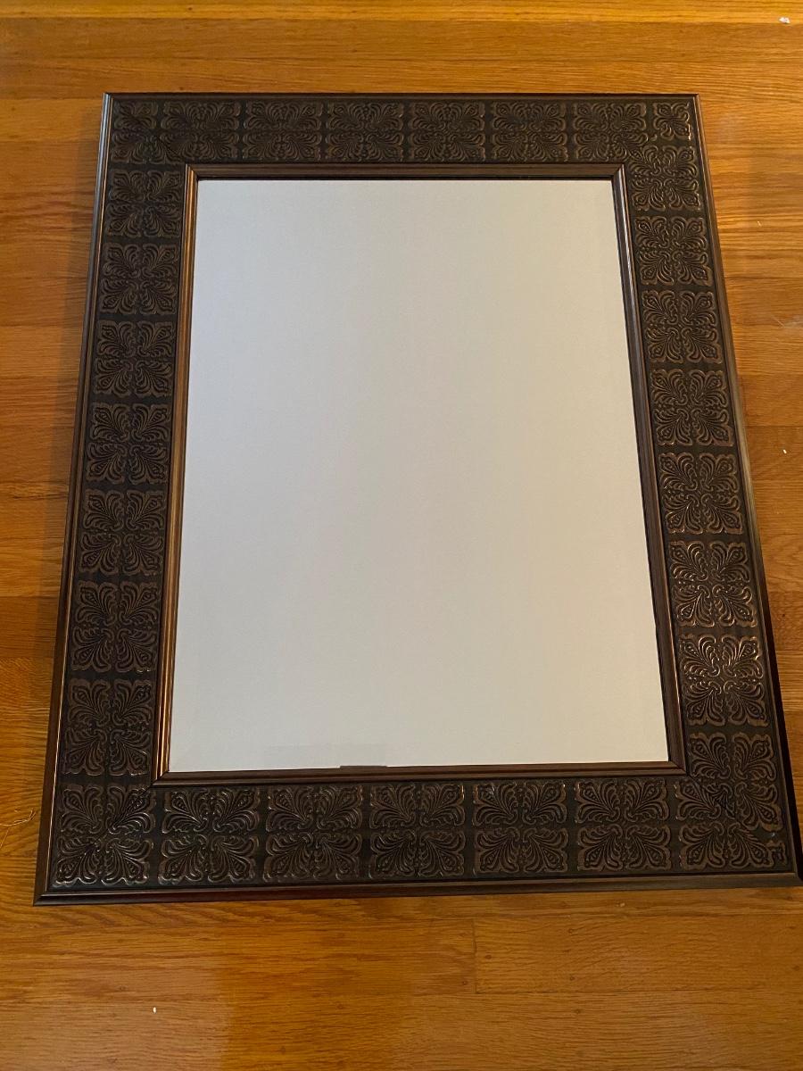 Lot consists of 2 mirrors one one composite and metal blue glazed religious motif decorative ceramic wall tile, handheld decorative mirror with 2 small matching lidded toiletry I accessories. W 19" x 29"