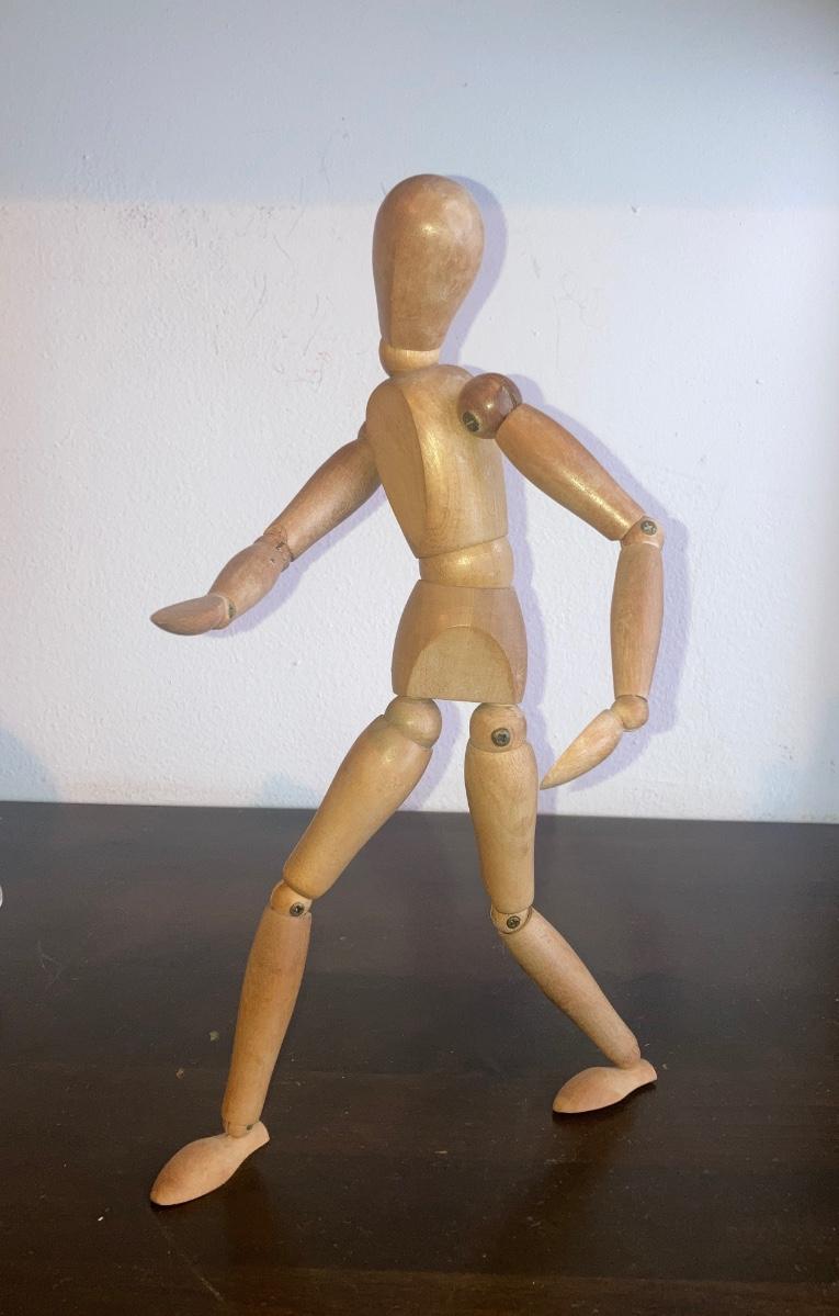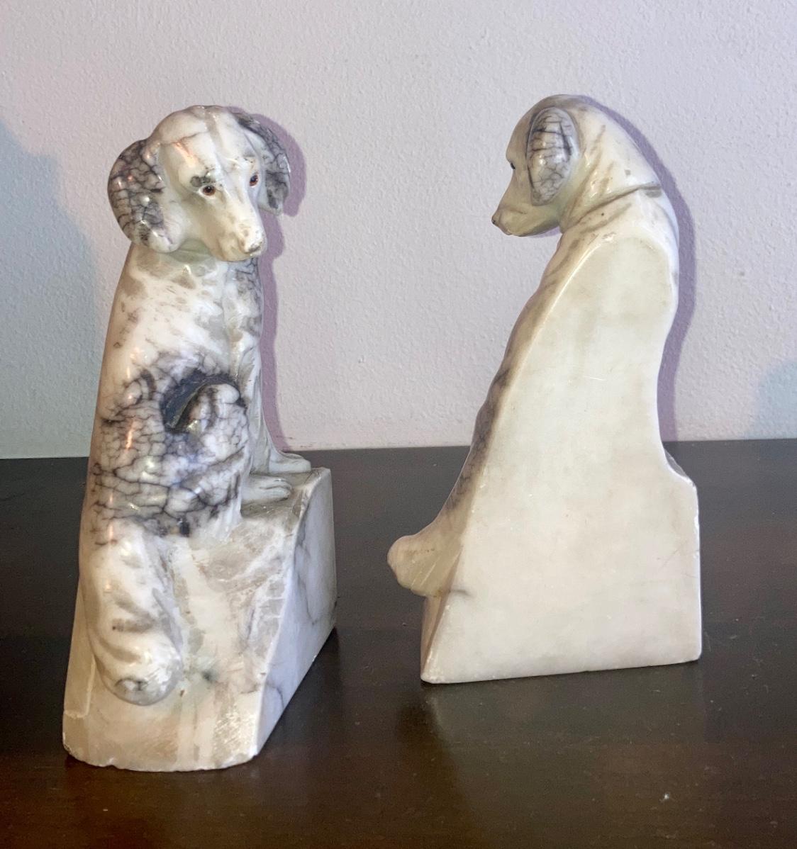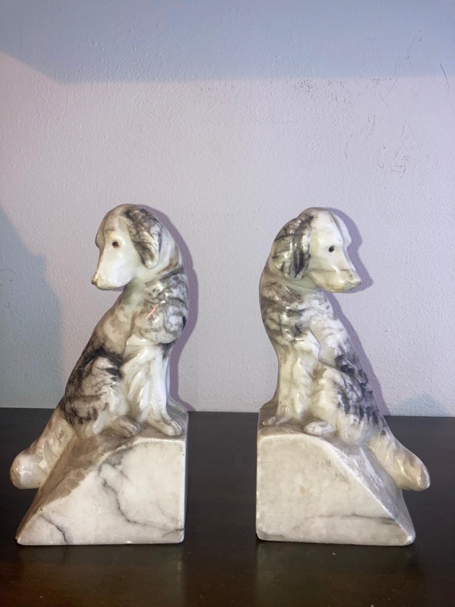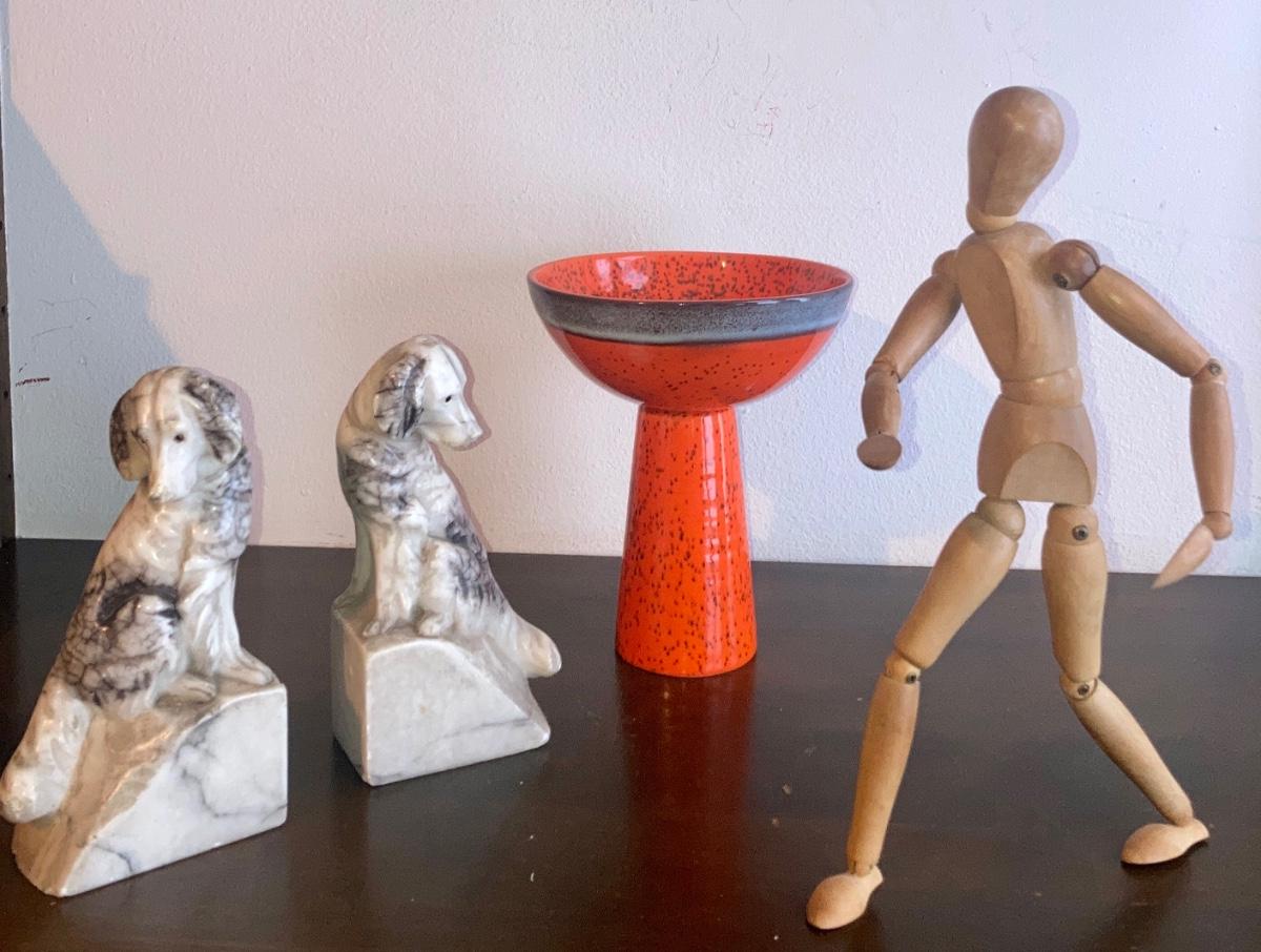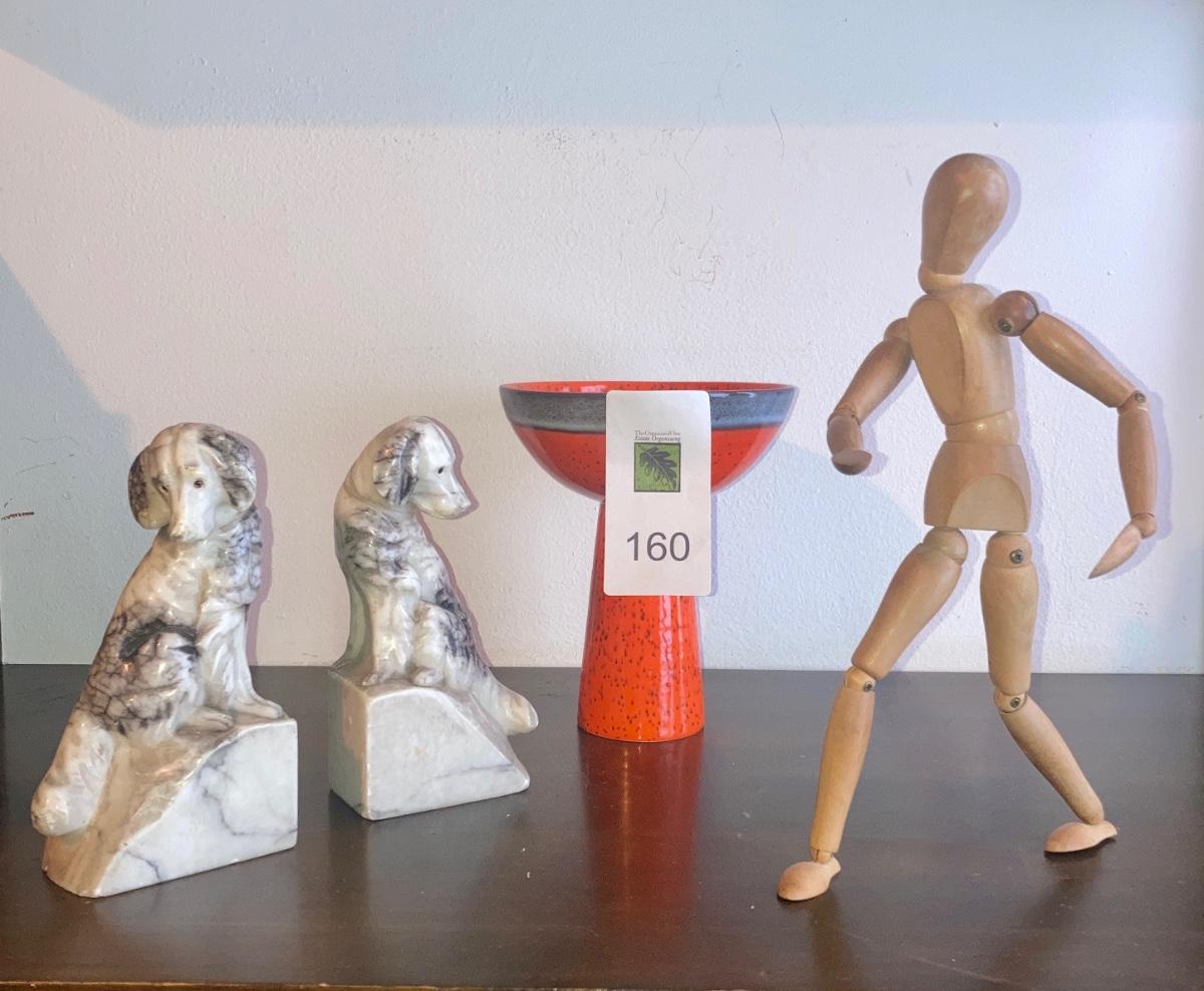 Pair of marble dog bookends, wood figure with moveable joints orange glass vase (no makers mark)