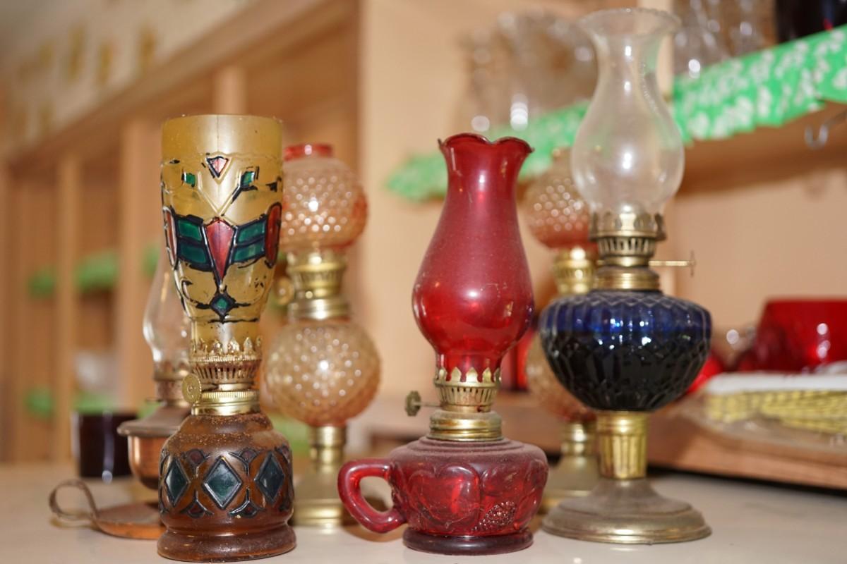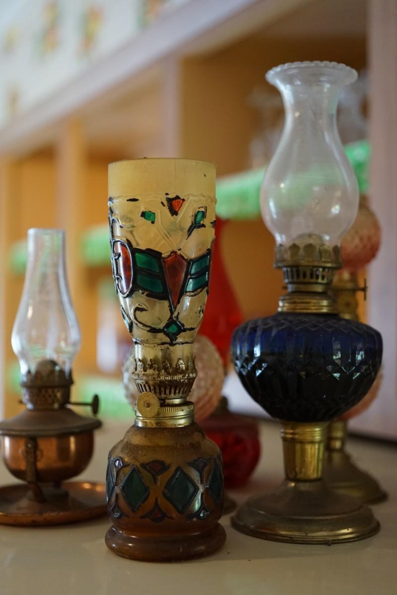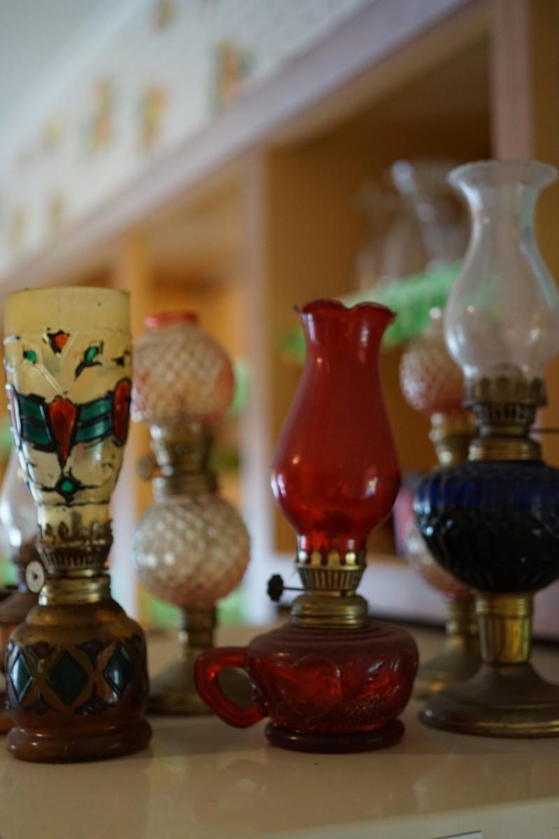 GROUPING OF FIVE 1960'S MINIATURE KEROSENE LAMPS RUBY RED, BLUE, STAINED GLASS AND MINI GWTW