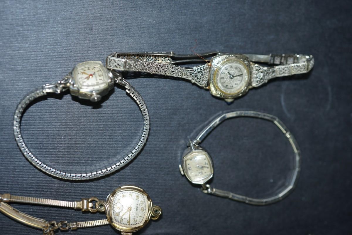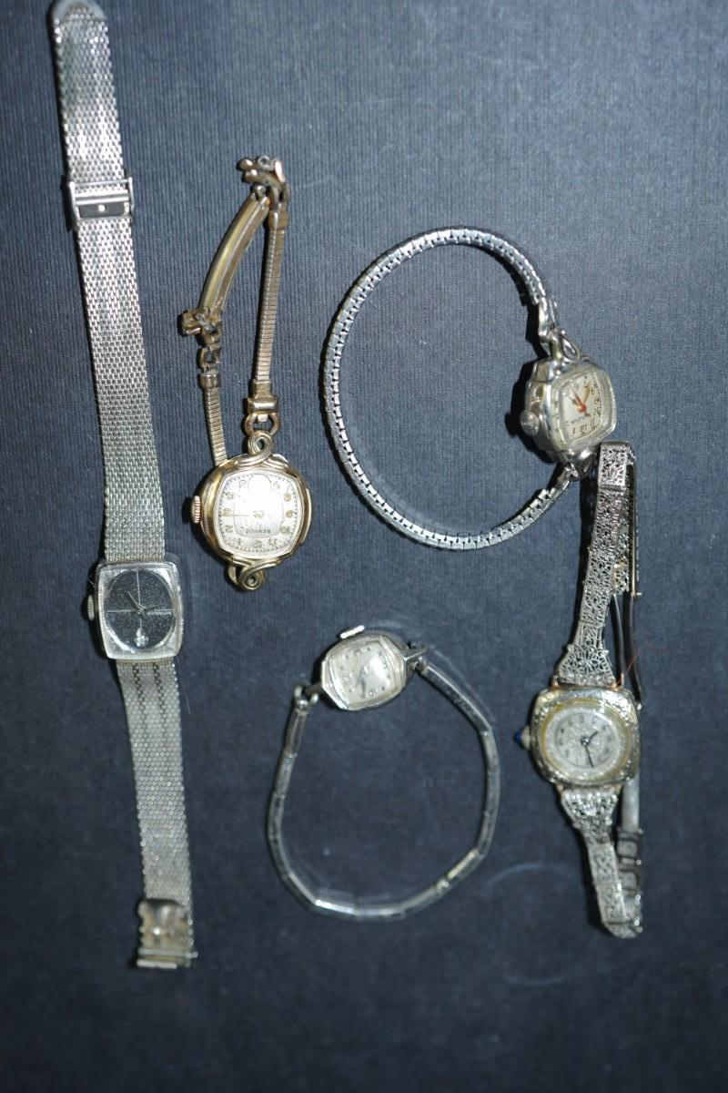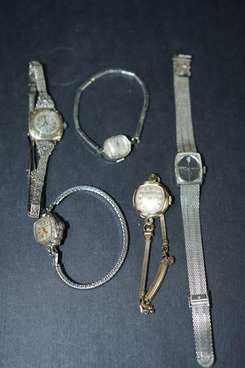 GROUPING OF FIVE LADIES VINTAGE WRIST WATCH / BULOVA, ELGIN , ART DECO FILLIGREE BAND , ROSE GOLD FILLED,