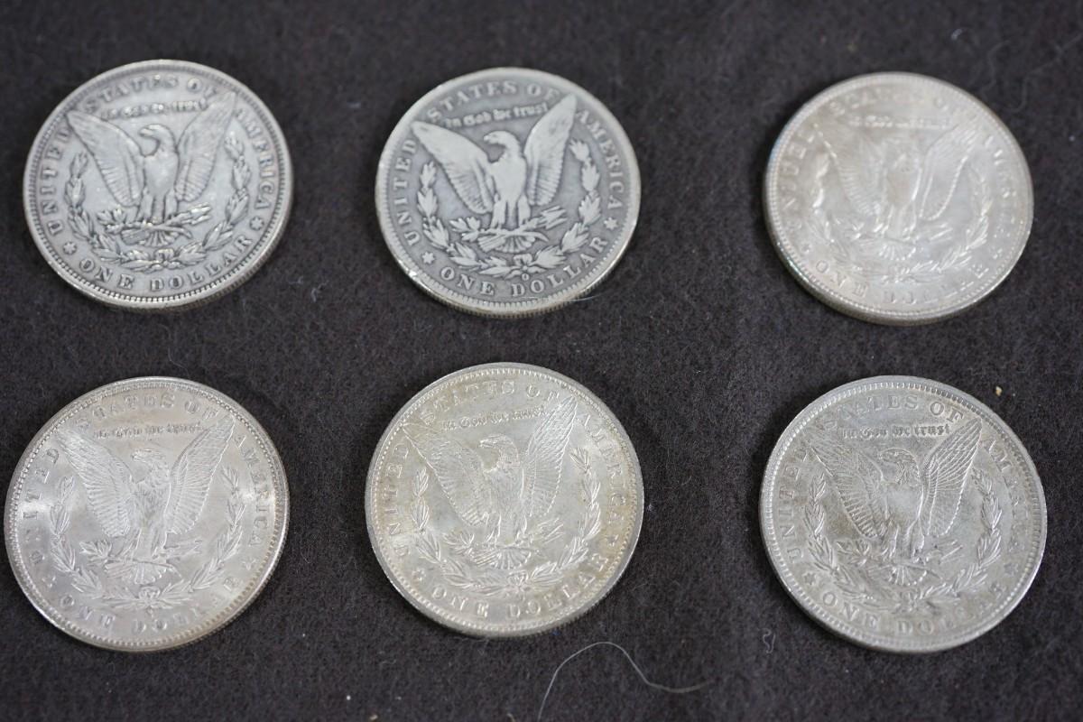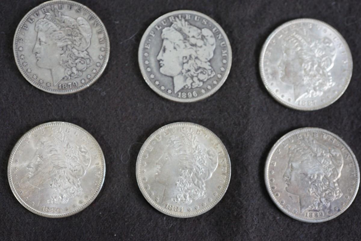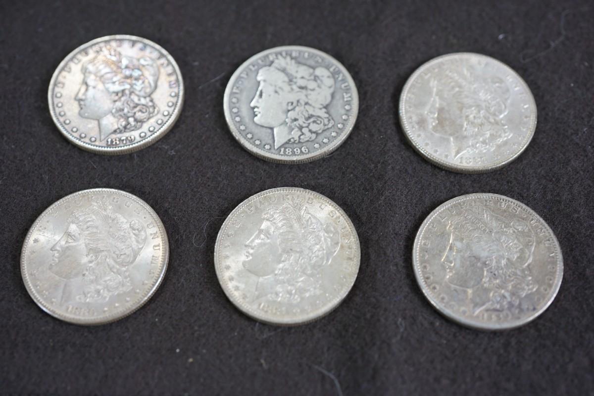 GROUPING OF SIX MORGAN DOLLARS. 1870's and 1880's dates