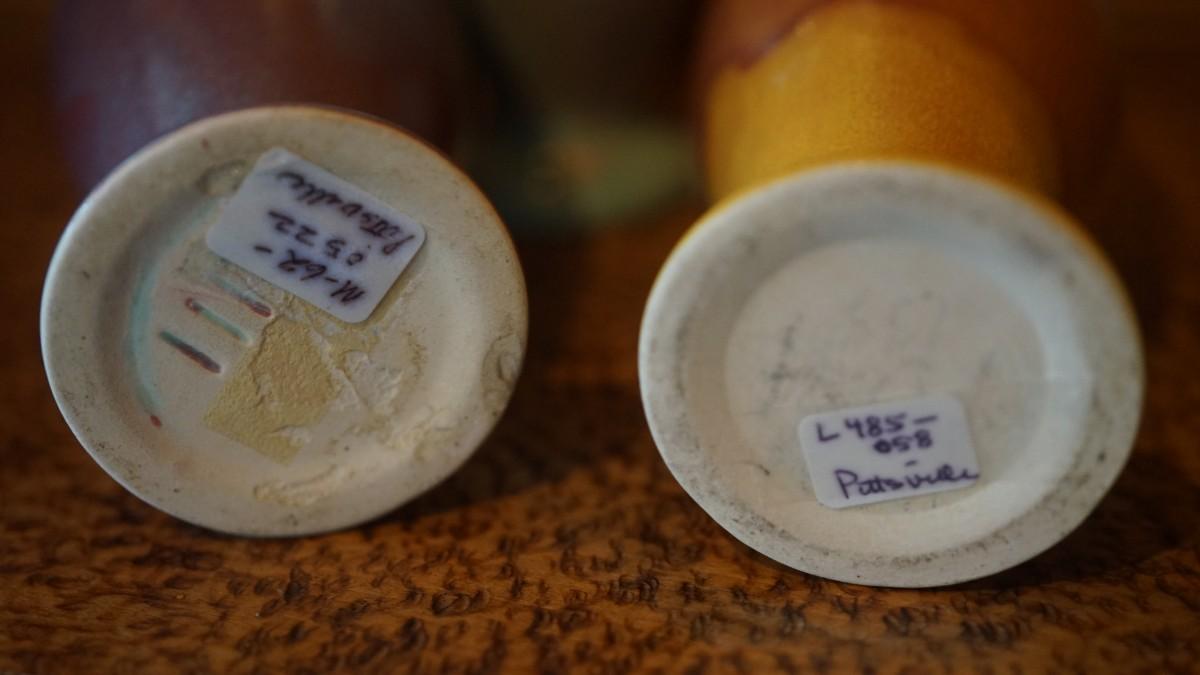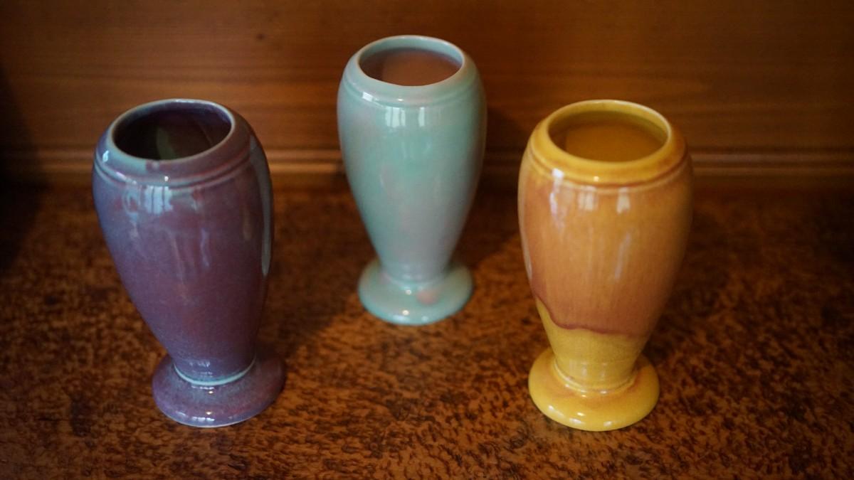 all in good condition. stamped on base one with three lines. The owner who is extremely knowledgeable about Wisconsin pottery and other pottery companies. attributed these to Pittsville. of Pittsville, WI
