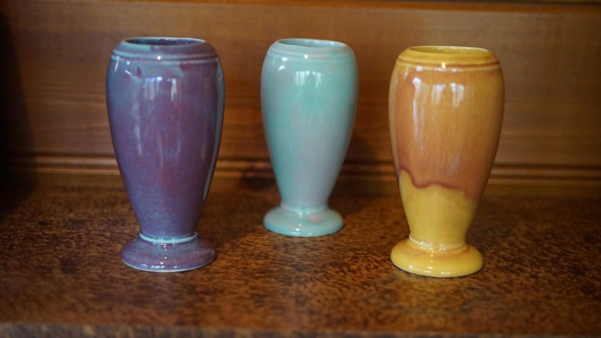 GROUPING OF FOUR 5" COLORFUL GLAZED PITTSVILLE VASES.